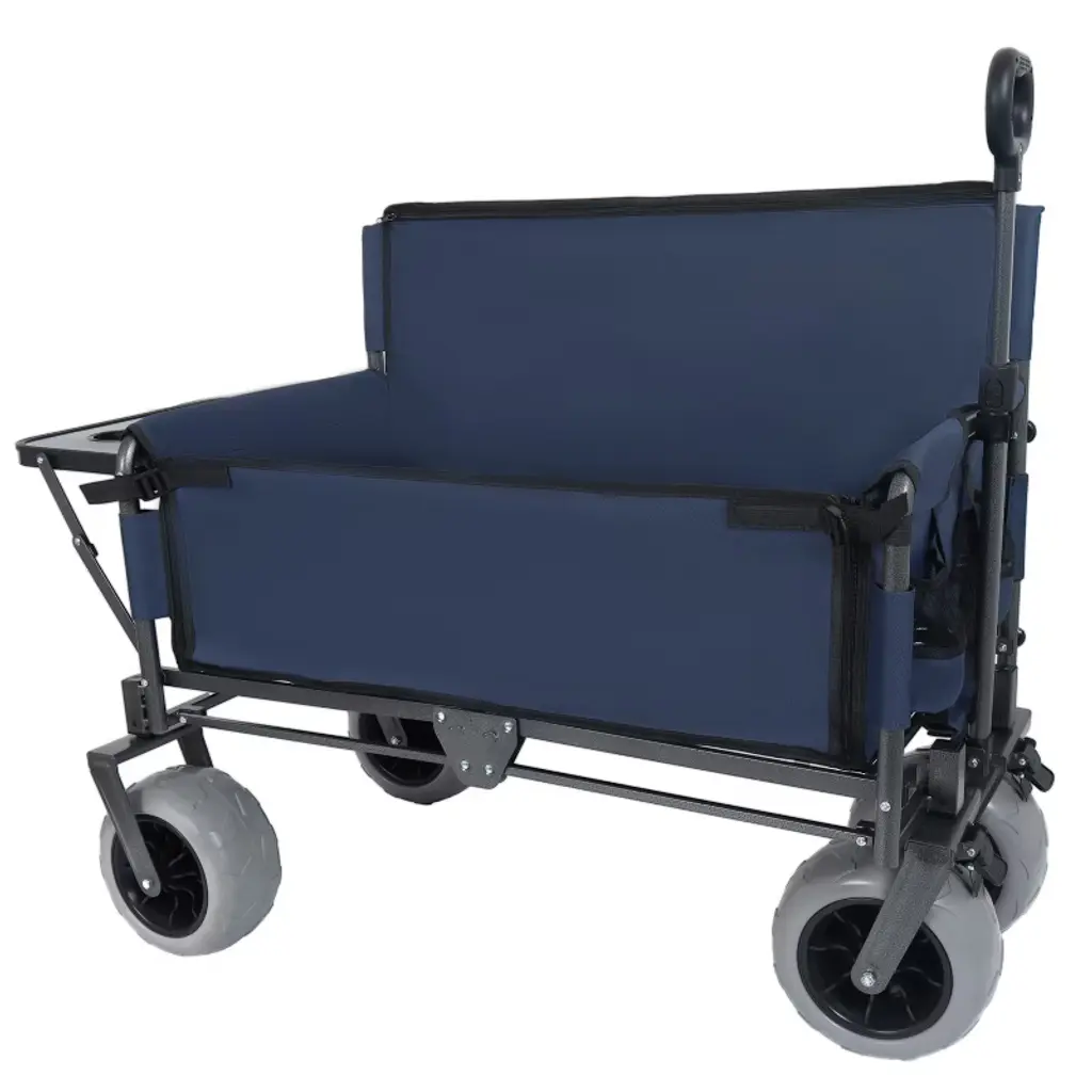 Rear-Mounted Folding Tabletop for Folding Cart/Vehicle Type:- Holds 2 Drinks!Securely attaches to the rear of your folding cart, wagon. Features a convenient folding tabletop that stows away when not needed.Integrated dual cup holders securely keep two drinks (cups, bottles, cans) upright.Perfect for keeping beverages, or small items within easy reach during transport, picnics, events, or work.Multi-Functional Seat Wagon - UNIQUE SEAT CONVERSION - Doubles as a secure seating solution with 500lb capacity. Reinforced frame and padded base safely support children or adults. Side zippers allow easy entry/exit, ideal for parks, camping, or event venues. Perfect for tired little legs, elderly companions, or impromptu seating at outdoor gatherings.All-Terrain Wheels: The cart features 9" diameter 4" wide all-terrain balloon wheels that are designed to roll smoothly over sand and other rough surfaces.Heavy-Duty Collapsible Wagon - Built with 1.2mm reinforced carbon steel frame supporting up to 500lbs. 180L (6.4 cu.ft) organized cargo space perfect for grocery hauls, apartment moves, or outdoor gear. Reduces heavy-lifting strain with secure item transportation.All-Terrain 360 Wheel System - Dual front swivel wheels enable nimble maneuvering on any surface. Equipped with double bearings for enhanced load-bearing and safety, this wagon ensures smooth transport.