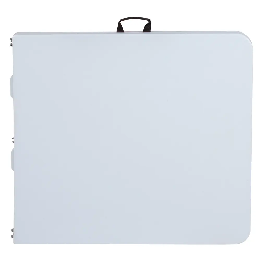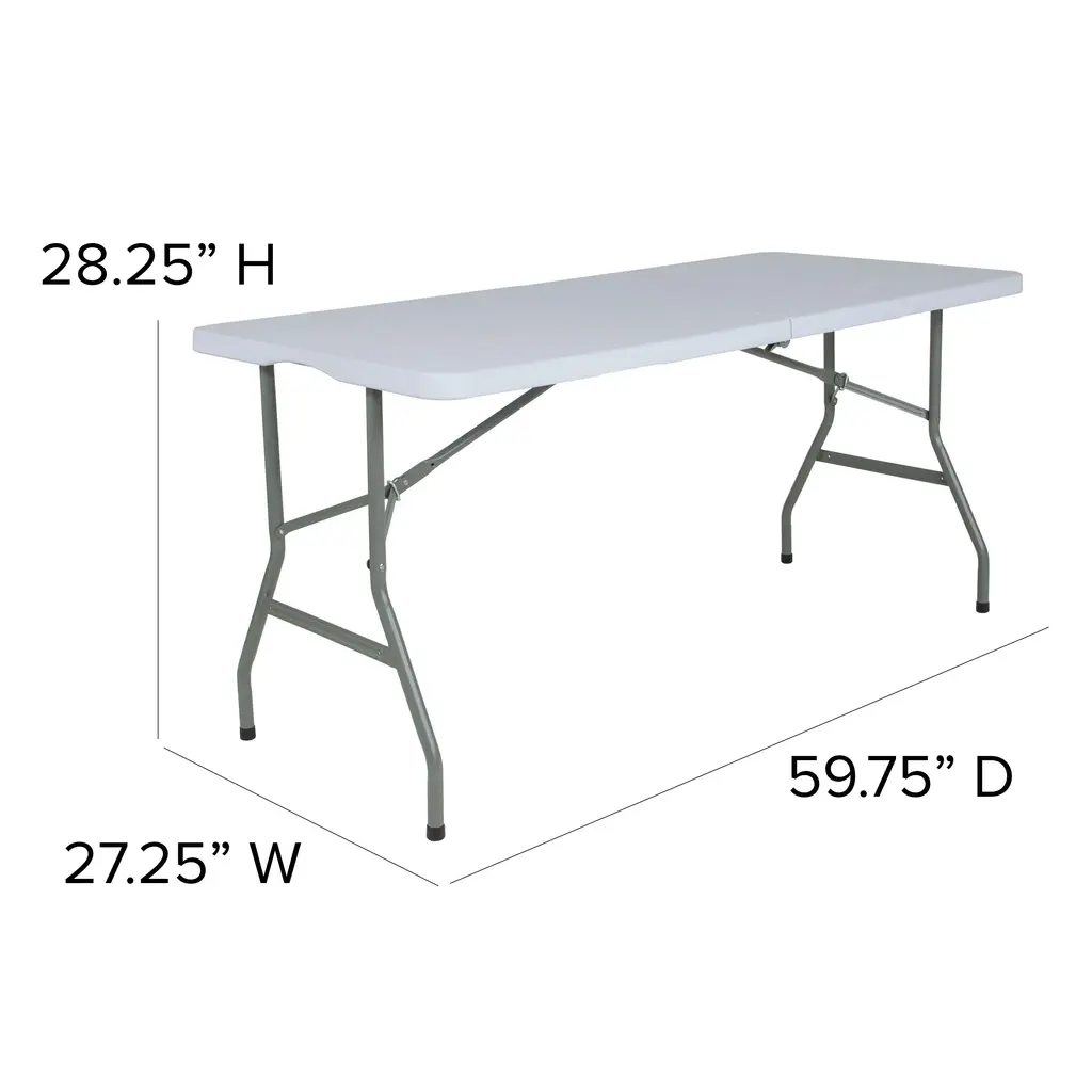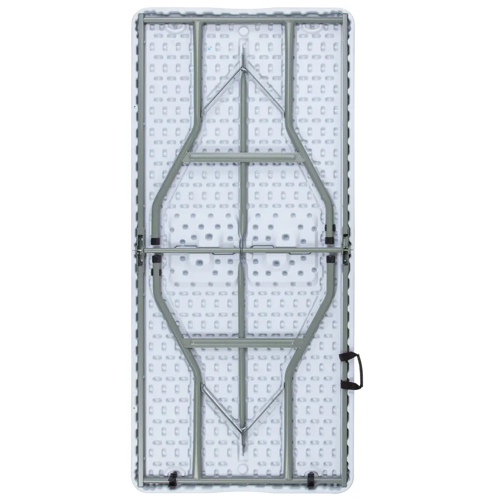 Advertise your business and products at the Expo on this portable folding table. This 4.97' long banquet table accommodates up to 6 people and seats extra guests during holiday gatherings. Built for commercial use this heavy-duty folding table makes appearances in restaurants, warehouses, schools, churches and rec centers. Folding tables can be used for all your sit-down activities and their legs lock when folded for storage. This versatile centerfold table can be dressed up during holiday events and parties. If you have hard flooring at your banquet hall the floor caps prevent scratches and glide smoothly across floors. Easy to clean and store, plastic folding tables are the best option for any occasion. Although designed for indoor events this party table can be used outdoors on the patio during good weather but must be stored indoors. Get your ready to use rectangular folding table for your home or business today.