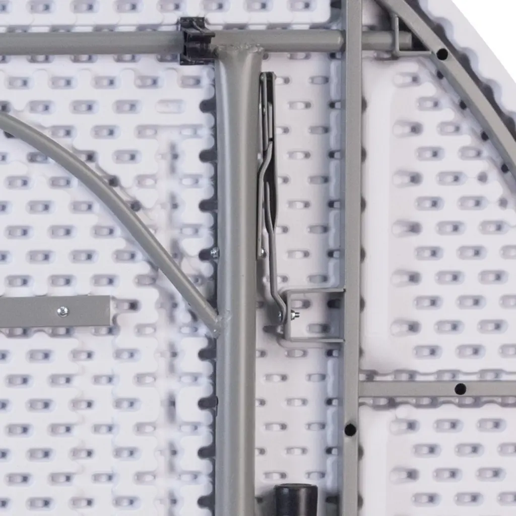 The bi-fold round dining folding table is a great option for special event planners, catering companies and banquet facilities. This durable, easy to clean table is commercial rated for use in banquet halls, convention centers and at trade shows. Use during game night, dress it up for holiday parties, and coordinate crafts night. The tabletop is 5.9' in diameter, 2" thick, and will comfortably seat up to 10 adults. Its waterproof, impact and stain resistant top has a 440 pound static load capacity. Attractive gray powder coated legs lock securely in place while in use and non-marring floor caps protect your floor by sliding smoothly when you need to move the table. The table folds in half, making it easy to store and transport, using the convenient carrying handle attached on the side. The 71" Round Bi-Fold Plastic Banquet and Event Folding Table with Carrying Handle is a convenient option for your next home, school or business event. When using for outdoor events store indoors to protect the frame from extreme moisture.