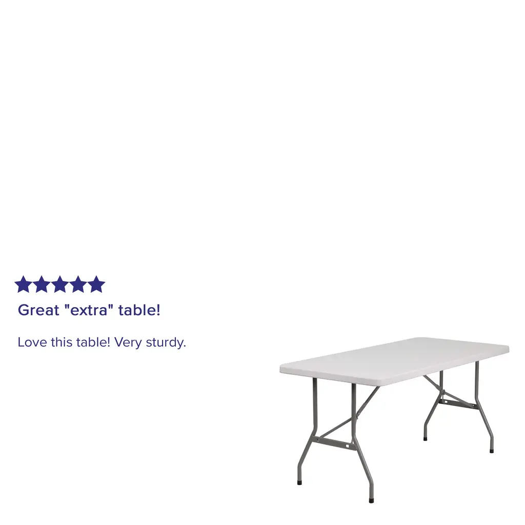This rectangular folding table is 5 feet long and is beneficial in a multitude of settings that include banquet halls, conference centers, cafeterias, schools and in the home. The table can be used as a temporary seating solution or be setup for everyday use. The durable blow molded top is low maintenance and cleans easily. The table legs fold under the table to make storage more convenient and for better portability. This table is commercial grade to withstand everyday use in the hospitality industry.