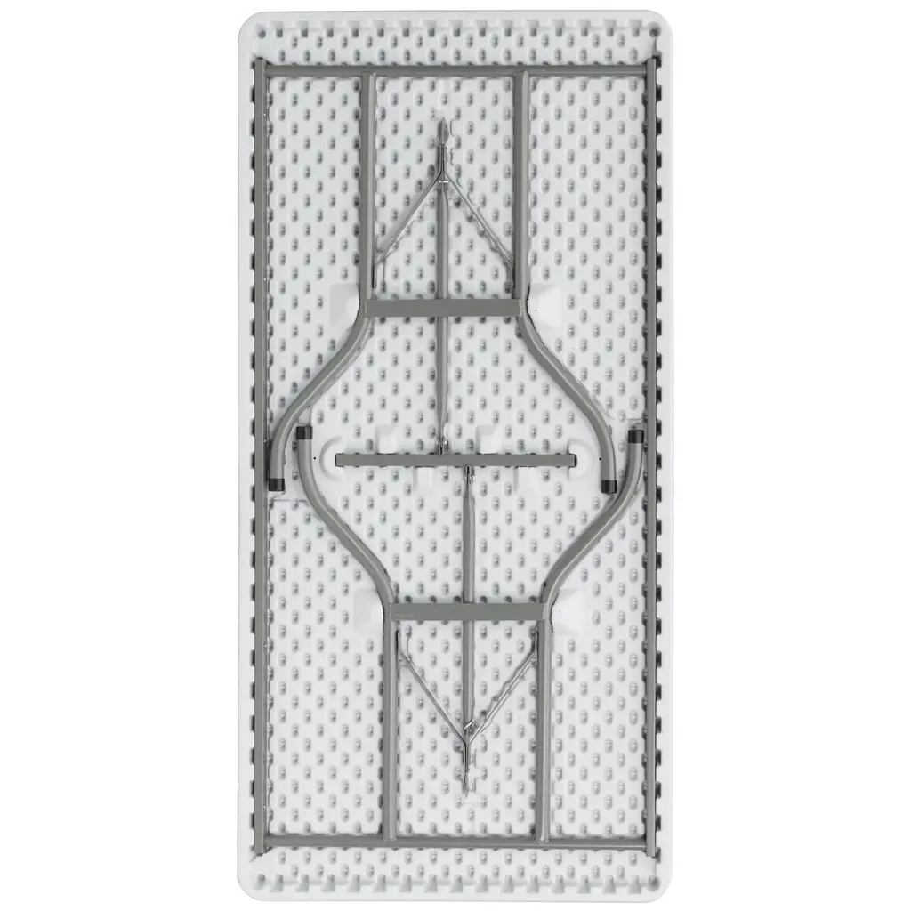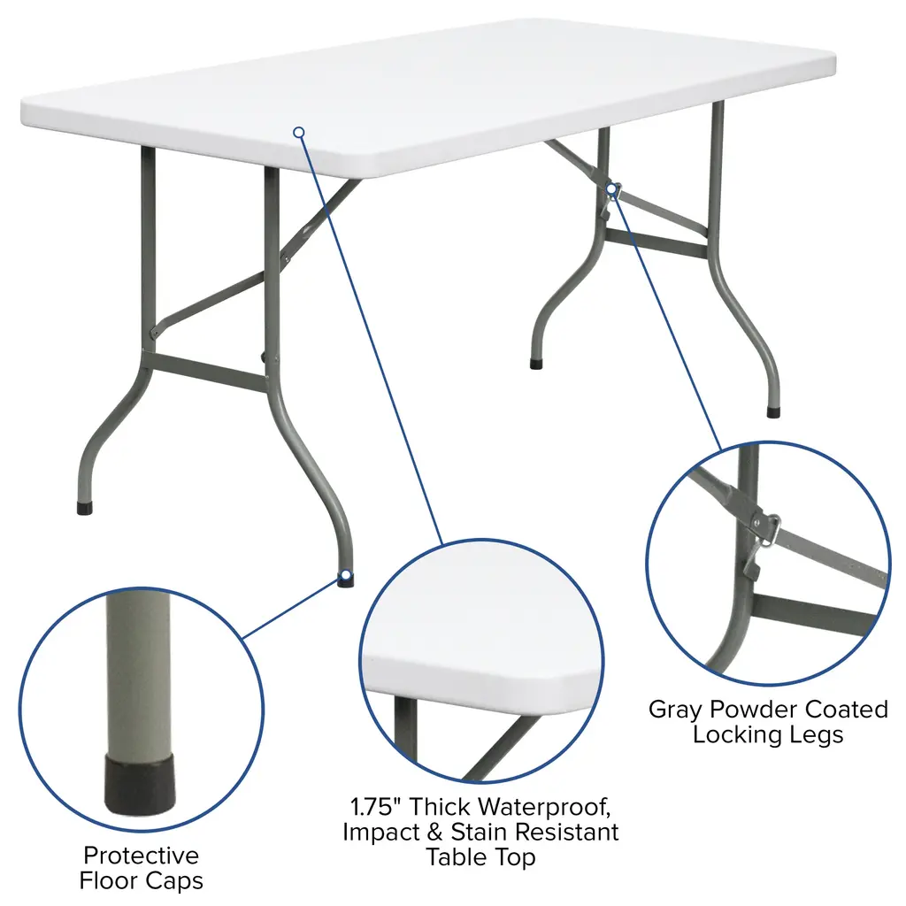 This rectangular folding table is 5 feet long and is beneficial in a multitude of settings that include banquet halls, conference centers, cafeterias, schools and in the home. The table can be used as a temporary seating solution or be setup for everyday use. The durable blow molded top is low maintenance and cleans easily. The table legs fold under the table to make storage more convenient and for better portability. This table is commercial grade to withstand everyday use in the hospitality industry.