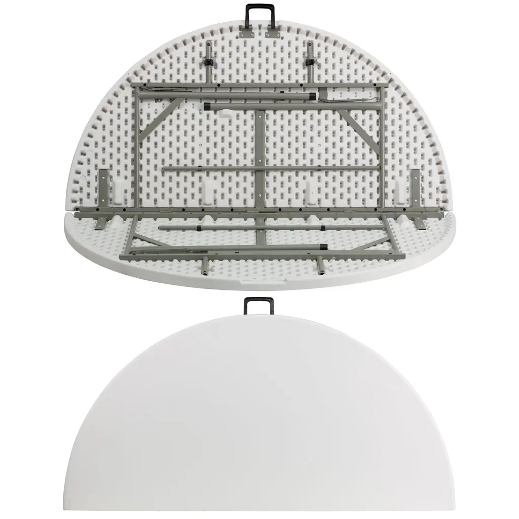 Simple and durable, this folding table is beneficial in a variety of settings, including conferences, corporate events, school cafeterias, banquet halls and at home. Suitable for a range of activities, our folding table has a design that stands up to general wear and tear in any setting. This plastic folding table comfortably seats up to six adults while ensuring plenty of legroom. With a load capacity of 551 pounds, this plastic folding table folds in half and features a built-in carrying handle on the side for easy transportation. Our five-foot folding table is waterproof and stain- and impact-resistant to ensure long-lasting use. Its thick tabletop looks attractive as-is or can be easily dressed up with a tablecloth to achieve a custom look. Speed up the time it takes to set-up and tear-down wedding receptions, graduation parties, banquets, buffets and other events with this round folding table. Whether you're hosting an indoor or outdoor gathering, the smooth design is easy to wipe clean. When using for outdoor events store indoors to protect the frame from extreme moisture. Non-marring floor caps protect your floors against scratches while ensuring extra stability on uneven surfaces. Use this folding table for special events or on a regular basis to suit your needs.