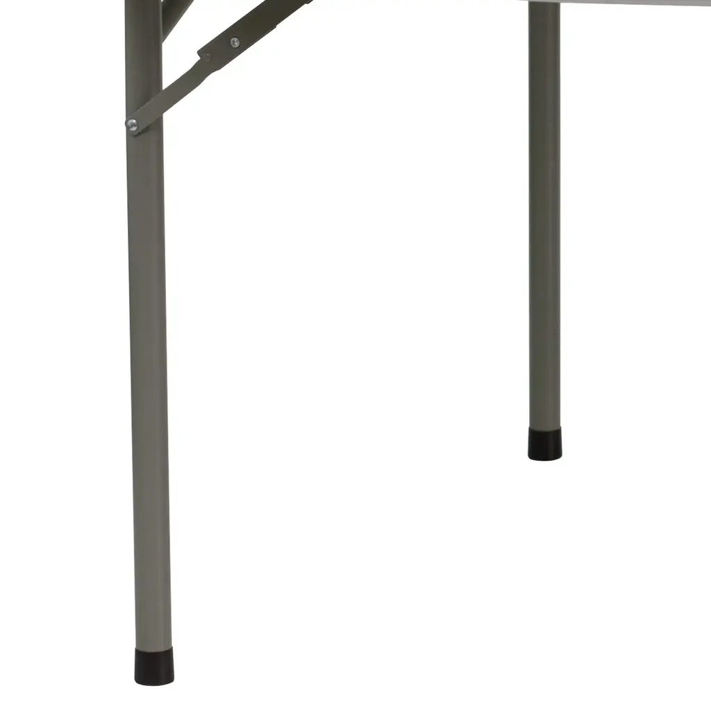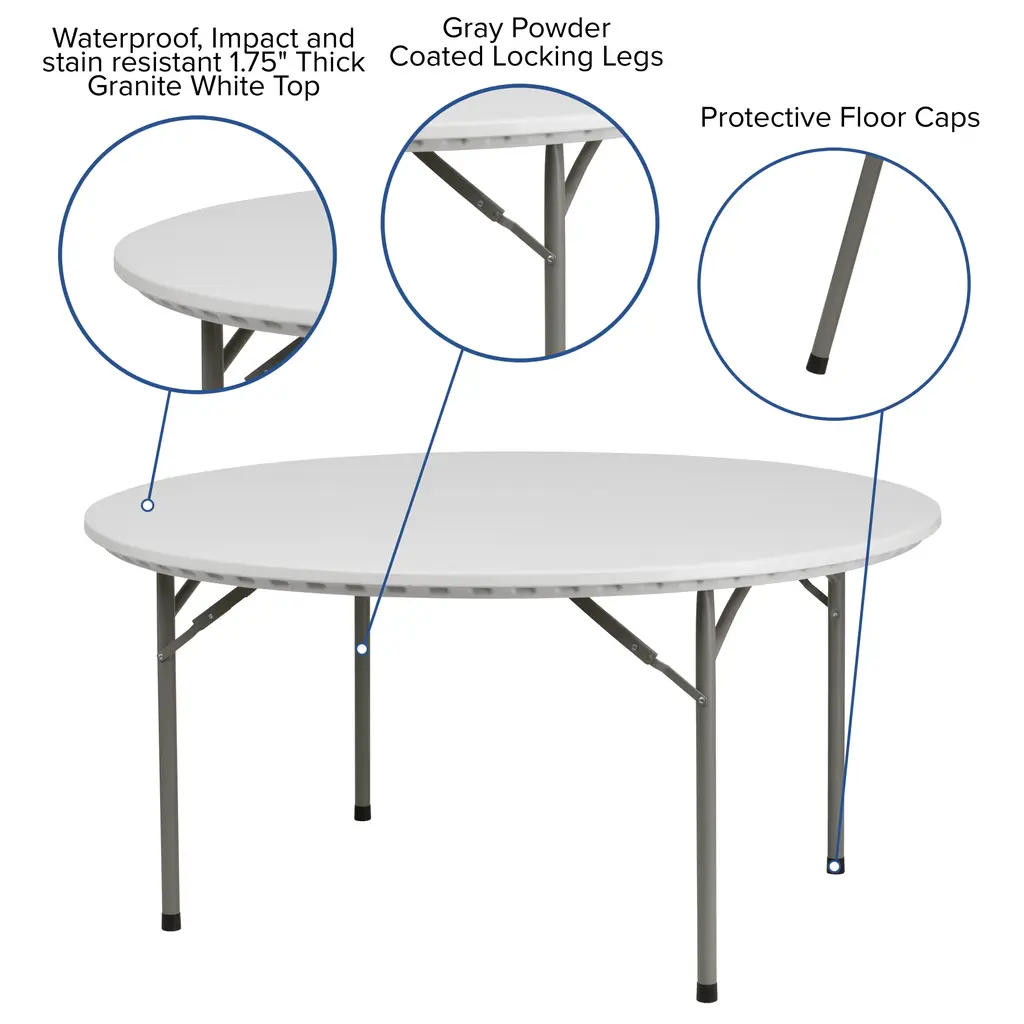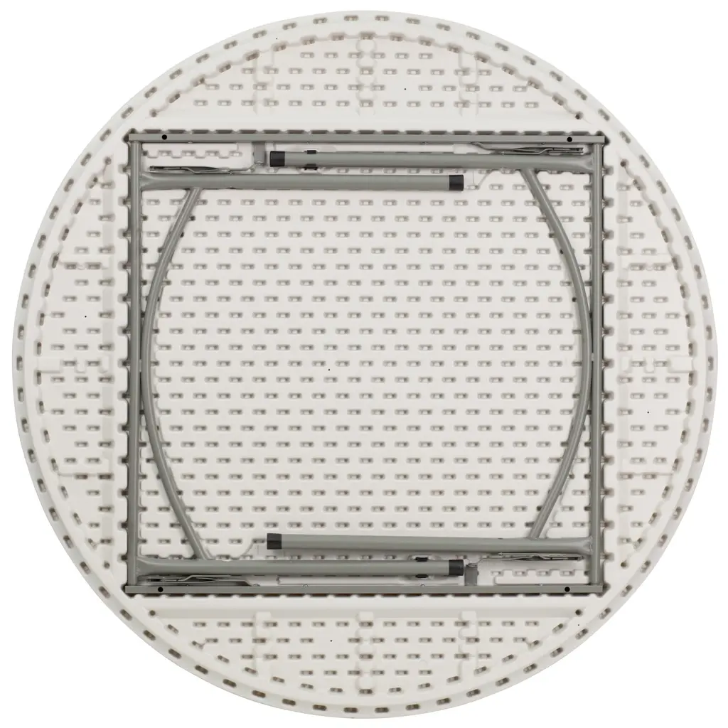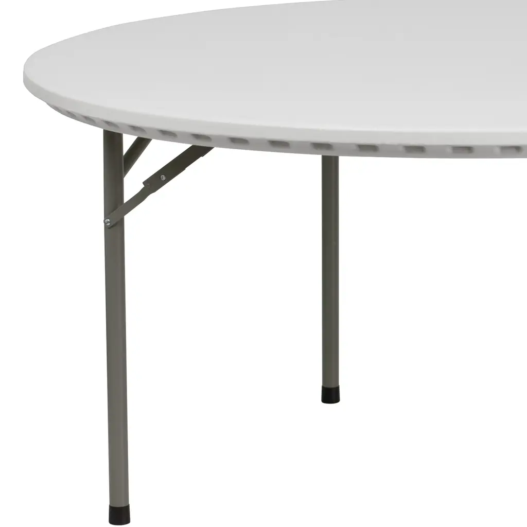 This round folding table is 5 feet long and is beneficial in a multitude of settings that include banquet halls, conference centers, cafeterias, schools and in the home. The table can be used as a temporary seating solution or be setup for everyday use. The durable blow molded top is low maintenance and cleans easily. The table legs fold under the table to make storage more convenient and for better portability. This table is commercial grade to withstand everyday use in the hospitality industry.