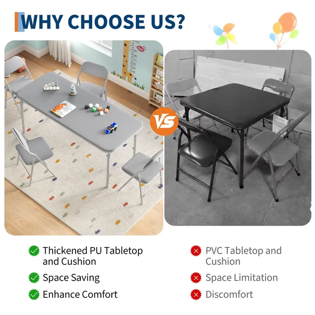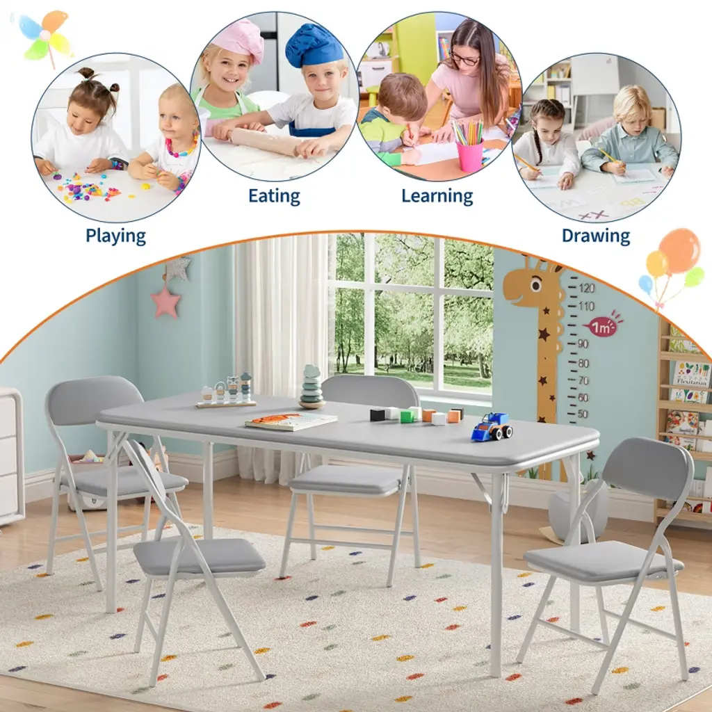 Product DescriptionThe table and chairs adopt thoughtful rounded corner design, and the table legs, chair backs and edges are polished into smooth arcs to prevent from bumping and scratching; the folding joints have a built-in anti-pinch finger structure, which is smooth to operate, stable and safe, and parents can feel more at ease.Product informationSize: Table: 47.24 x 20.08 x 19.88 inches Chair: 12.6 x 12.6 x 21.73 inches Item Weight: 45.19 pounds Material: Metal + PUColor: Beige / Black / Grey / YellowPacking List:1 x Table4 x Chairs