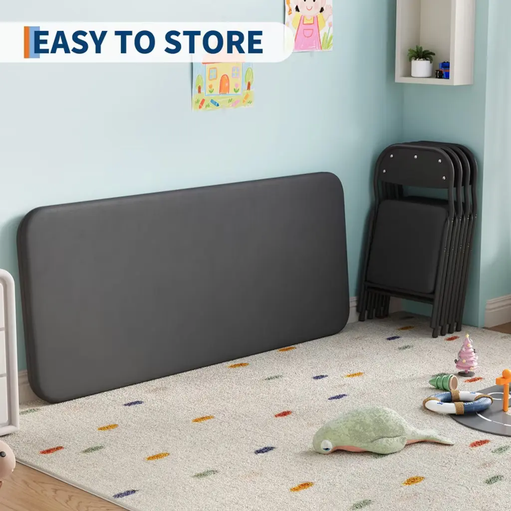 Introducing the 5-Piece Kids Folding Table and Chairs Set, a perfect solution for toddlers and young children to enjoy their activities comfortably and safely. This versatile set includes a folding table and four folding chairs, designed specifically for kids. The wide back folding chairs provide excellent support and comfort, making them ideal for extended use during playtime, study, or dining.Crafted with a sturdy iron frame, each chair ensures durability and stability, while the sponge PU seat offers a soft and cozy sitting experience. The foldable design allows for easy storage and portability, making this set perfect for use at home, daycare centers, classrooms, or any children's activity space.Key Features:- Wide back folding chairs designed for optimal comfort and support for children- Durable iron frame construction ensures long-lasting use- Soft sponge PU seat cushions provide a comfortable seating experience- Foldable design for easy storage and transport- Ideal for dining rooms, classrooms, daycare centers, and playroomsThis kids folding chair set is not only practical but also stylish, blending seamlessly into any environment. Its compact foldable nature saves space and makes it easy to move around as needed. Whether your child is eating, drawing, or engaging in educational activities, this set offers a safe and comfortable seating solution.Invest in this 5-Piece Kids Folding Table and Chairs Set to create a fun, functional, and organized space for your little ones. Perfect for parents and educators looking for quality, convenience, and child-friendly design in one package.