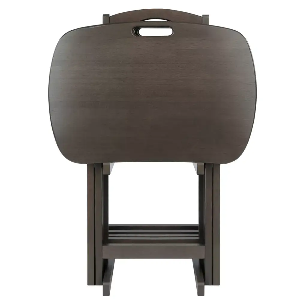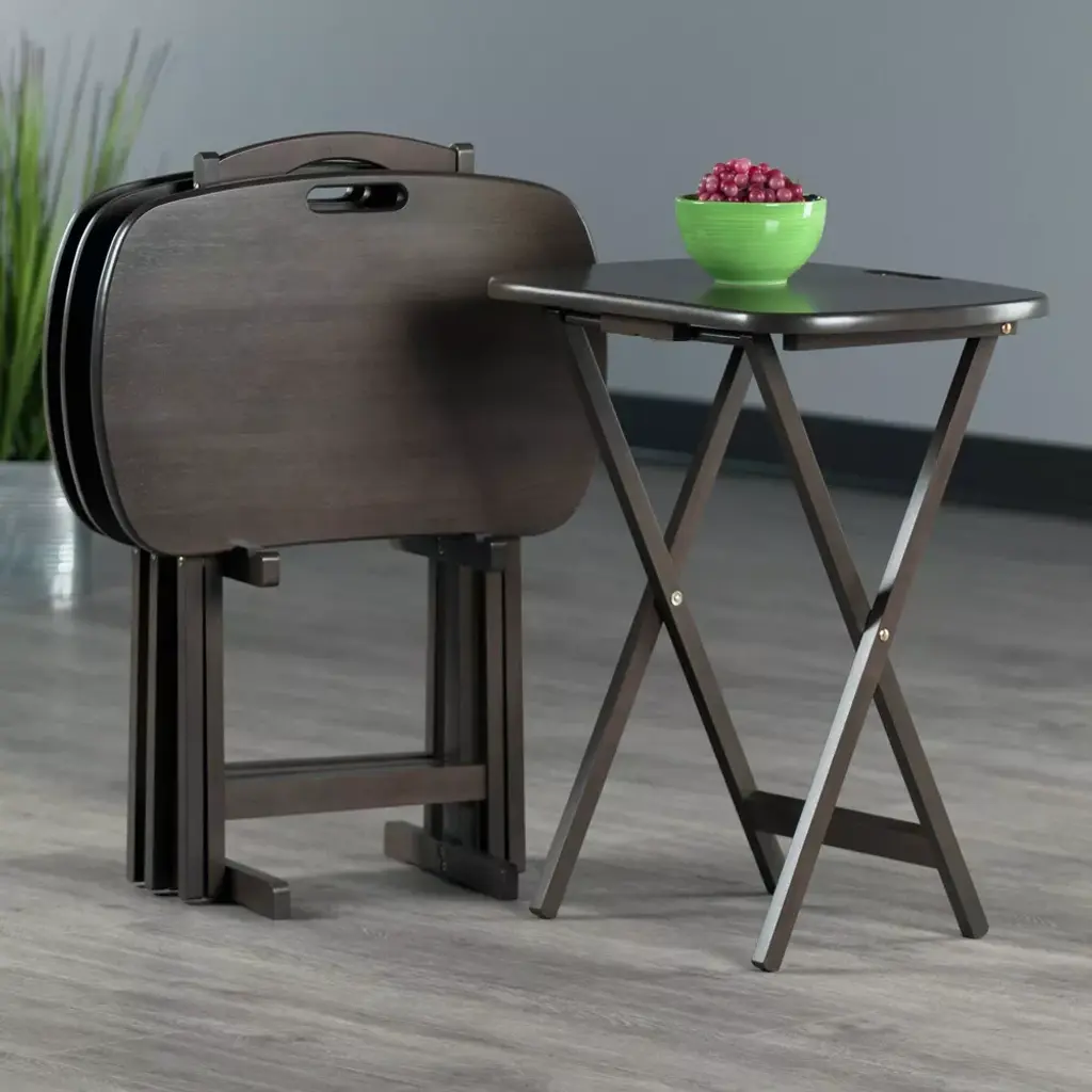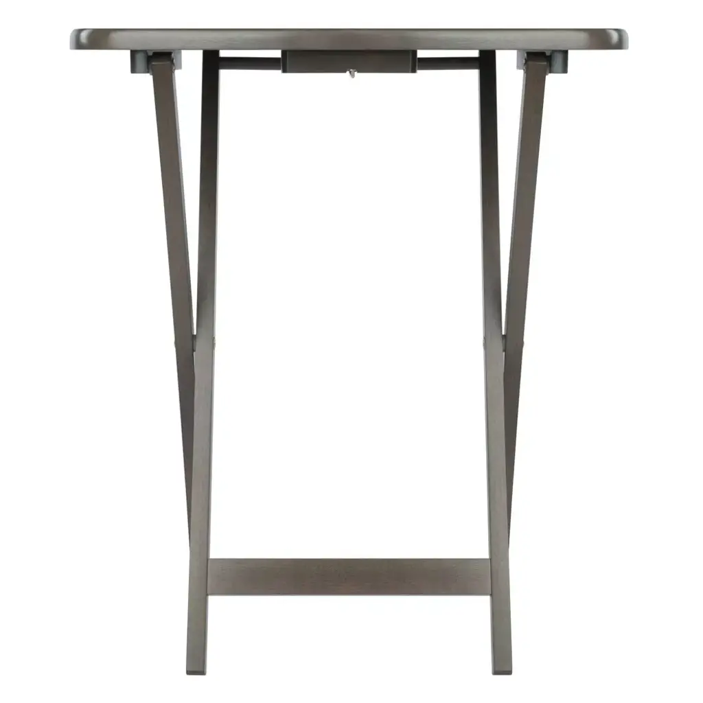 Make entertaining simple and easy with the Winsome Wood Lucca 5-Piece TV Table Set. A perfect companion piece for a casual meal in front of the TV or on the patio. Four folding snack tables great for daily use and compact enough to store in the closet. An upright stand is an innovative addition to this set as it serves as a rack to store the folded tables discretely when not in use. These beautifully finished trays are convenient and make meal serving simple when you need it. The wide 22.8” oblong portable folding TV table set provides users easy handling so they can lift the trays off the stand using the cutout handles in the table. You can move them closer to a sofa, chair or even into a different room. Winsome TV tables are ideal for small apartments, dorms and offices. They can also be used to prop up a laptop, play cards or other board games, apply nail polish or sort coupons. These light weight tables are portable and practical, fold up and place back on the stand for compact storage. Notches on the stand keep the folded tables securely in place. With its many uses and advantages, the Lucca 5-Piece TV Table Set is a piece of furniture you'll appreciate and be glad you own. Constructed of solid and composite wood in a contemporary oyster gray finish. Conveniently packed and shipped in 1 box, that includes the hardware necessary for assembling the stand. Tables arrive ready to use. Replacement part request can be submitted directly to the manufacturer within 60 days from date of purchase.Size of stand with trays loaded: 22.8""W x 11.9""D x 31.3""HSize of open snack tray: 22.8""W x 15.6""D x 25.7""H Folded tray: 22.8""W x 1.7""D x 29.4""H Stand only: 12.2""W x 11.9""D x 31.3""H Static weight capacity 25 lbs. per trayStand requires assembly Snack Trays are fully assembledShips in 1 box