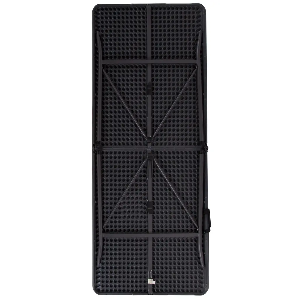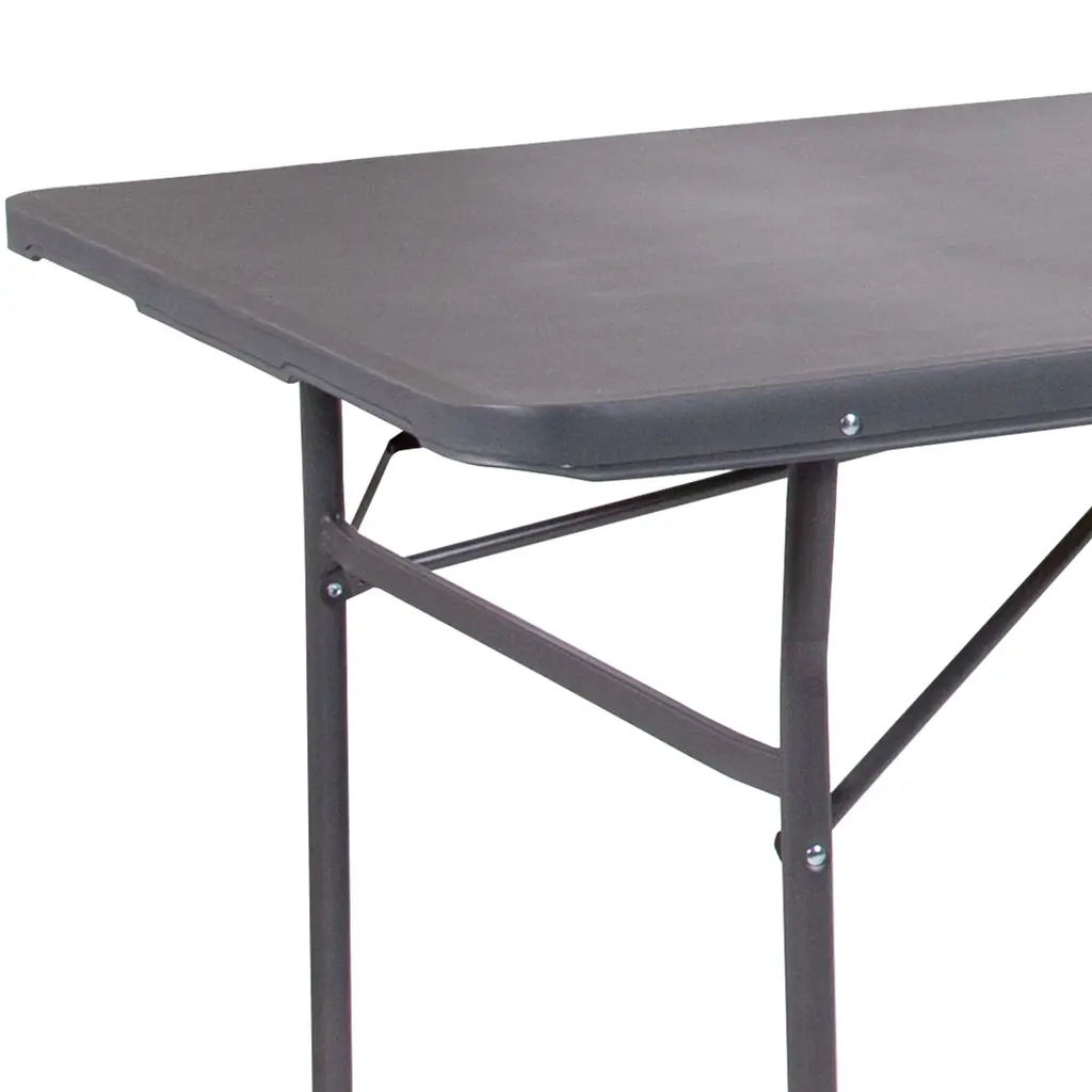 This bi-fold plastic folding table is a great option when you need a temporary dining surface or an everyday workstation in your home or office. This versatile folding table can be dressed up during holiday events, parties and arts and craft activities. Place multiple tables side by side or in rows to accommodate large party events. The waterproof, impact and stain resistant top has a 330 pound static load capacity and is commercial rated for use as a training table, in banquet halls and at trade shows. The tabletop is 6' long, 1.75" thick, and will seat up to 8 adults. Attractive gray powder coated legs lock securely in place while in use and non-marring floor caps protect your floor by sliding smoothly when you need to move the table. This durable, easy to clean table folds in half, making it easy to store and transport, using the convenient carrying handle attached on the side. The 30"W x 72"L Bi-Fold Plastic Banquet and Event Folding Table with Carrying Handle is perfect for in-home events or on the deck or patio while entertaining during a barbeque. After your outdoor event, store the table indoors to protect the frame from extreme moisture. Rectangular folding tables offer the best solution for your home or business.