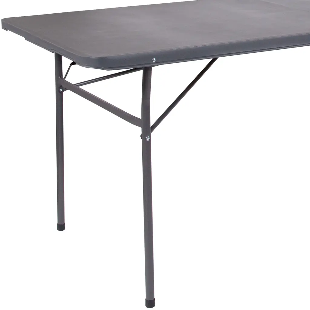 This bi-fold plastic folding table is a great option when you need a temporary dining surface or an everyday workstation in your home or office. This versatile folding table can be dressed up during holiday events, parties and arts and craft activities. Place multiple tables side by side or in rows to accommodate large party events. The waterproof, impact and stain resistant top has a 330 pound static load capacity and is commercial rated for use as a training table, in banquet halls and at trade shows. The tabletop is 6' long, 1.75" thick, and will seat up to 8 adults. Attractive gray powder coated legs lock securely in place while in use and non-marring floor caps protect your floor by sliding smoothly when you need to move the table. This durable, easy to clean table folds in half, making it easy to store and transport, using the convenient carrying handle attached on the side. The 30"W x 72"L Bi-Fold Plastic Banquet and Event Folding Table with Carrying Handle is perfect for in-home events or on the deck or patio while entertaining during a barbeque. After your outdoor event, store the table indoors to protect the frame from extreme moisture. Rectangular folding tables offer the best solution for your home or business.