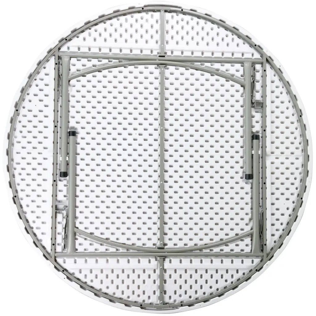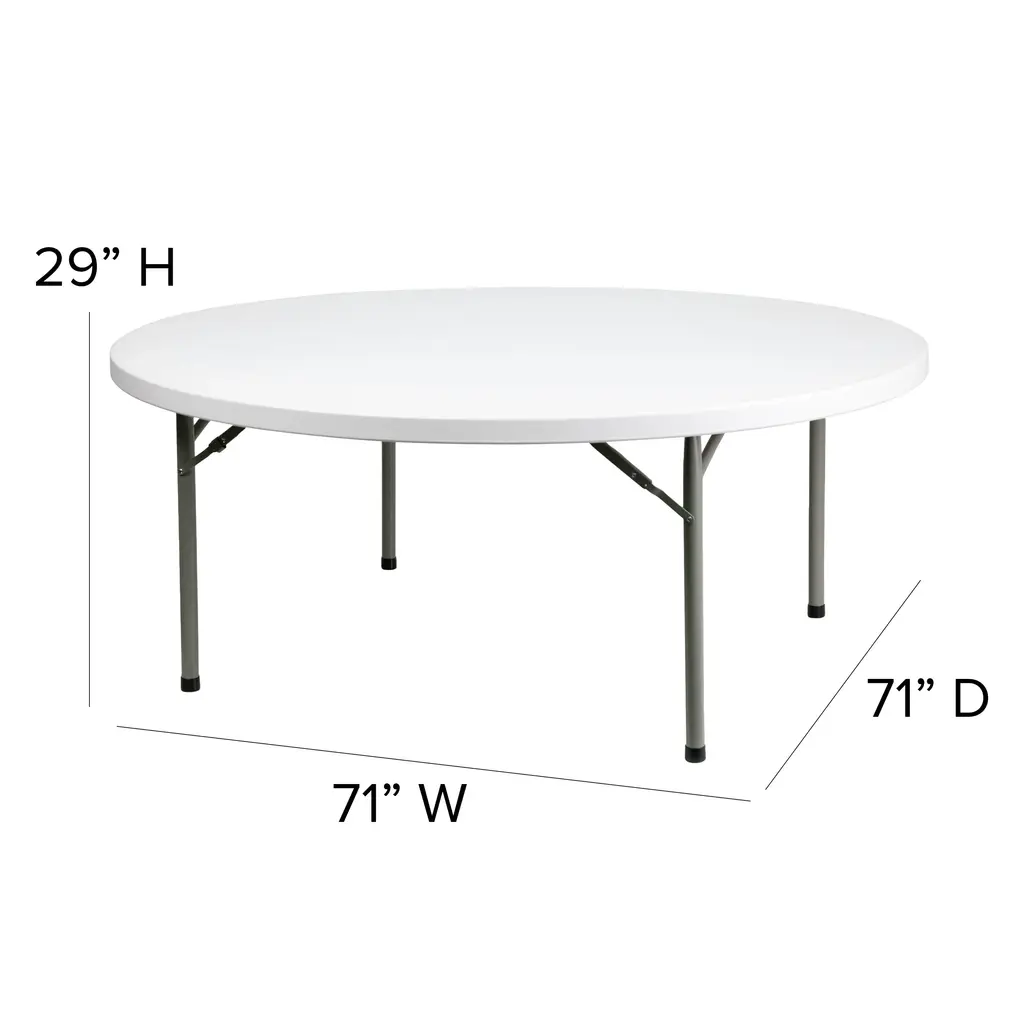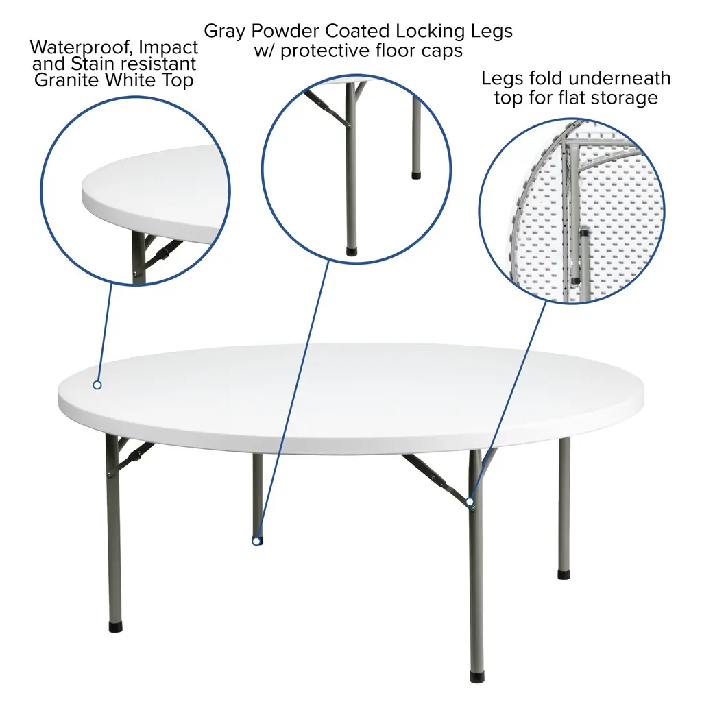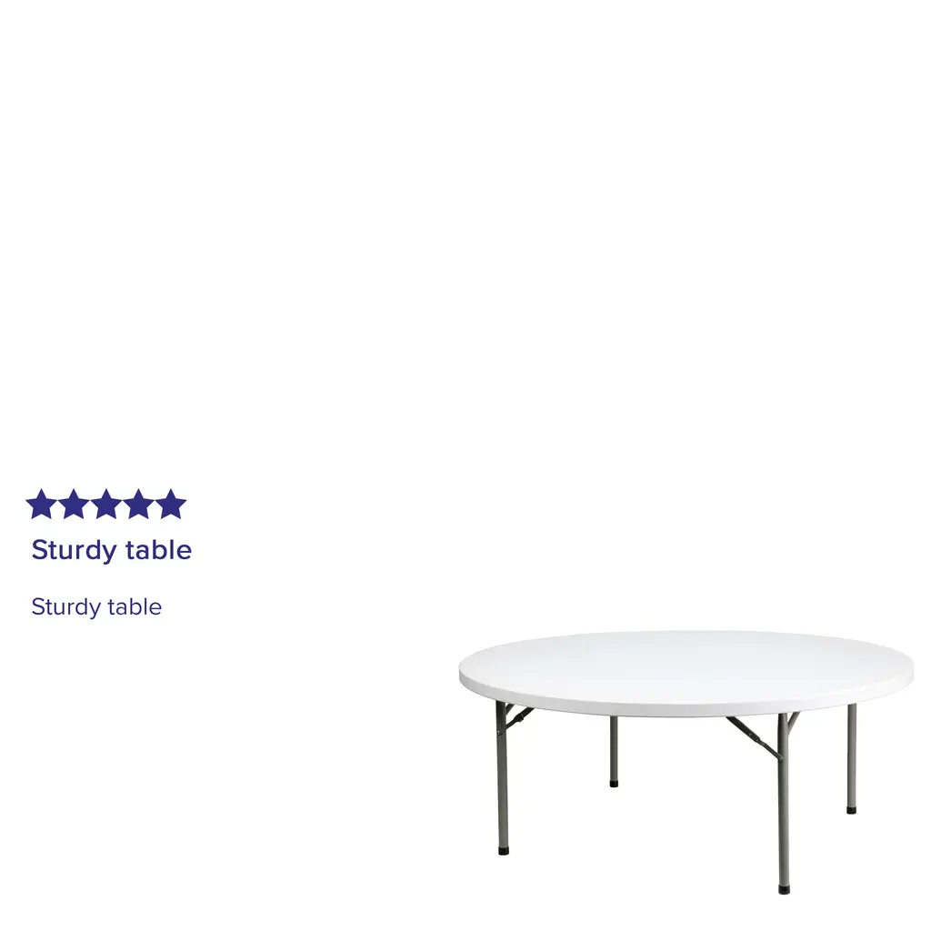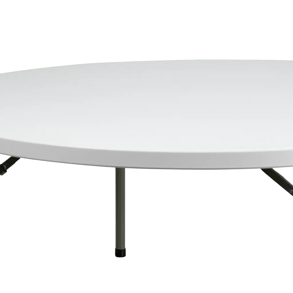 Ensure you have enough surface space for any function and take the stress out of hosting your next gathering. The round dining folding table is a great option for special event planners, catering companies and banquet facilities. This durable, easy to clean table is commercial rated for use in banquet halls, convention centers and at trade shows. Use during game night, dress it up for holiday parties, and coordinate crafts night. The thick, tabletop is 72" in diameter, 2.125" thick, and will comfortably seat up to 10 adults. Its waterproof, impact and stain resistant top have a 1100 pound static load capacity. Attractive powder coated legs lock securely in place while in use and non-marring floor caps protect your floor by sliding smoothly when you need to move the table. Designed for both indoor and outdoor use, store table indoors and protect the frame from extreme moisture. The 60" Round Plastic Folding Table is a convenient option for your next home, school or business event.