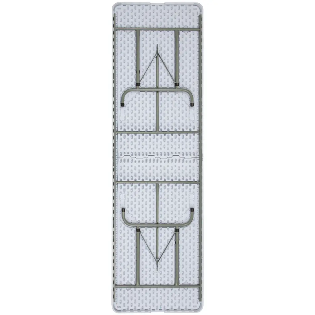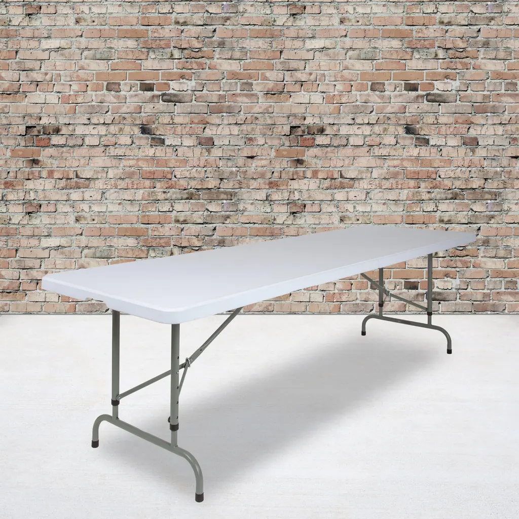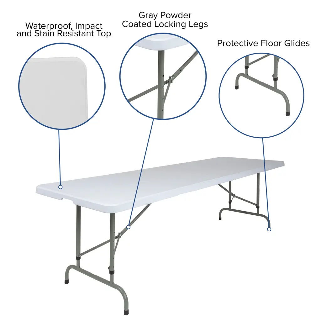 This adjustable height plastic folding table is a great option when you need a temporary dining surface or an everyday workstation in your home or office.The waterproof, impact and stain resistant top is 8 feet long, 1 inches thick, and will seat up to ten adults. Table is commercial rated for use as a training table, in banquet halls and at trade shows. Attractive gray powder coated legs lock securely in place while in use and non-marring floor caps protect your floor by sliding smoothly when you need to move the table.Designed for both indoor and outdoor use, the plastic folding table is a convenient option for your next home, school or business event.