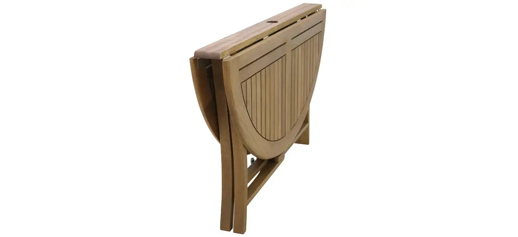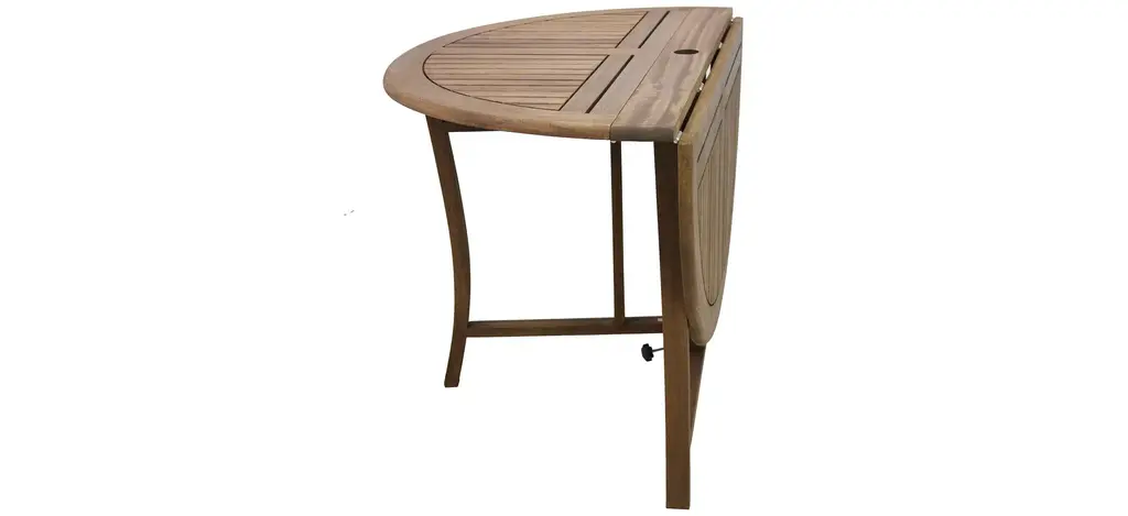 Upgrade your patio dining table with the Bauer Outdoor Folding Table. Crafted from durable eucalyptus wood in a natural brown umber stain, it is weather-resistant and naturally resistant to insect infestation. This table has a four-person seating capacity (chairs not included) and features an umbrella hole with a clamp. The table can fold down one side to become a serving table or both sides for easy storage.