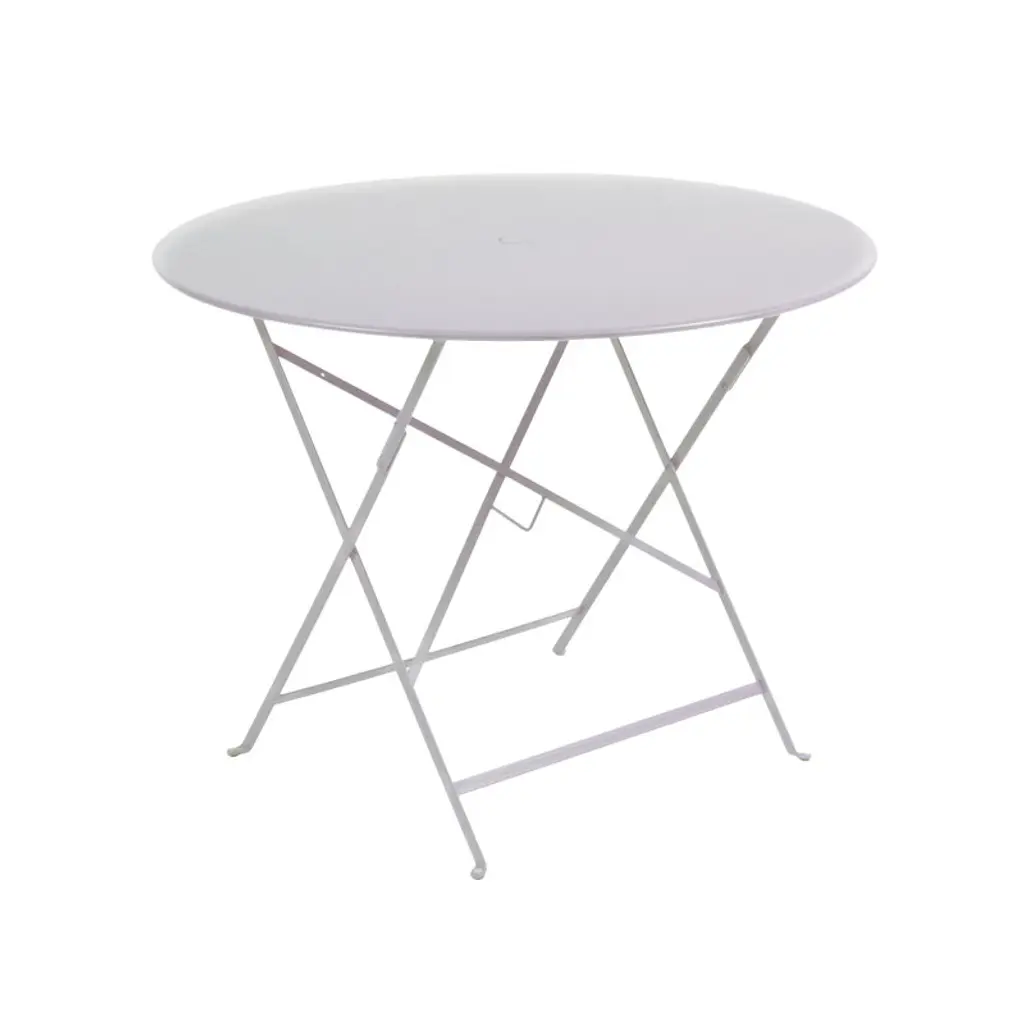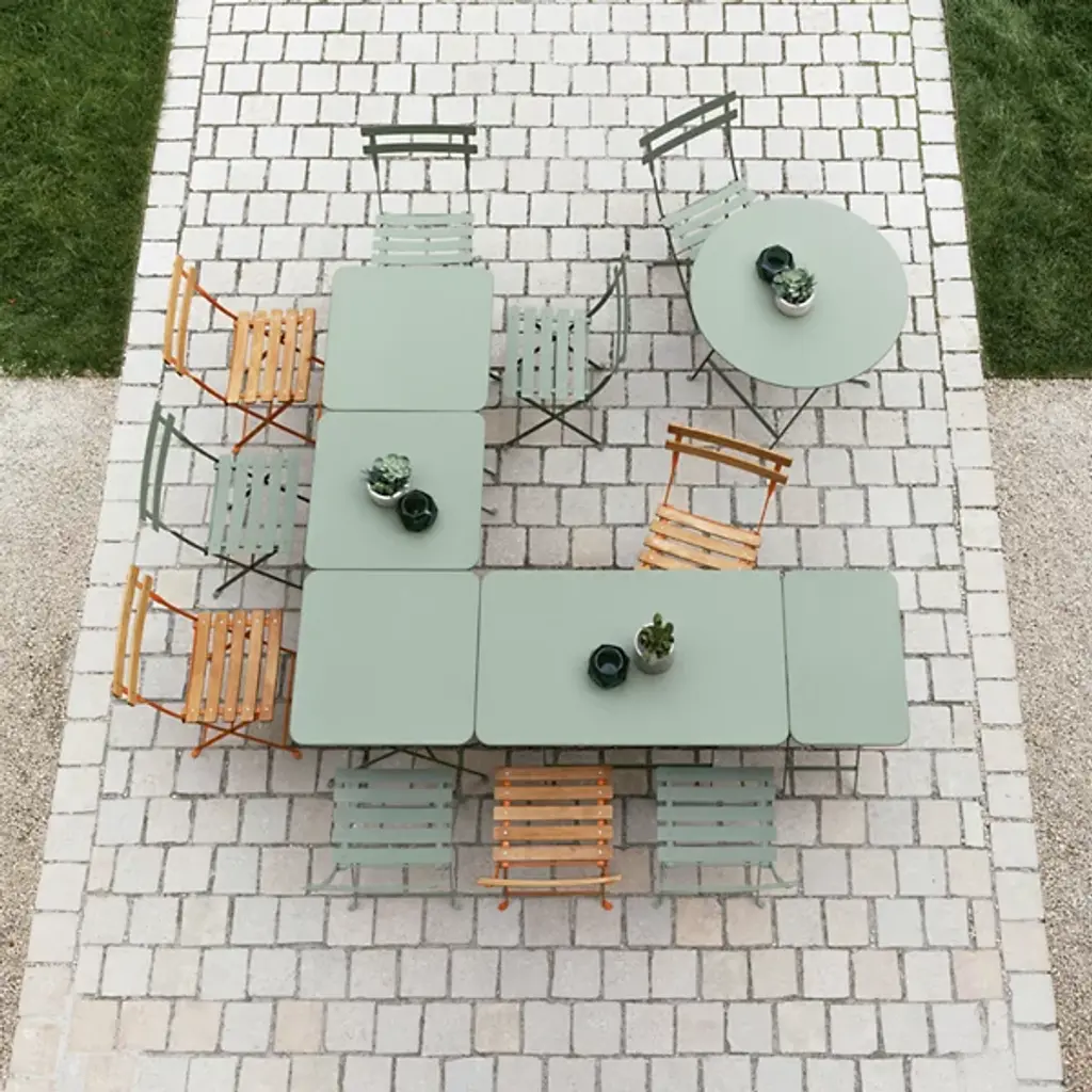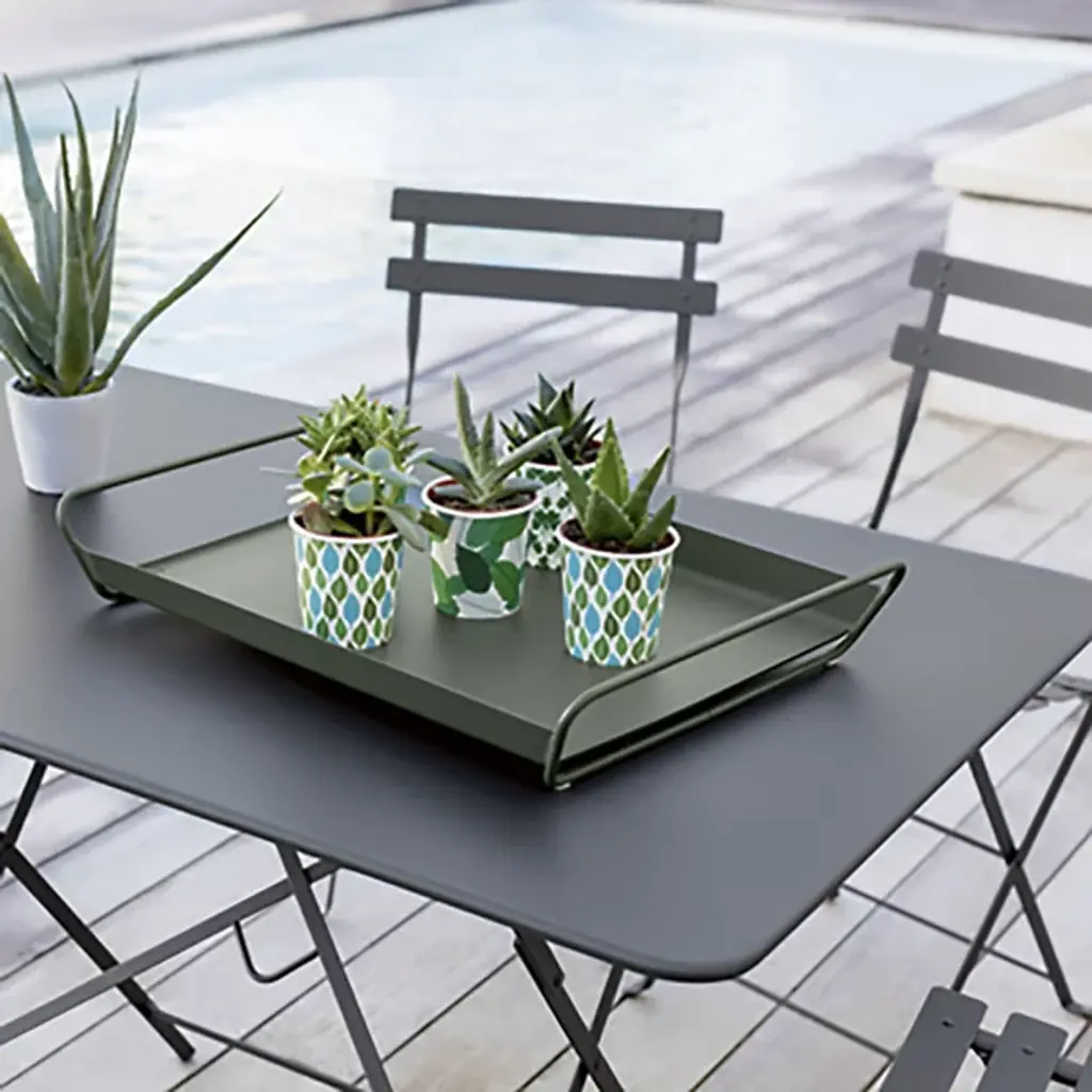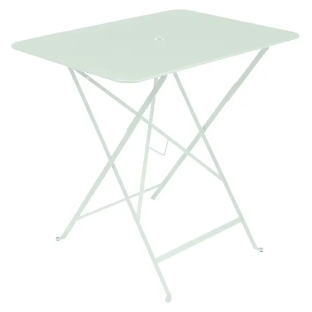The convenient functionality and versatile design of Bistro, wherever you need it. The Bistro Rectangle Folding Table by Fermob features a soft-cornered Steel sheet top on an architectural Lacquered Steel base. Wholly strong and secure when opened, the base is also supremely easy to fold up, with an easy-to-grab handle on the stabilizing crossbar. Whether you choose to dine on a patio, poolside or out on the lawn, foot protectors keep both the table and the surface on which it sits safe. To finish off the look of the table, choose a powder coat finish in one of many signature Fermob colors.