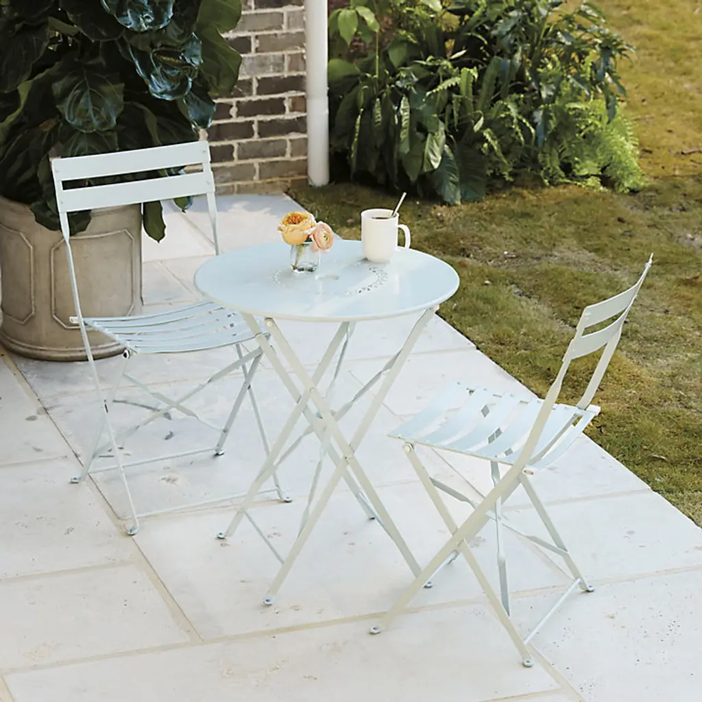 Our Café Folding Table and Chairs were inspired by the bustling sidewalk cafes of Europe. Each piece is crafted of zinc plated iron with a weather resistant, powder coat finish for years of durable wear. Tabletop is accented with a perforated detail that allows water to drain through. Chairs are contoured to be remarkably comfortable. Café Folding Table & Chairs features: