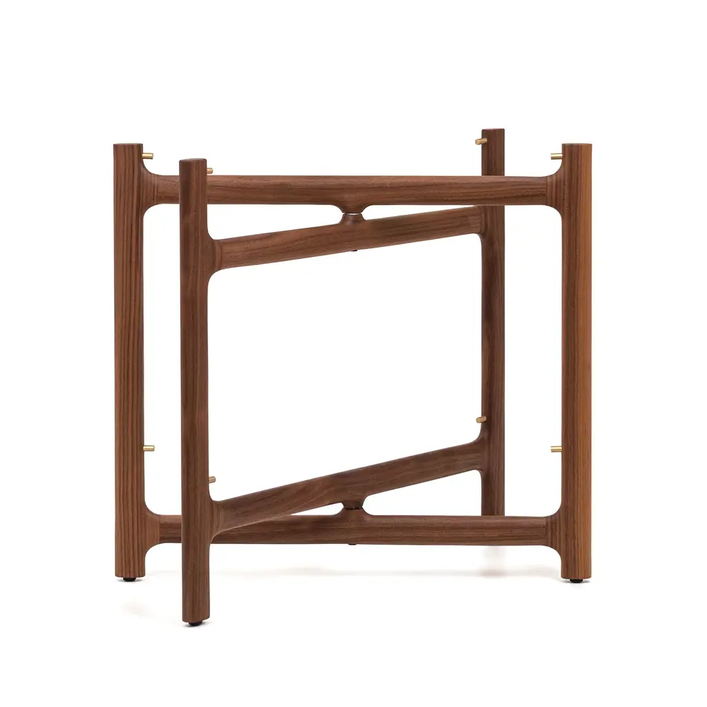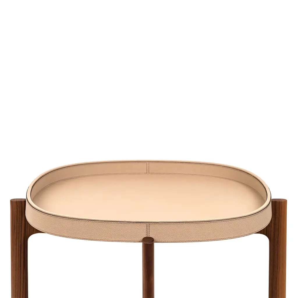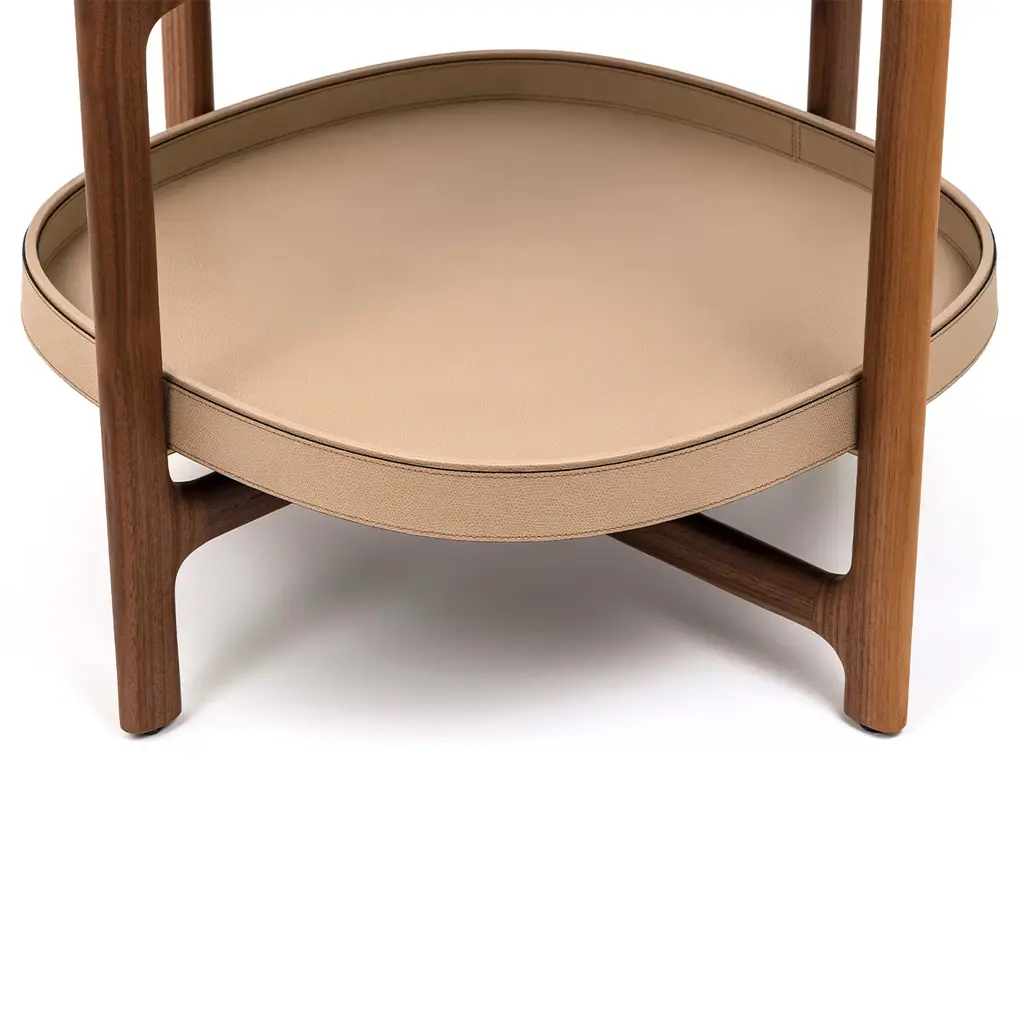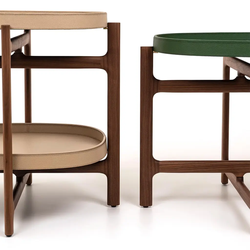 Contemporary style and timeless elegance merge in this spectacular design, a two-level folding side table ideal to complement a living room or conversational area decor. Handmade of Canaletto walnut, the clean structure is completed with two removable dove gray leather trays. Available in three sizes and other colors, please consult the Concierge for details.