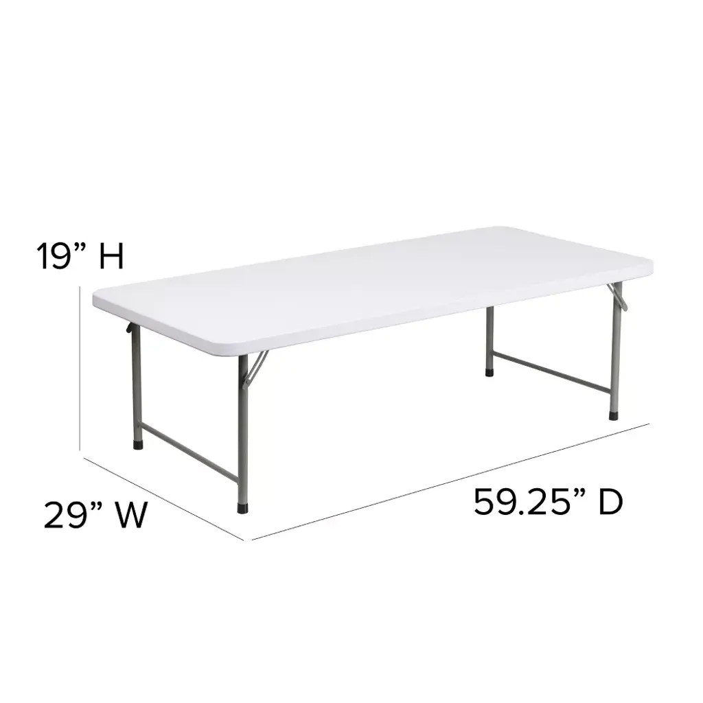 Do you have an in-home daycare or need to furnish a classroom full of toddlers? This foldable kid table will be a nice addition in your kids' playroom or Sunday school. These white plastic kids table provides ample space for little ones to play and be creative. Host incredible birthday and dinner parties around this expansive rectangular plastic table that accommodates up to 6 with plenty of room between each child. Don't let spills ruin the fun, the low maintenance top is easy to clean. The table legs fold under the table to make storing more convenient and for better portability for road trips. Whether your purchase is for the home or classroom, children will appreciate a table that's just their size to interact with other children their age. Give your kids a space of their own for homework, reading, snack time and crafts