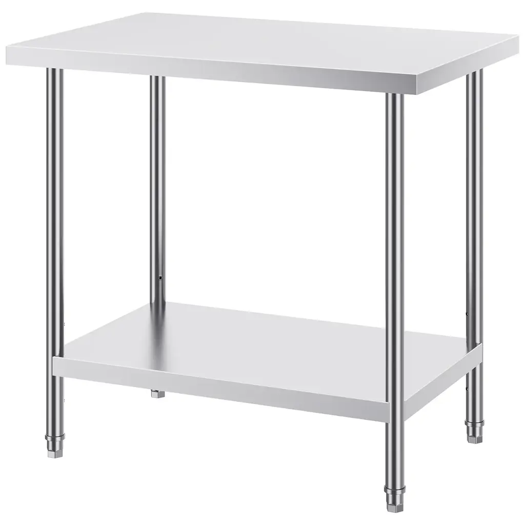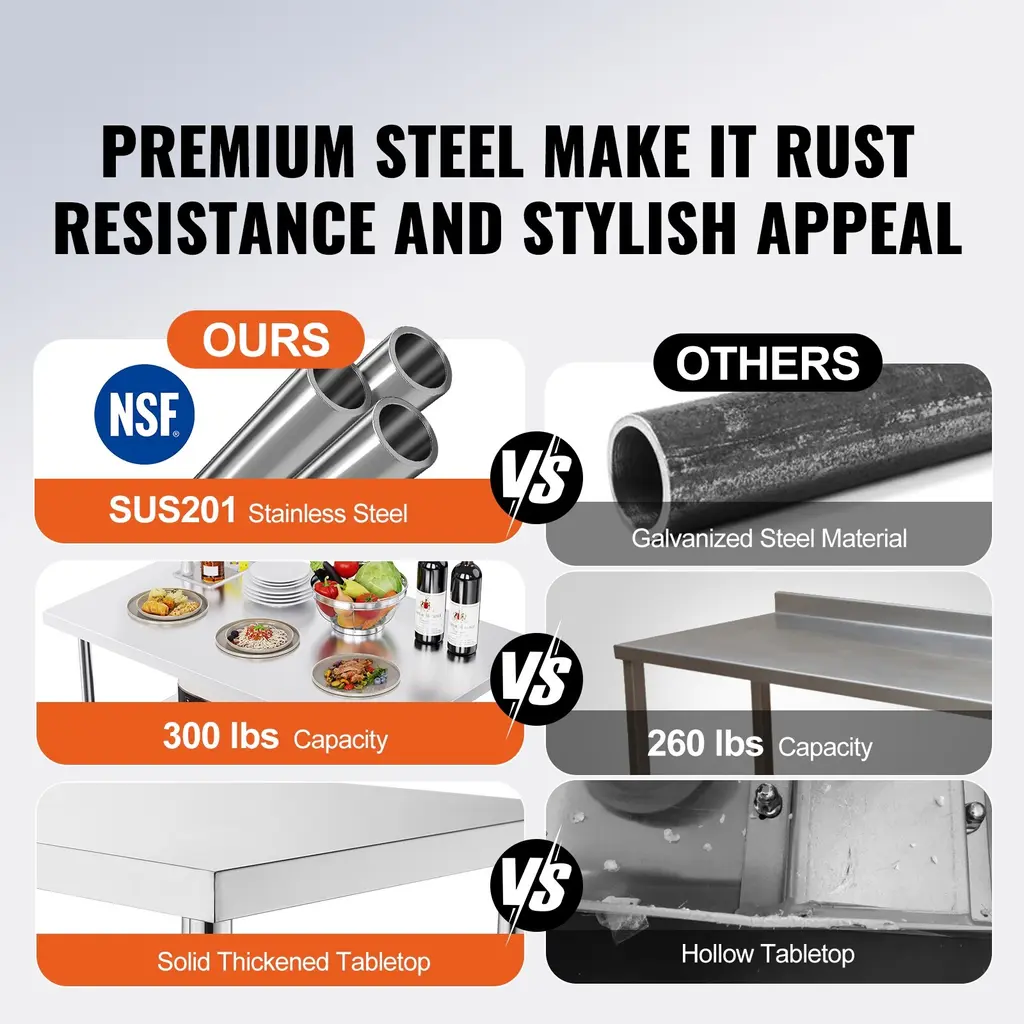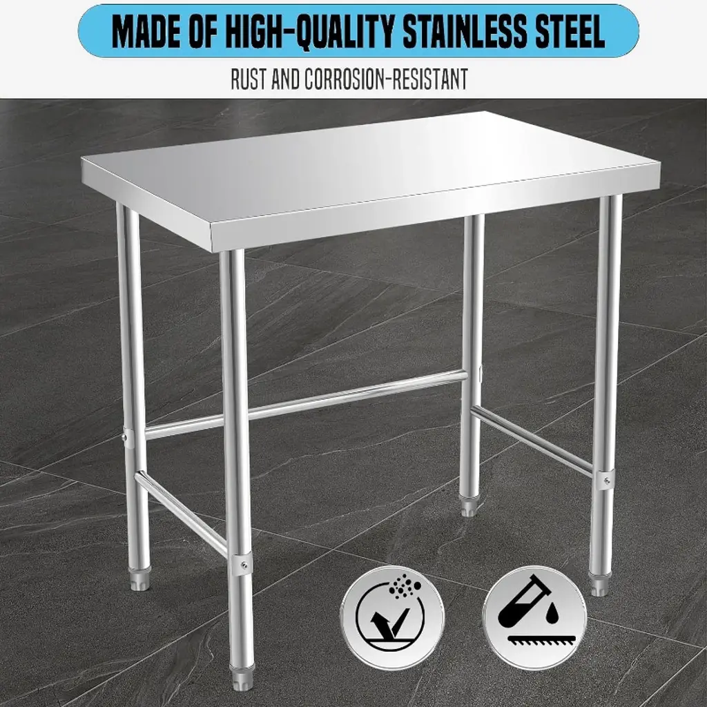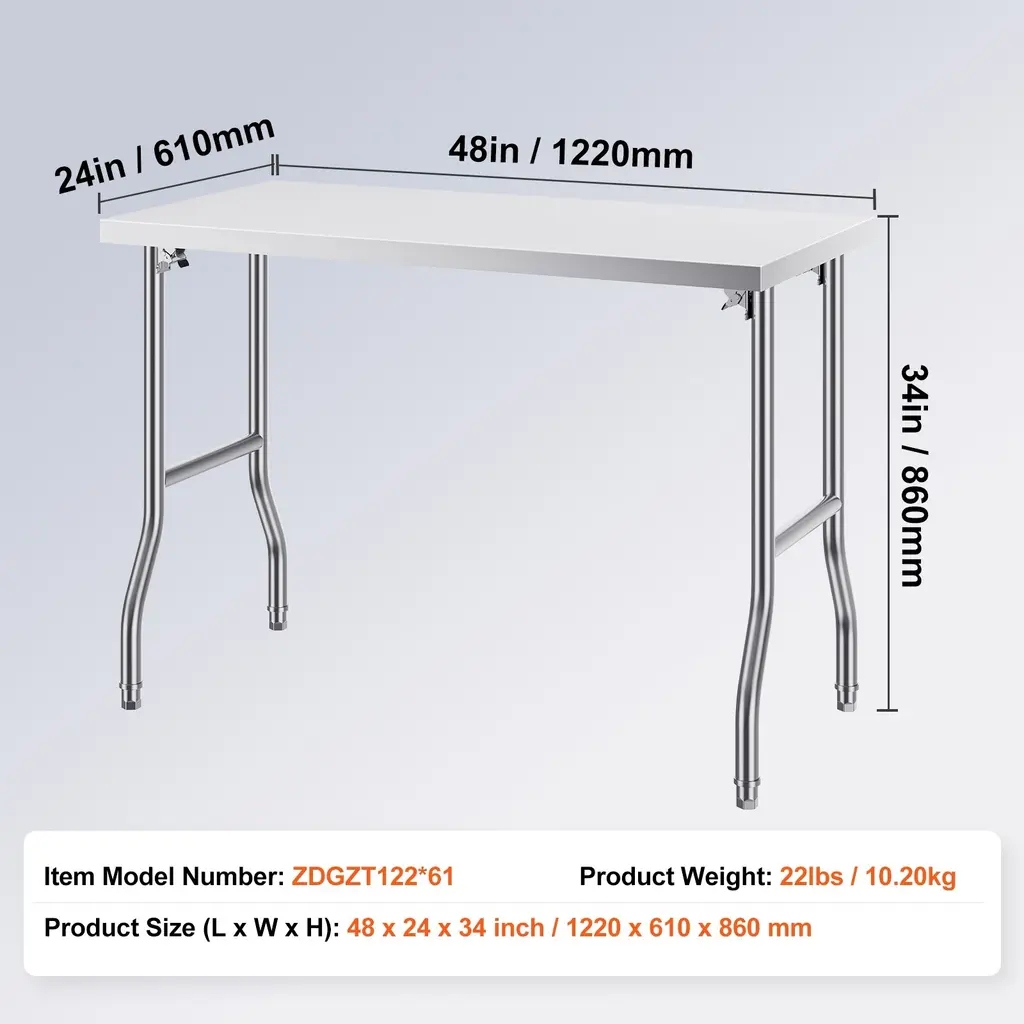 ATTENTION: For your security, gloves are required during assembly. High-Quality Stainless Steel: This work table, measuring 48 x 24 x 34 inch, is made from SUS201 stainless steel for the tabletop, shelves, and legs. It offers superior rust resistance, a sleek appearance, and a smooth surface that is easy to clean with a simple wipe. NSF certified, it meets strict public health standards, ensuring long-lasting protection for your health. Stable and Durable: With an upgraded thickness of 0.8mm, this table is sturdy and durable, providing ample storage for your supplies and allowing you to stack your favorite ingredients easily. Space-Saving Foldable Design: This stainless steel work table features an easy folding mechanism, making it convenient for both indoor and outdoor use. The four legs can quickly fold down, fitting easily into your trunk for transport to remote areas, and it can be easily stored when not in use. Ideal for outdoor activities. Versatile Applications: Beyond storage, our table can be used for chopping vegetables, kneading dough, cutting meat, and other kitchen-related tasks. It is perfect for use in bars, restaurants, hotels, buffets, catering events, school activities, or office break rooms. Practical Sizes: Available in various sizes to perfectly fit your kitchen needs. Whether for commercial kitchens, home renovations, or your garage setup, our professional-grade stainless steel work table series is designed for lasting performance and reliability. We recommend measuring your space before purchasing. Package Content 1 x Table 1 x Instruction Manual