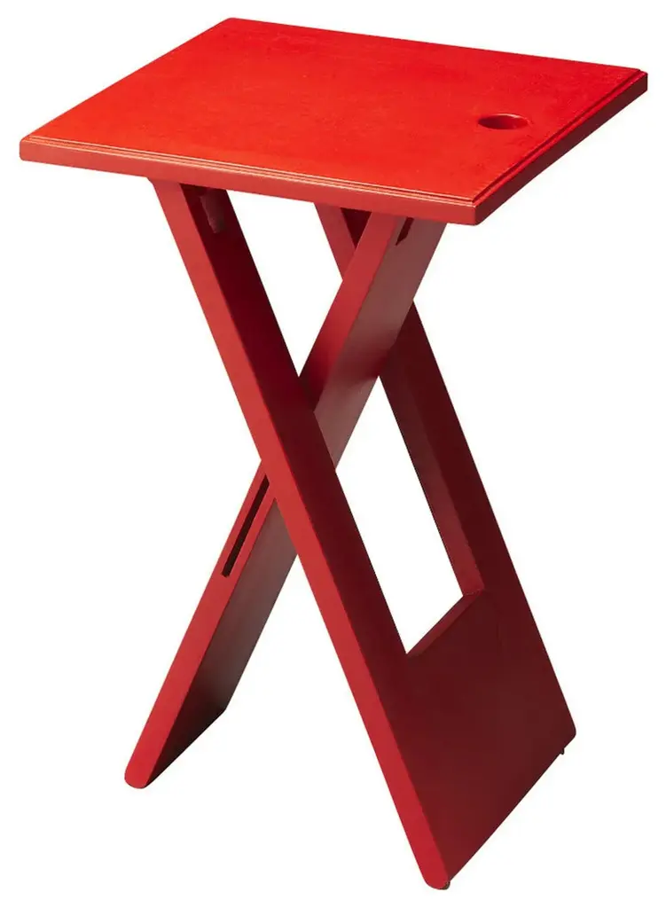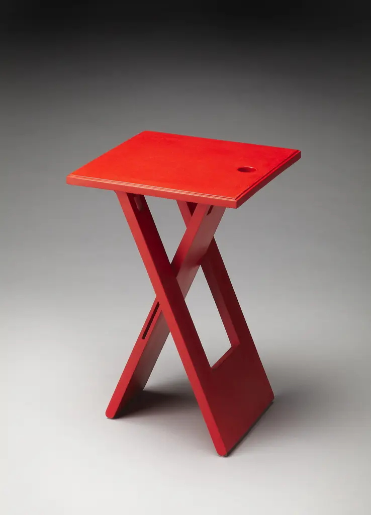 Whimsical, versatile and fun! This folding table is designed to snuggle into a small spot for a brief visit… or a long stay. Folds easily for compact storage. Crafted from Mango Wood solids. Finished in a vibrant Red. Durably Constructed With: Mango Wood Solids Product Construction Features: Finish Distressing Product Assembled Measurement & Weight: 18.0" H x 11.75" W x 11.75" D -- 6.0 lbs. 150 lbs. Suggested weight capacity Item Arrives: Assembled Wood, like all natural materials, has inherent disparities in color and grain pattern. Variations in shade and markings are normal and can be expected with the natural materials used in the construction of this product. Photo may slightly differ from actual item in terms of color/finish due to the lighting during photo shoot or the monitor's display.