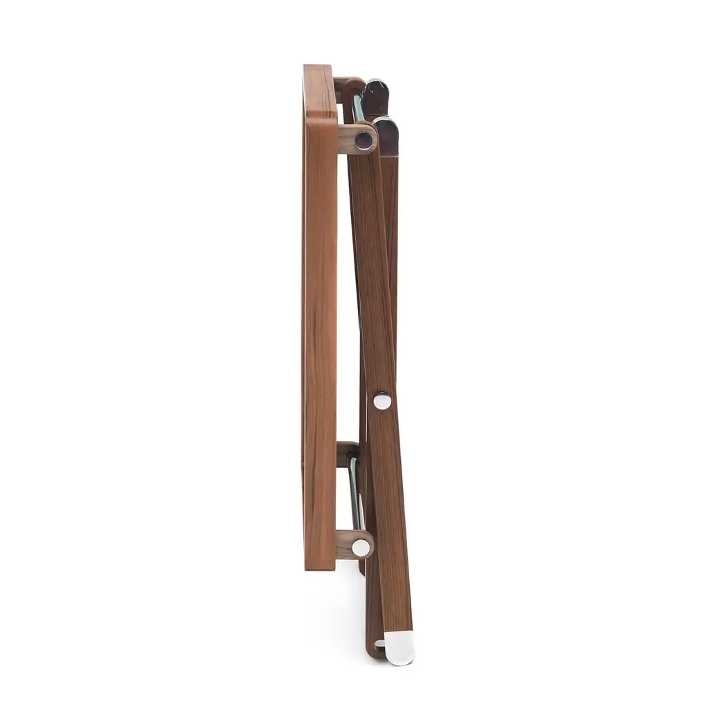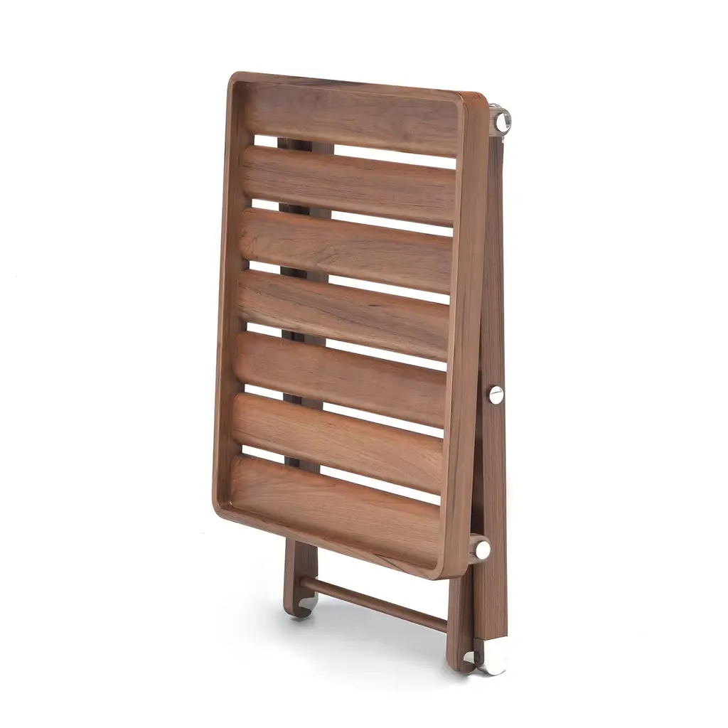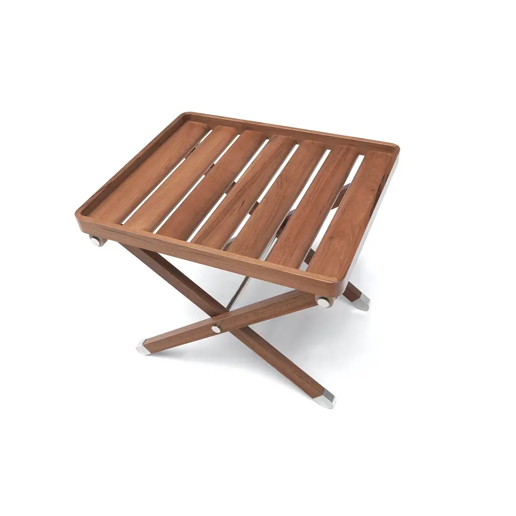 Showcasing a silhouette that is as elegant as it is elementary, this folding table is the ideal furnishing piece to add an extra serving surface where needed while not compromising on style. The structure combines iroko wood and stainless steel, materials renowned for their durability and resistance.