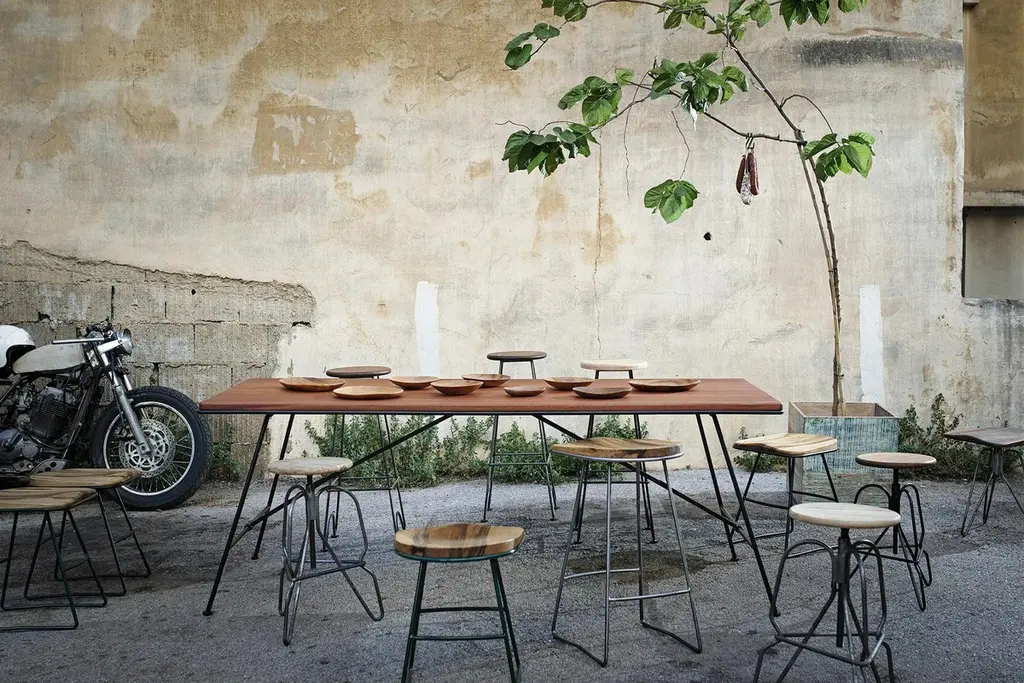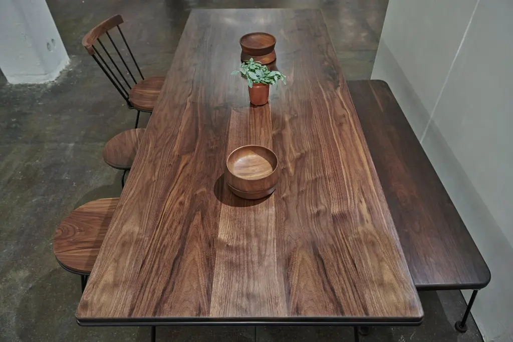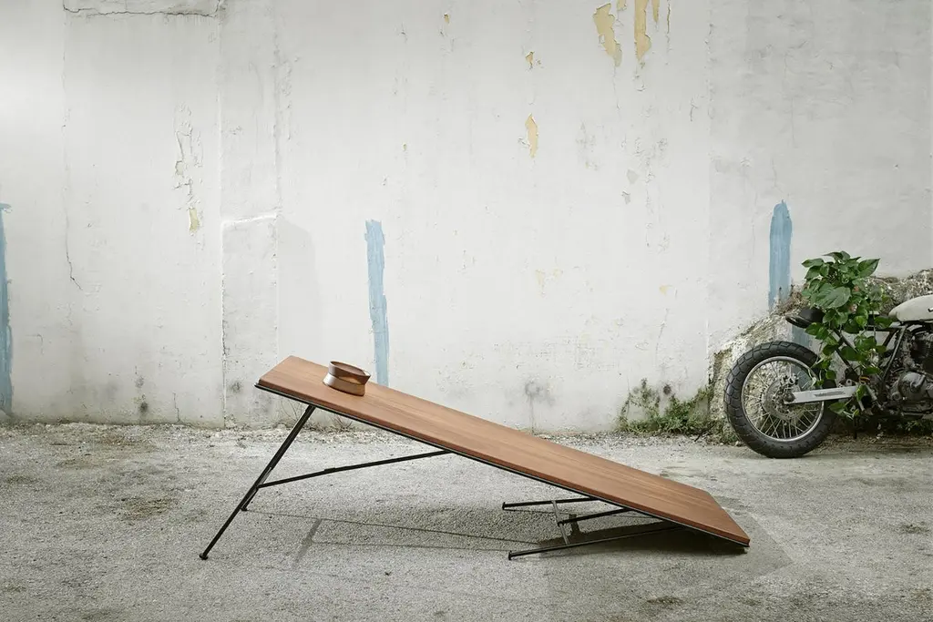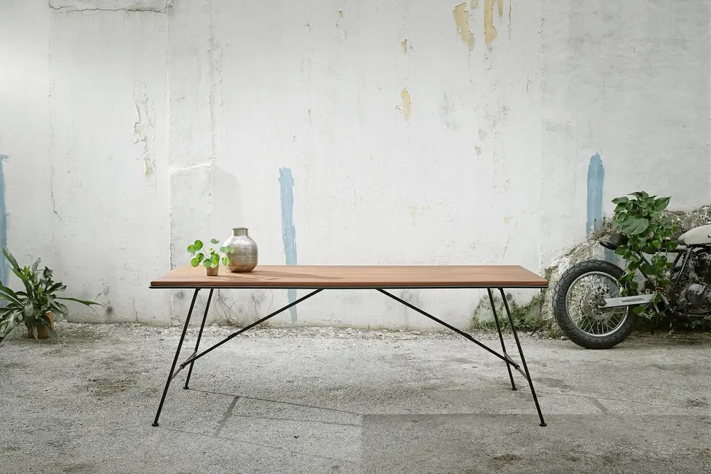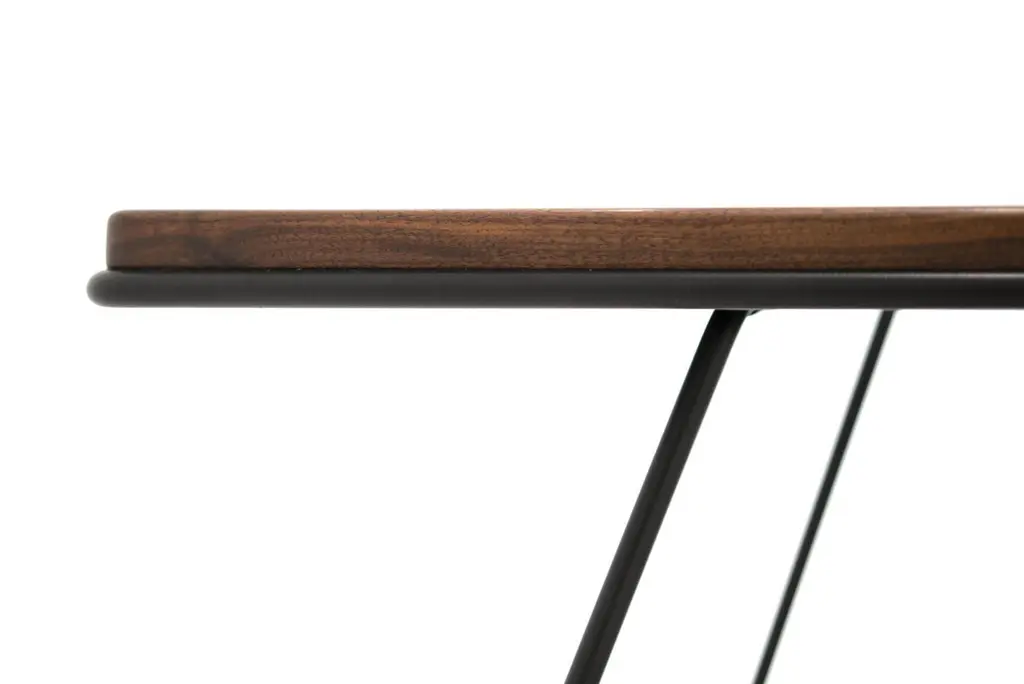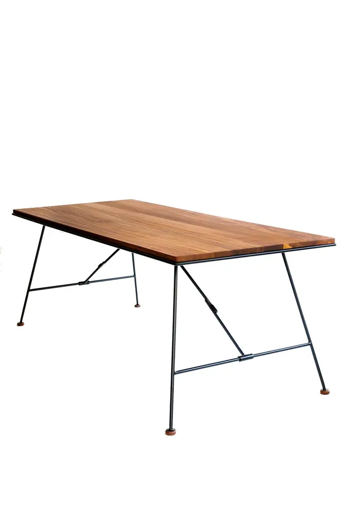 Inspired by old-school field operating tables, the Mikado folding table features a solid wood top and solid steel legs. In-cased with a signature steel edge to protect the wood when folded flat. The mikado table comes in four sizes and is suitable as a dining table or desk. The Mikado is offered here in steel and solid walnut and can be custom-made in surgical-grade stainless steel.This handcrafted piece is hand-oiled using house-blended oils and techniques and black powder-coated steel.