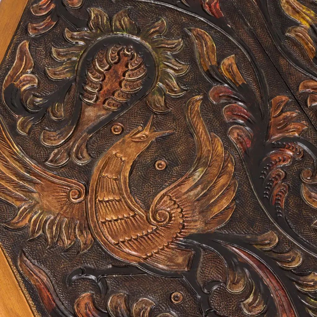With its novel folding shape, this octagonal accent table is beautiful and original. Abel Ríos skillfully combines form and function, creating an unusual, handcrafted piece of furniture. The tabletop of glowing leather is hand-tooled with two birds of paradise and is mounted on a frame of fine Andean mohena wood.