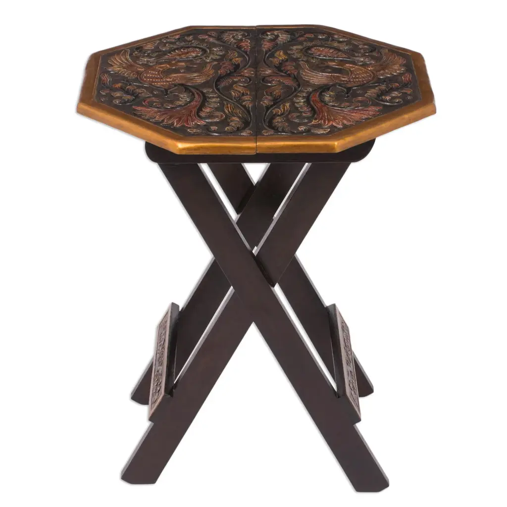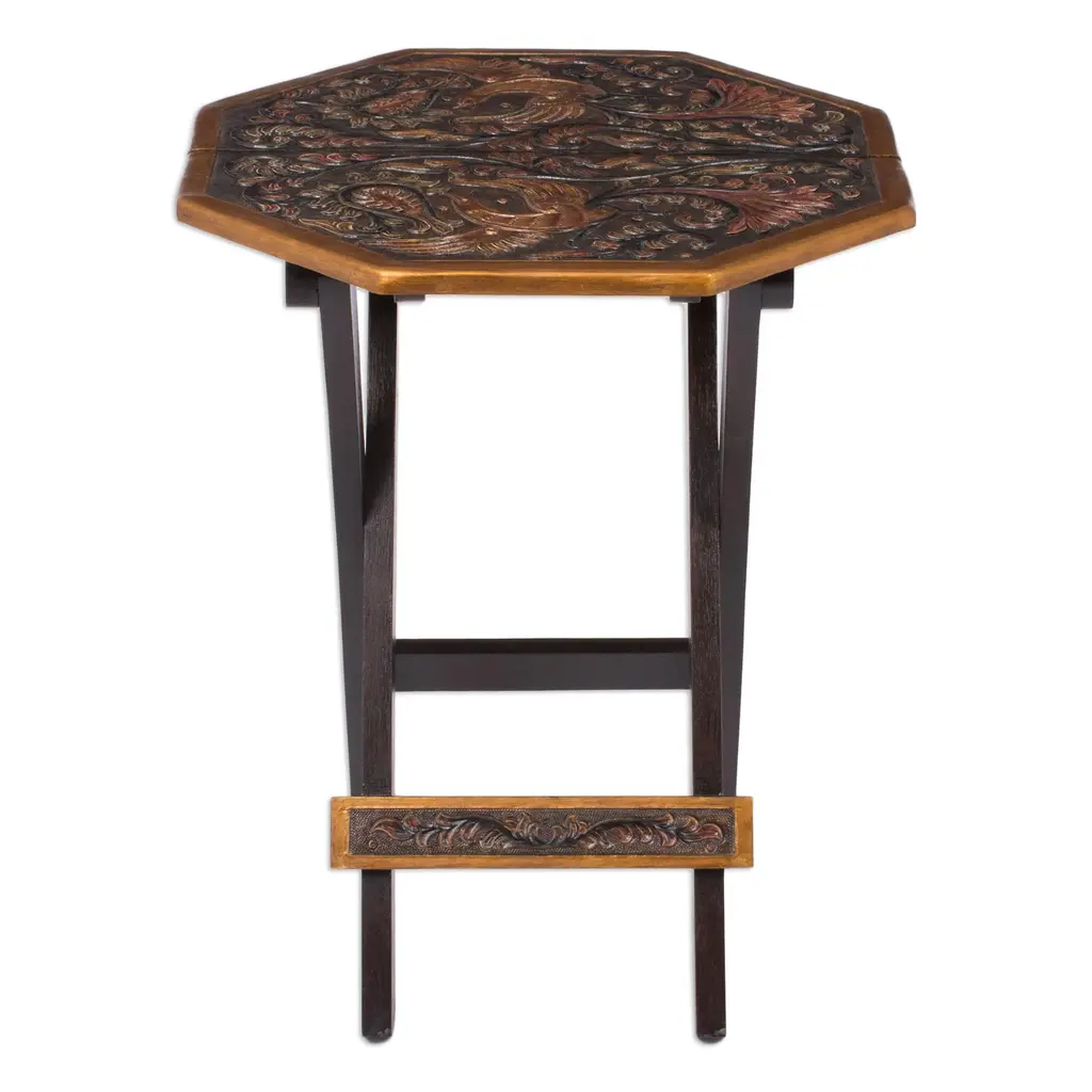 Peruvian Animal Themed Leather Wood Folding Table - Octagonal Birds Of Paradise
