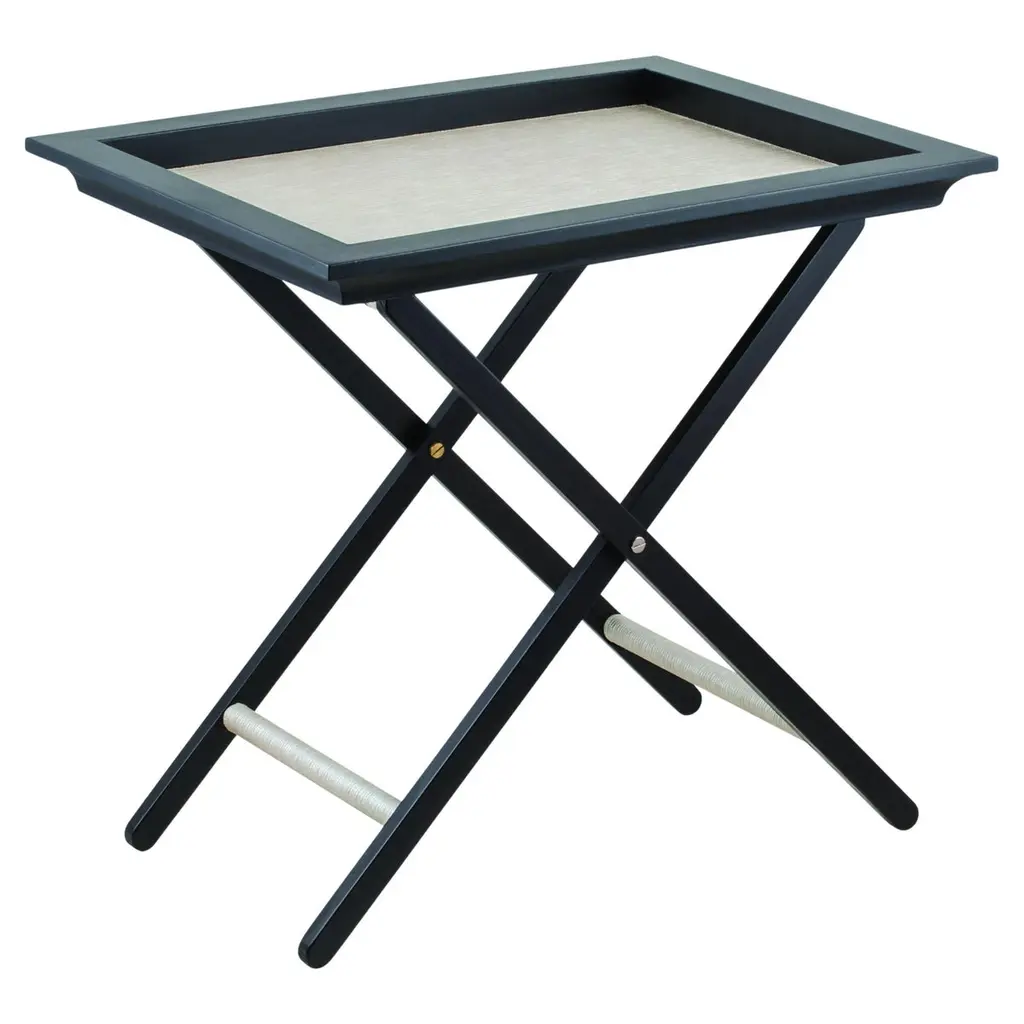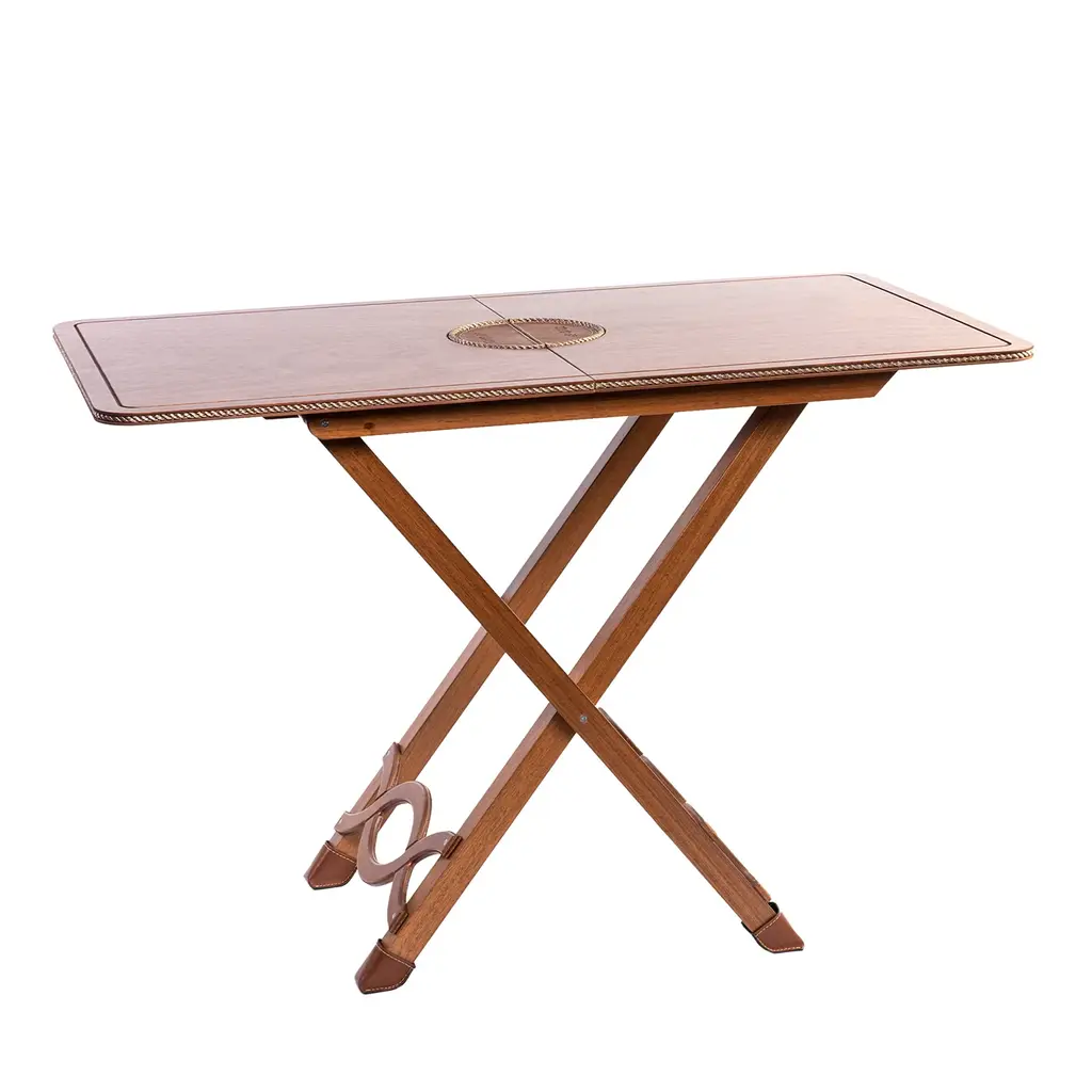 A must-have essential for hosting parties in the backyard or enjoy lunch on a boat, this folding table is made of solid wood with a dark stain embellished with a decorative border in leather and rope. The X-shaped legs feature a stunning footrest on each side with two overlapping waves. Designed with easy storage in mind, this table folds in few steps and can be put away in its waterproof storage bag with handles. This handcrafted table is amazingly versatile and stylish at the same time.