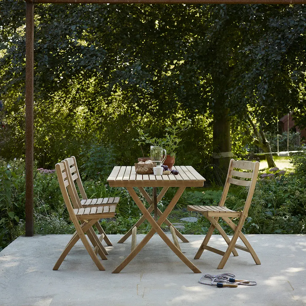 Selandia is sea air at the summer cabin, a cool breeze on the balcony and a wonderful get-together in the garden. The rectangular table is perfect for a sunny spot and is easily foldable for storage during winter.