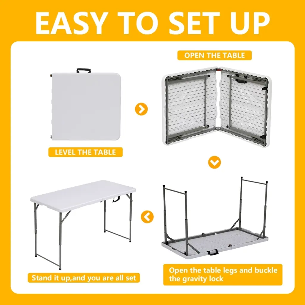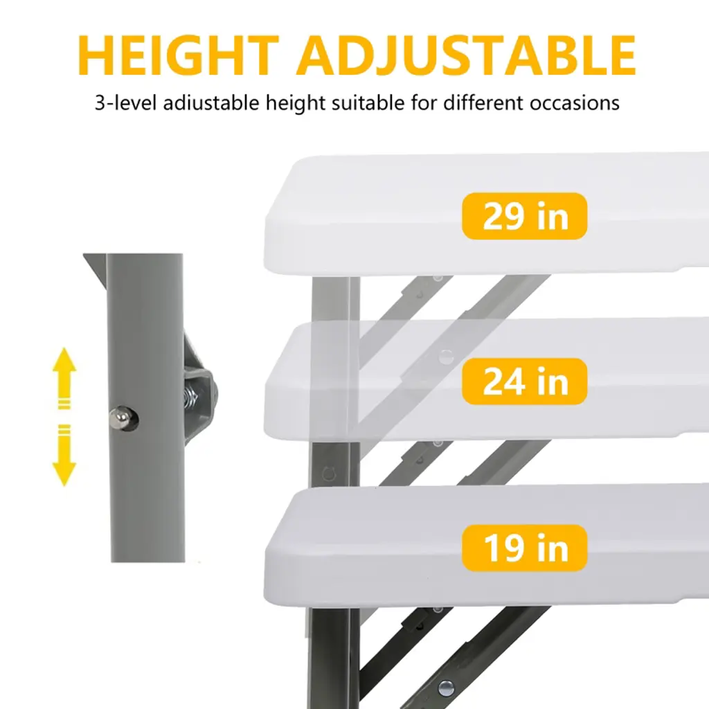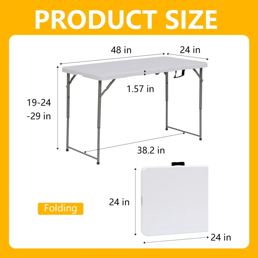 Made of high-density polyethylene, this liftable folding table is sturdy and easy to clean. Features a convenient folding design for easy transportation and storage. Perfect for indoor and outdoor daily use, it can be used as a dining table, craft supply table, outdoor dining table or whatever you need it for. It takes up little space when folded and requires no assembly, making your life easier. This table can seat up to 6 people, it is ideal for parties, weddings, family gatherings, offices, and a variety of other occasions. Features Broad Leg Stance - Creates superior stability Convenient Carry Handle - High quality comfort during transportation. Durable Table Top - Stain-resistant, UV-protected, and built to last. Folds In Half - Excellent portability and storage from its compact fold. Height Adjustable - Create a variety of settings for any occasion. Adjusts to 19 in., 24 in., 29 in. Impact-Resistant Corners - Engineered for superior durability and strength to prevent denting upon impact Lightweight - Easy to lift and carry Non-Marring Foot Caps - Prevents floor damage Powder-Coated Frame - Rust-Resistant Steel Push-Pin Mechanism - Press both push pins on the frame for easy setup or takedown Specifications: Color: White Frame Material: Metal Furniture Finish: Alloy Steel Table Top Material: HDPE Shape: Rectangle Dimensions (Folded): 24 in x 24 in x 3 in (L x W x H) Dimensions (Open): 48 in x 24 in x 19 -24- 29 in(L x W x H) Weight:17 lbs