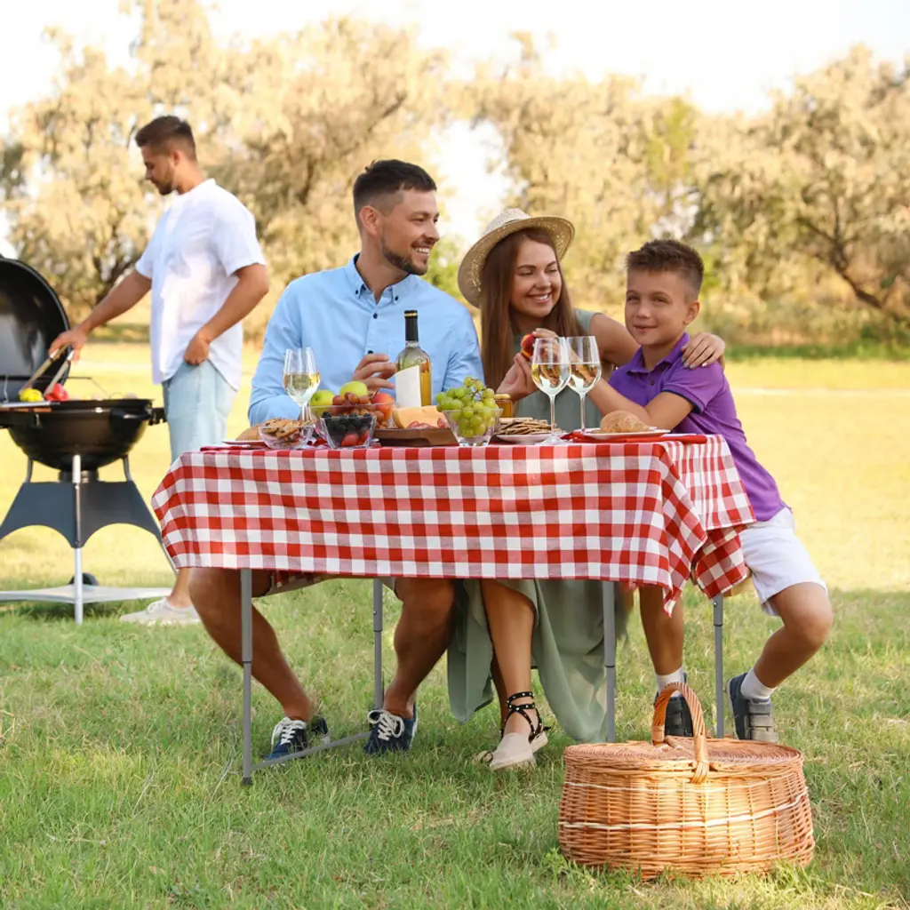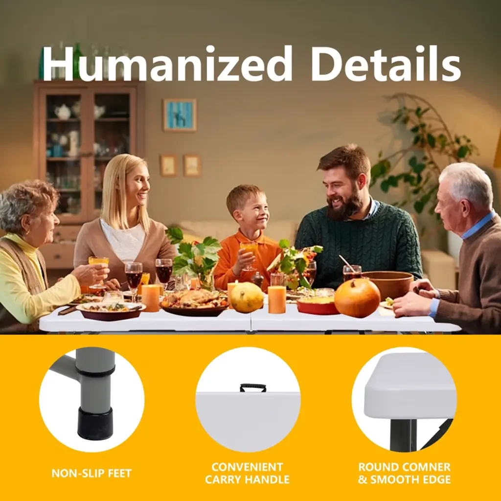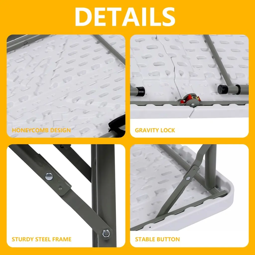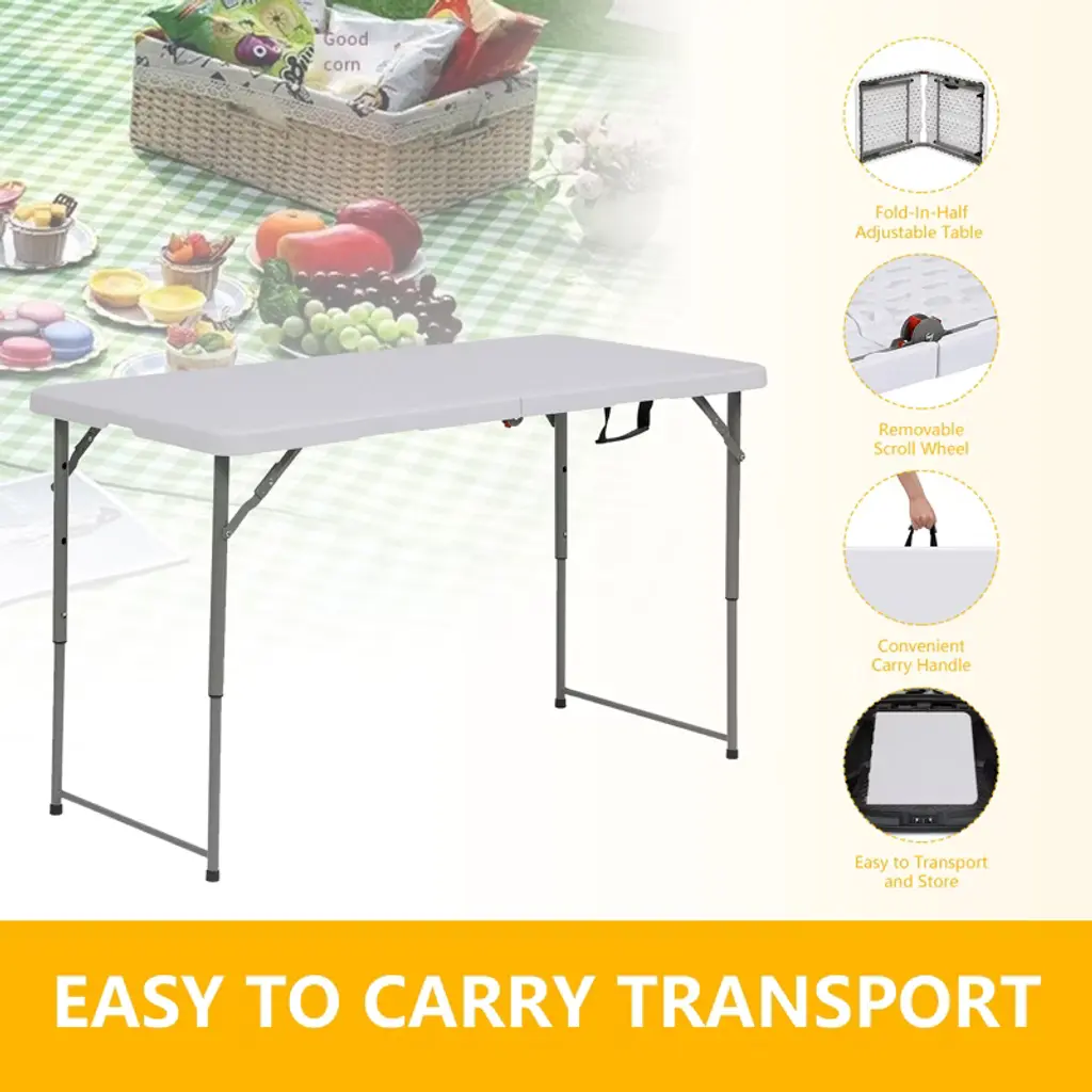 Made of high-density polyethylene, this liftable folding table is sturdy and easy to clean. Features a convenient folding design for easy transportation and storage. Perfect for indoor and outdoor daily use, it can be used as a dining table, craft supply table, outdoor dining table or whatever you need it for. It takes up little space when folded and requires no assembly, making your life easier. This table can seat up to 6 people, it is ideal for parties, weddings, family gatherings, offices, and a variety of other occasions. Features Broad Leg Stance - Creates superior stability Convenient Carry Handle - High quality comfort during transportation. Durable Table Top - Stain-resistant, UV-protected, and built to last. Folds In Half - Excellent portability and storage from its compact fold. Height Adjustable - Create a variety of settings for any occasion. Adjusts to 19 in., 24 in., 29 in. Impact-Resistant Corners - Engineered for superior durability and strength to prevent denting upon impact Lightweight - Easy to lift and carry Non-Marring Foot Caps - Prevents floor damage Powder-Coated Frame - Rust-Resistant Steel Push-Pin Mechanism - Press both push pins on the frame for easy setup or takedown Specifications: Color: White Frame Material: Metal Furniture Finish: Alloy Steel Table Top Material: HDPE Shape: Rectangle Dimensions (Folded): 24 in x 24 in x 3 in (L x W x H) Dimensions (Open): 48 in x 24 in x 19 -24- 29 in(L x W x H) Weight:17 lbs