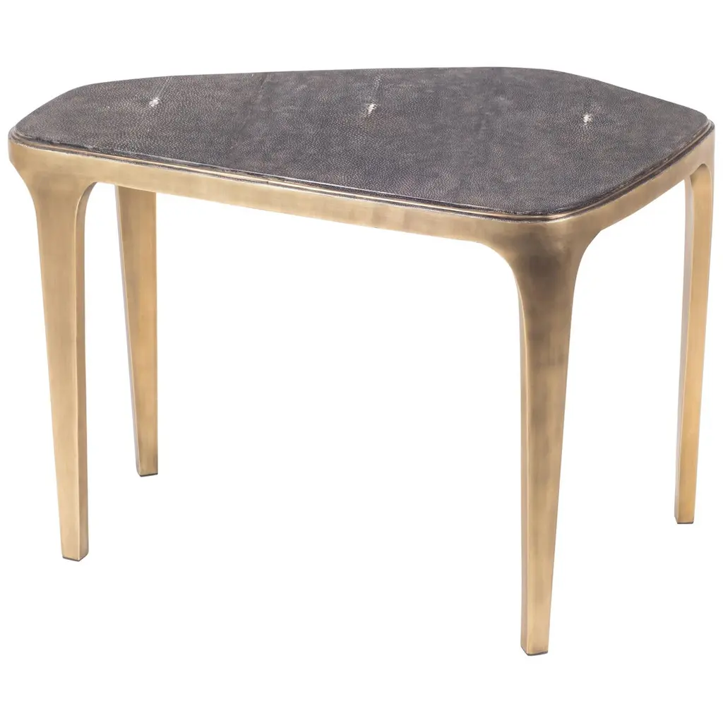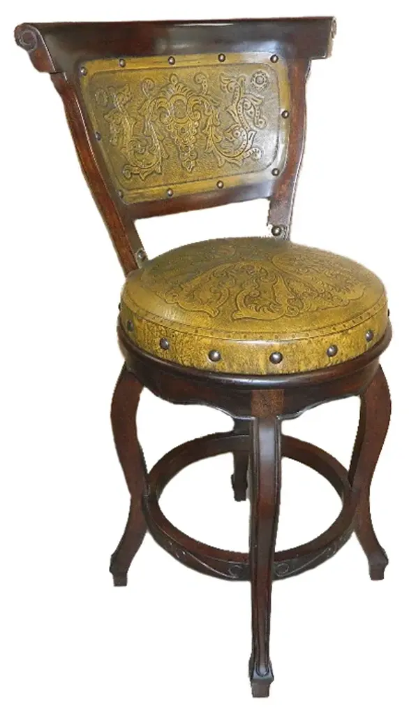 With its novel folding shape, this handsome accent table is beautiful and original. Abel Ríos skillfully combines form and function, creating an unusual, handcrafted piece of furniture. The tabletop of glowing leather is hand-tooled with bird of paradise motifs and is mounted on a frame of mohena wood.