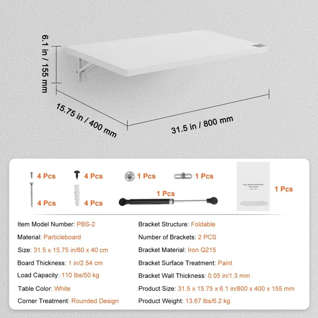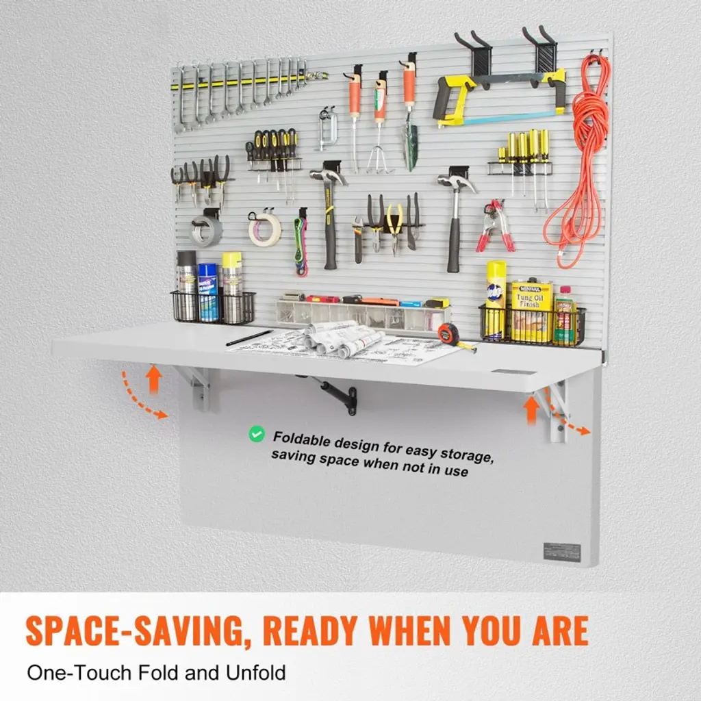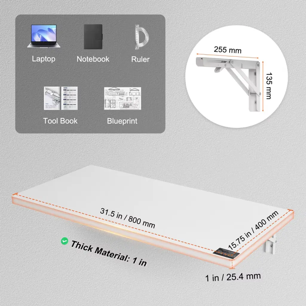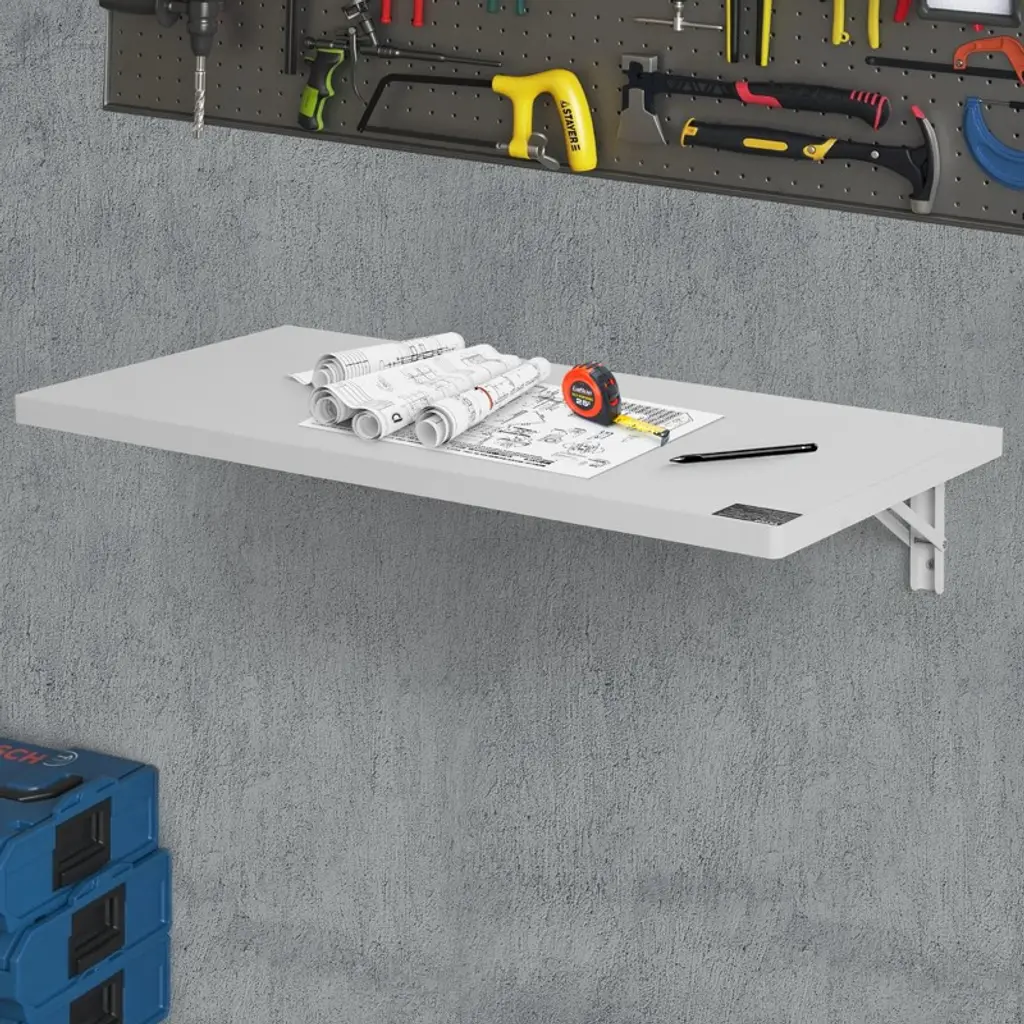 Feature: Slow-Closing Folding: Designed to save space, this wall mounted folding table folds and unfolds quickly, ideal for small spaces. The slow-closing brackets prevent pinching during use, making it ultra-convenient for immediate use without the need for large reserved spaces—just unfold and start working or display items. 110 lbs High Load Capacity: Despite its compact size, this wall mounted desk holds up to 110 lbs thanks to its thick 1-inch material. It's stable for everything from small tools, large tools, laptops, and heavy books to decor items, ensuring everything stays steady. Easy Installation: Installing our wall mount folding table is a breeze with included installation positioning paper. Pre-marked installation positions on the template allow for quick hole drilling, ensuring a convenient installation process. Scratch-Resistant Design: Crafted from premium materials, this wall desk meets comprehensive environmental emission standards. Its rounded corner design reduces potential risks from collisions, enhancing security for you and your family. Versatile for Any Space: Whether it's your garage, workshop, tool room, home office, or kitchen, this floating desk fits right in. It helps you make the most of your space, keeping everything organized and efficient. Package Content: 1 x Wall Mounted Table