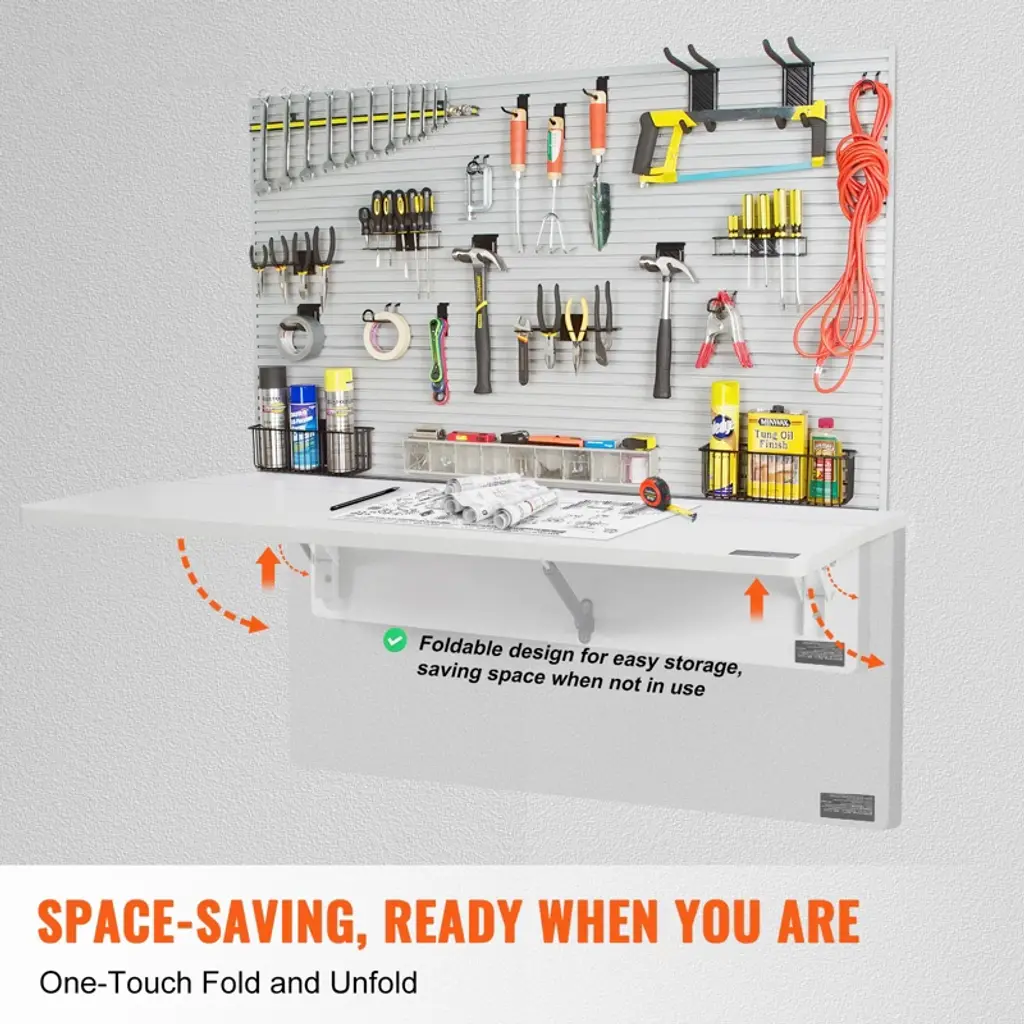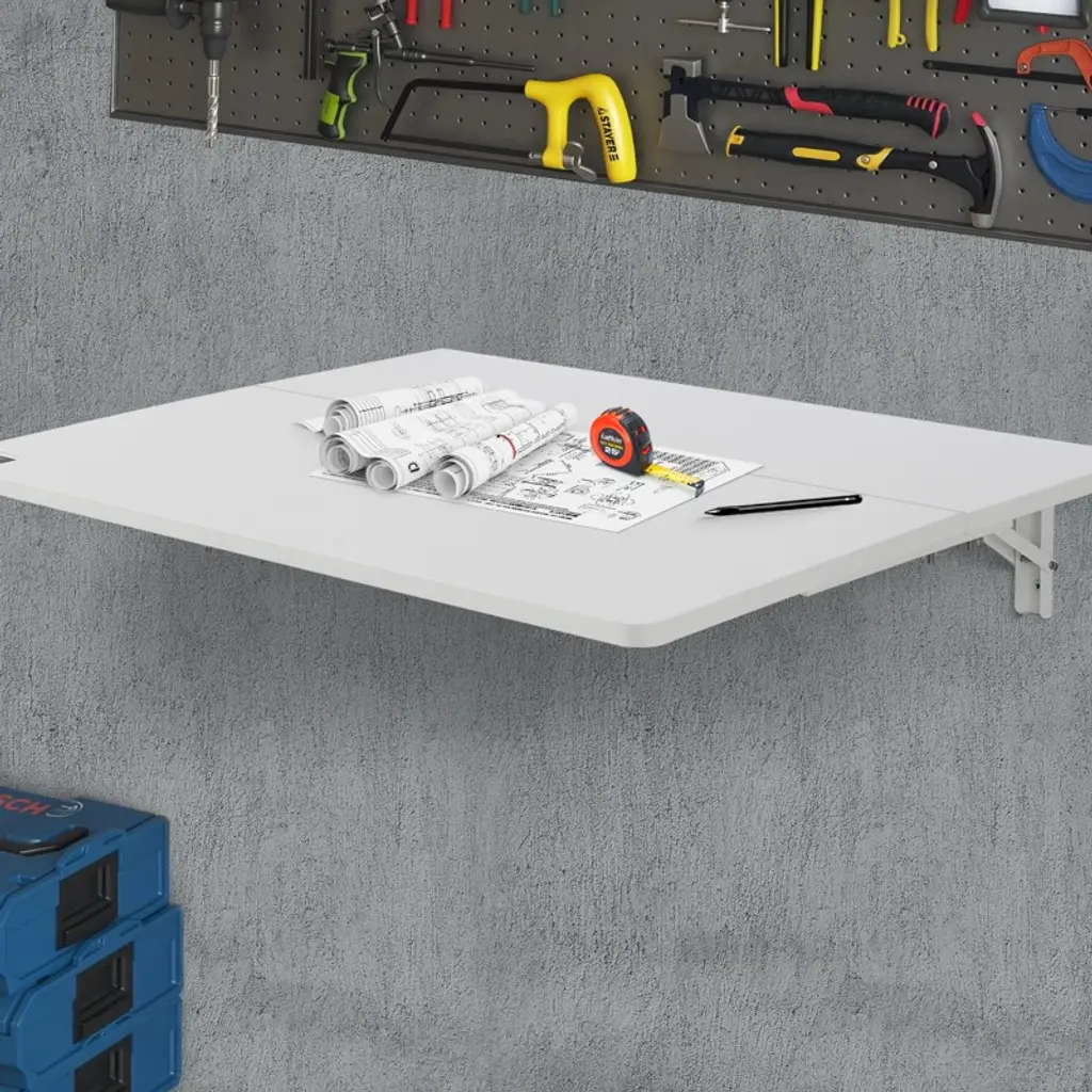 Feature: Slow-Closing Folding: Designed to save space, this wall mounted folding table folds and partially/fully unfolds quickly, ideal for small spaces. The slow-closing brackets prevent pinching during use, making it ultra-convenient for immediate use without the need for large reserved spaces—just unfold and start working or display items. 50 lbs High Load Capacity: Despite its compact size, this wall mounted desk holds up to 50 lbs thanks to its thick 0.63-inch material. It's stable for everything from small tools, large tools, laptops, and heavy books to decor items, ensuring everything stays steady. Easy Installation: Installing our wall mount folding table is a breeze with included installation positioning paper. Pre-marked installation positions on the template allow for quick hole drilling, ensuring a convenient installation process. Scratch-Resistant Design: Crafted from premium materials, this wall desk meets comprehensive environmental emission standards. Its rounded corner design reduces potential risks from collisions, enhancing security for you and your family. Versatile for Any Space: Whether it's your garage, workshop, tool room, home office, or kitchen, this floating desk fits right in. It helps you make the most of your space, keeping everything organized and efficient. Package Content: 1 x Wall Mounted Table
