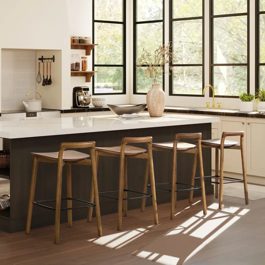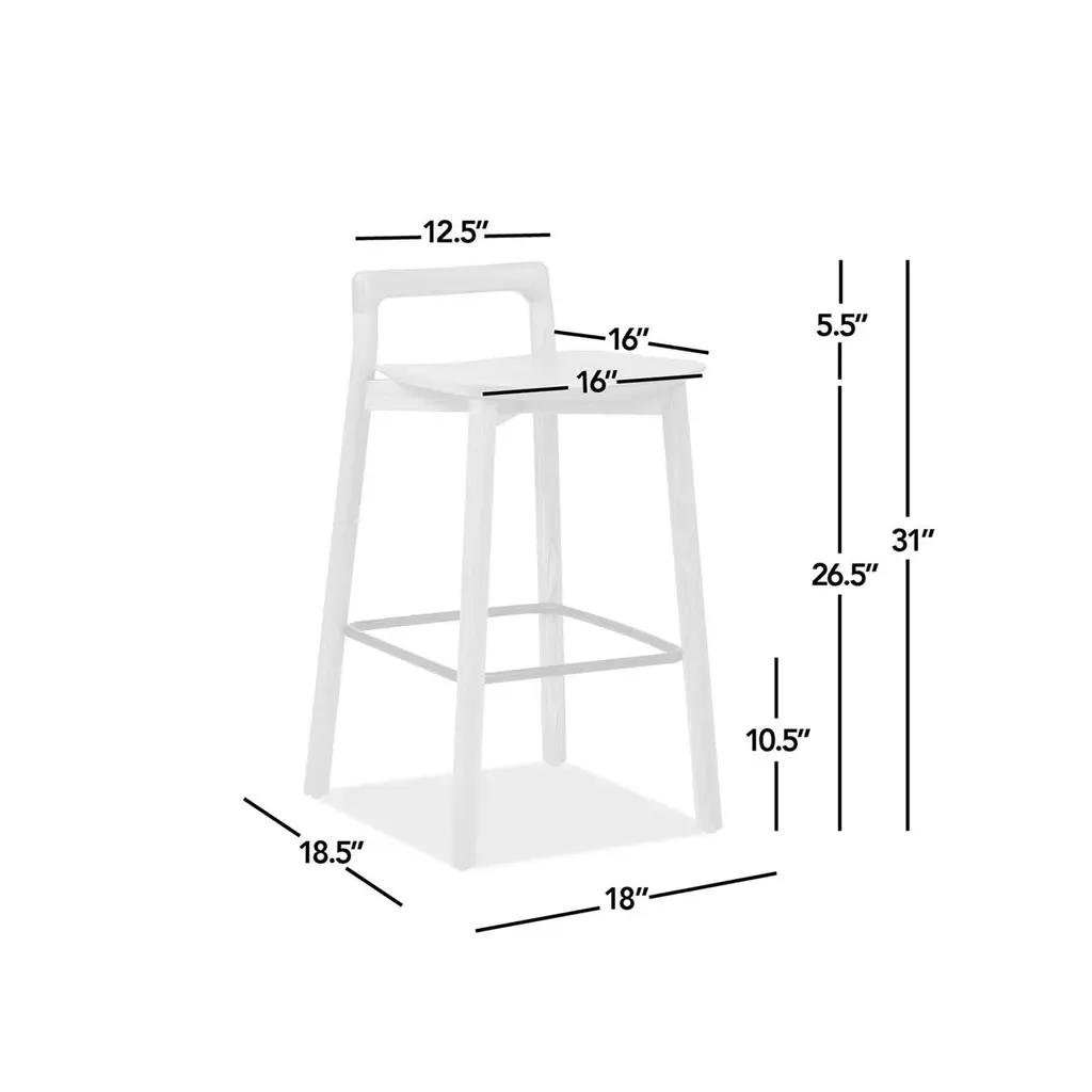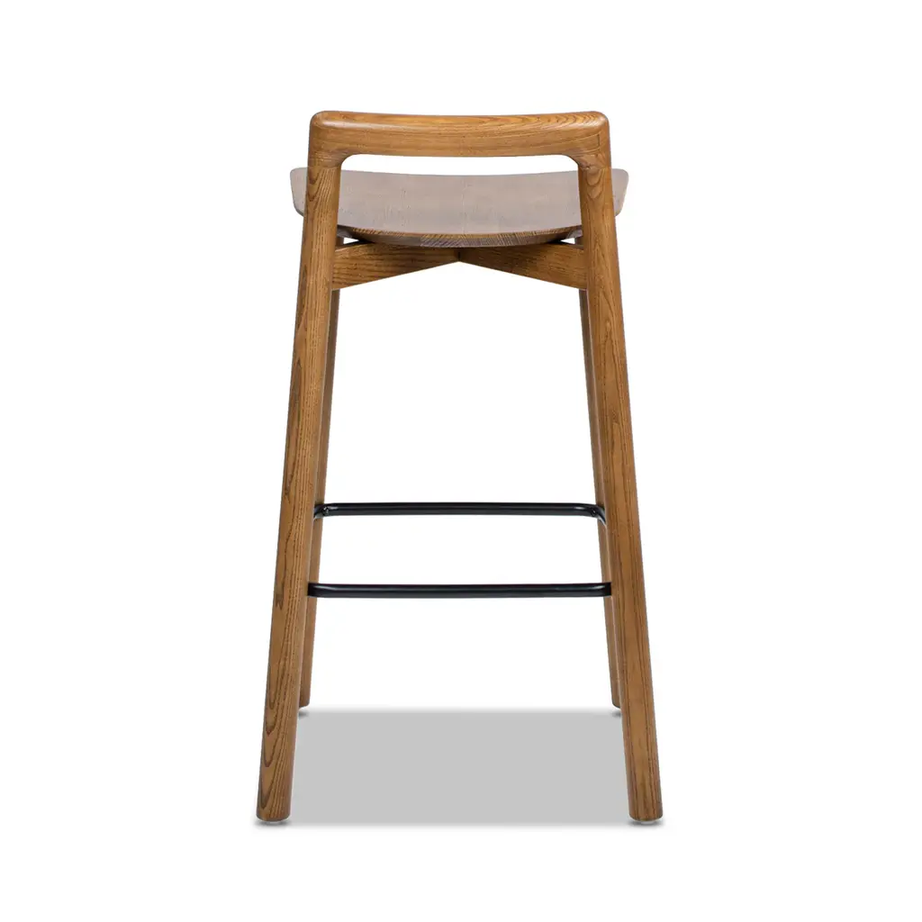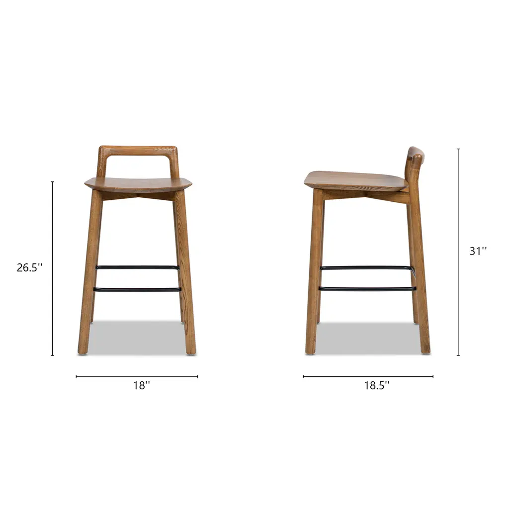 Enhance your counter space with this versatile counter stool, designed with the perfect seat height for kitchen islands and counter-height tables. Crafted from durable and eco-friendly ash wood, it combines strength with sustainability. The low, open back offers light support and doubles as a convenient handle for easy maneuverability. An ergonomic iron footrest and easy-to-clean wooden construction ensure lasting comfort and effortless maintenance