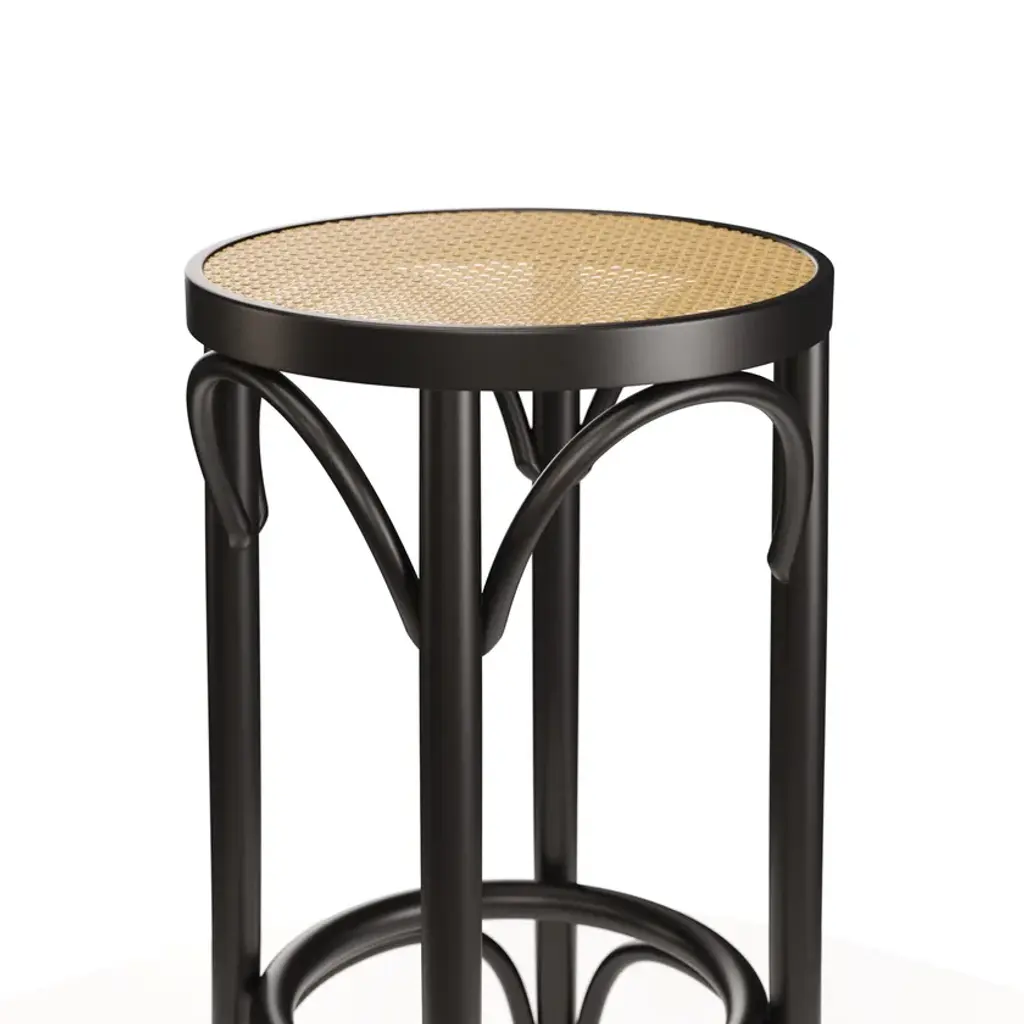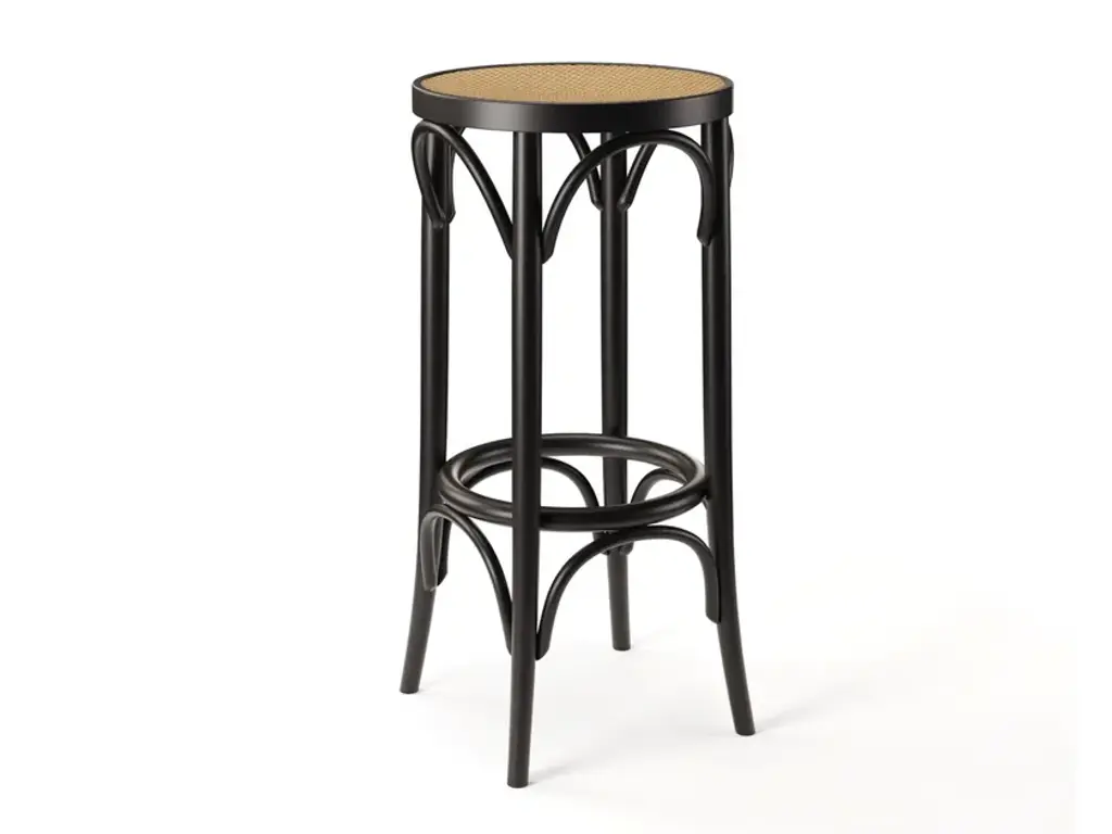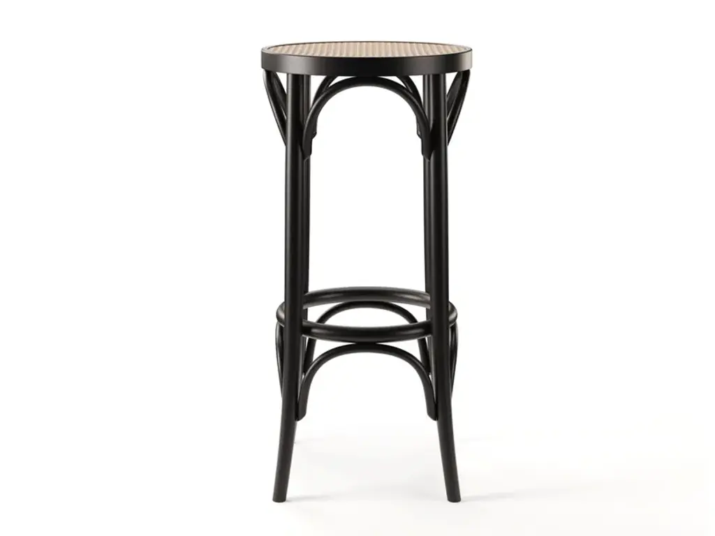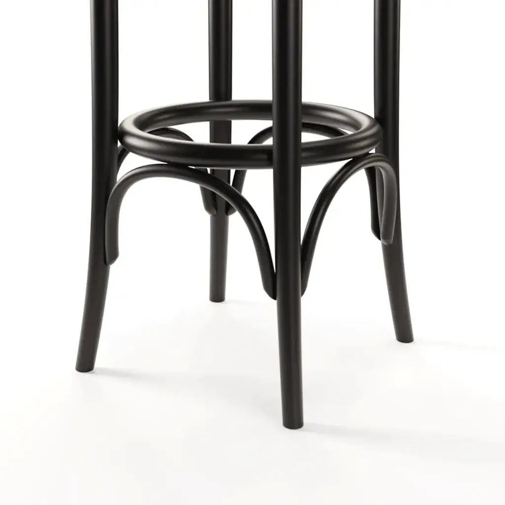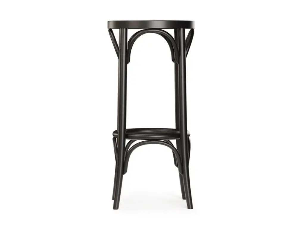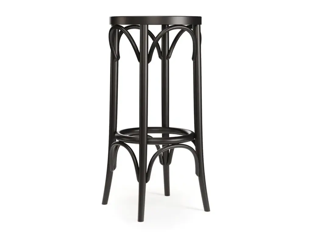This barstool without a backrest is decorated with eight manually bent beech leg joints, which are the distinctive feature of its classical look. The seat can be enhanced with decorative studs.