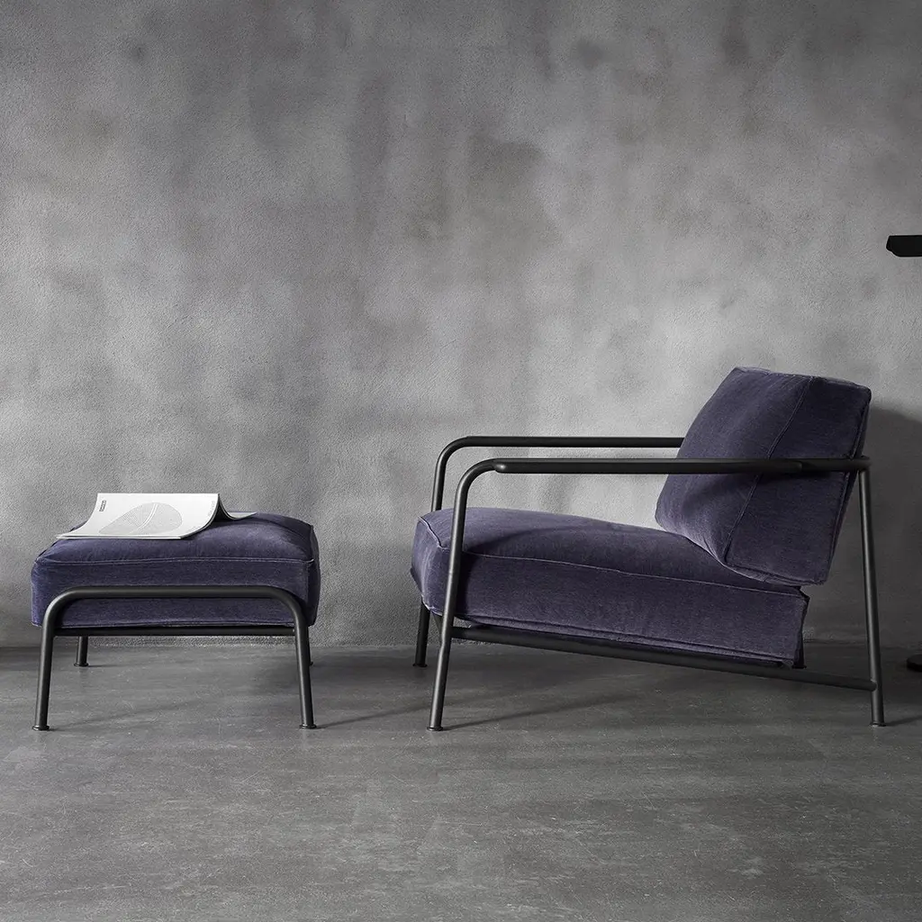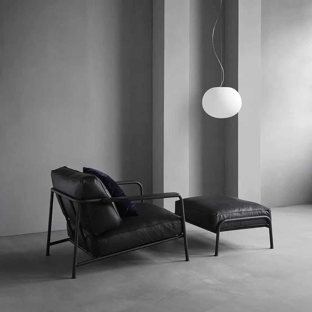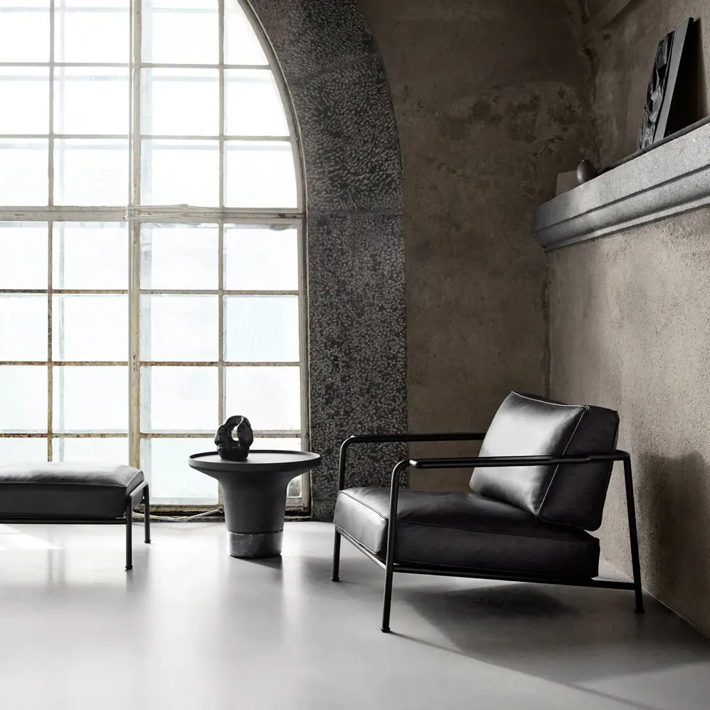The Aero Chair and Stool find their identity in the 20th-century design tradition interpreted through a modern scope. With a reference to past times when traveling was a luxury and with calm lines of upholstered precision, the Aero designs find themselves resting atop a tubular base of powder-coated steel. Lounge Chair sold separately.