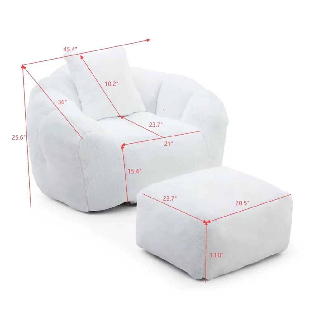 Airsurfer Giant Bean Bag Chair With Footstool, Stuffed Faux Fur Shell Design, Oversized Floor Sofa For Adults & Kids, White