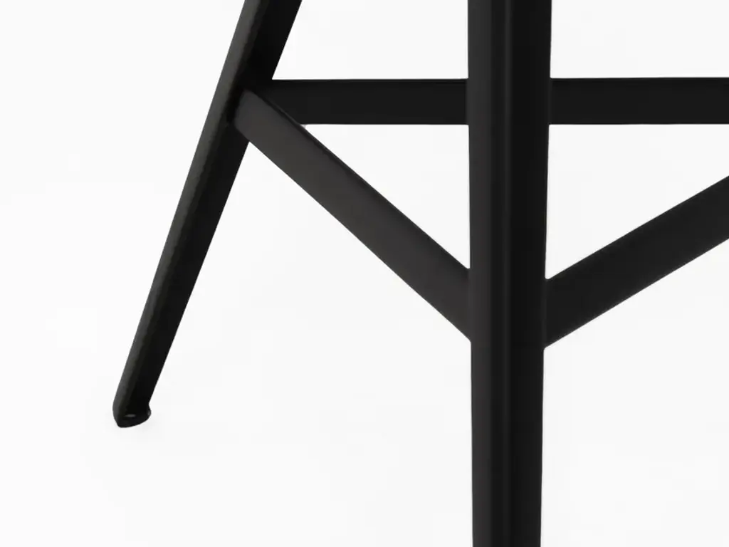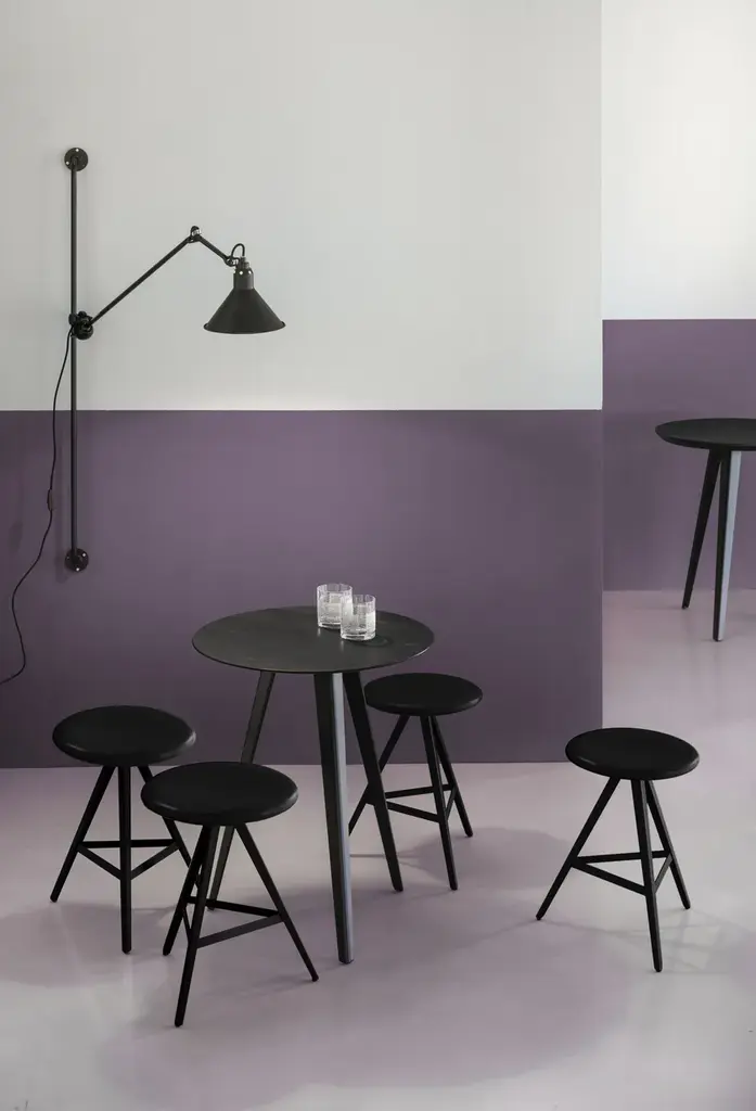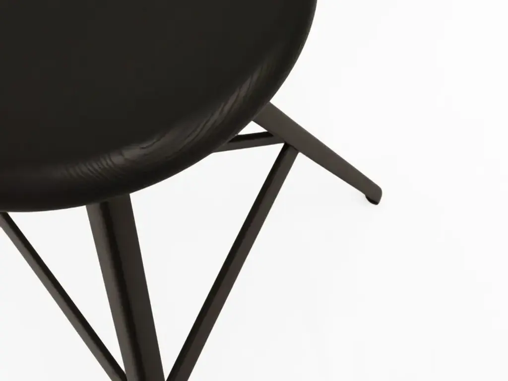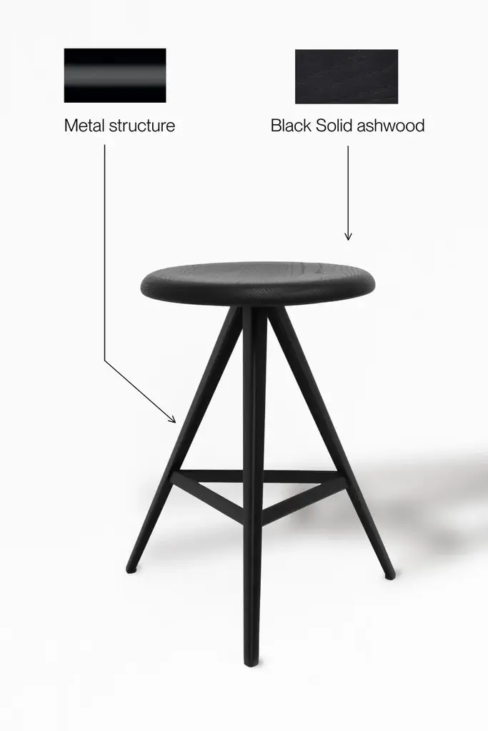 AKY STOOL 47 - LIMITED EDITION is a low stool with footrest.Made of a black metal frame and a seat in solid black ash.Low bar stool with painted metal structure and and ash massel seat or padded fabric seat from the AKY collection, designed by Emilio Nanni.