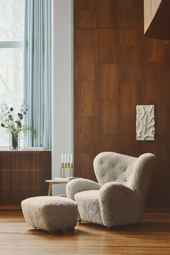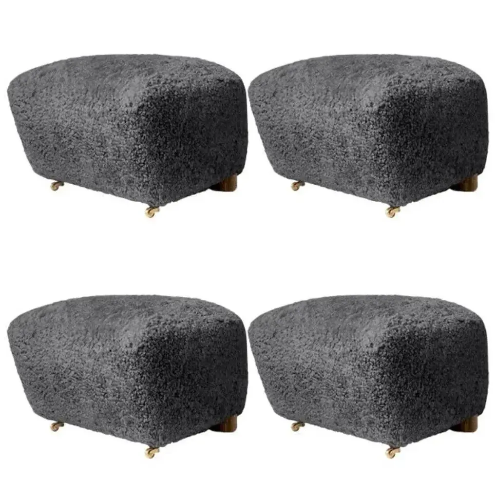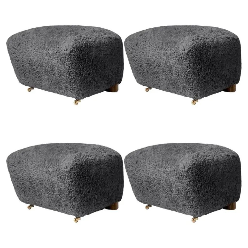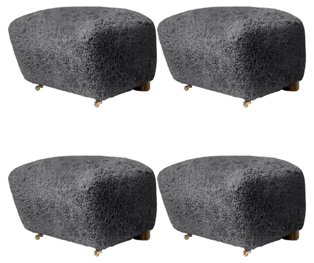 Set of 4 antrachite natural oak sheepskin the tired man footstools by Lassen. Dimensions: W 55 x D 53 x H 36 cm Materials: Sheepskin Flemming Lassen designed the overstuffed easy chair, the tired man, for The Copenhagen Cabinetmakers’ Guild Competition in 1935. It is characterised by organic, bearlike shapes and then as now it created a sensation with its curved form and voluminous armrests. Sitting in the chair should, in Flemming Lassen’s own ords, be ”as warm and safe as a polar bear cub in the arms of its mother in the middle of the ice cap”. The family man Flemming Lassen valued intimate relationships - with its warm exterior, The Tired Man invokes domestic cosiness and socialising by candlelight.