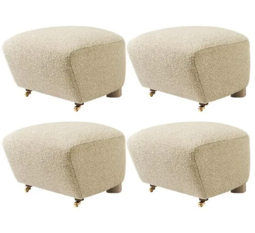 Set of 4 beige natural oak sahco zero the tired man footstool by Lassen. Dimensions: W 55 x D 53 x H 36 cm Materials: Textile Flemming Lassen designed the overstuffed easy chair, the tired man, for The Copenhagen Cabinetmakers’ Guild Competition in 1935. It is characterised by organic, bearlike shapes and then as now it created a sensation with its curved form and voluminous armrests. Sitting in the chair should, in Flemming Lassen’s own ords, be ”as warm and safe as a polar bear cub in the arms of its mother in the middle of the ice cap”. The family man Flemming Lassen valued intimate relationships - with its warm exterior, The Tired Man invokes domestic cosiness and socialising by candlelight. By Lassen is a Danish design brand focused on iconic designs created by Mogens and Flemming Lassen, founded by Lassens’ relatives in 2008.