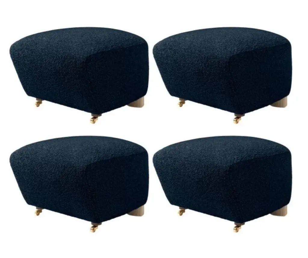 Set of 4 blue natural oak Sahco zero the tired man footstools by Lassen Dimensions: W 55 x D 53 x H 36 cm Materials: textile Flemming Lassen designed the overstuffed easy chair, The Tired Man, for The Copenhagen Cabinetmakers’ Guild Competition in 1935. It is characterised by organic, bearlike shapes and then as now it created a sensation with its curved form and voluminous armrests. Sitting in the chair should, in Flemming Lassen’s own ords, be ”as warm and safe as a polar bear cub in the arms of its mother in the middle of the ice cap”. The family man Flemming Lassen valued intimate relationships - with its warm exterior, The Tired Man invokes domestic cosiness and socialising by candlelight. By Lassen is a Danish design brand focused on iconic designs created by Mogens and Flemming Lassen, founded by Lassens’ relatives in 2008.