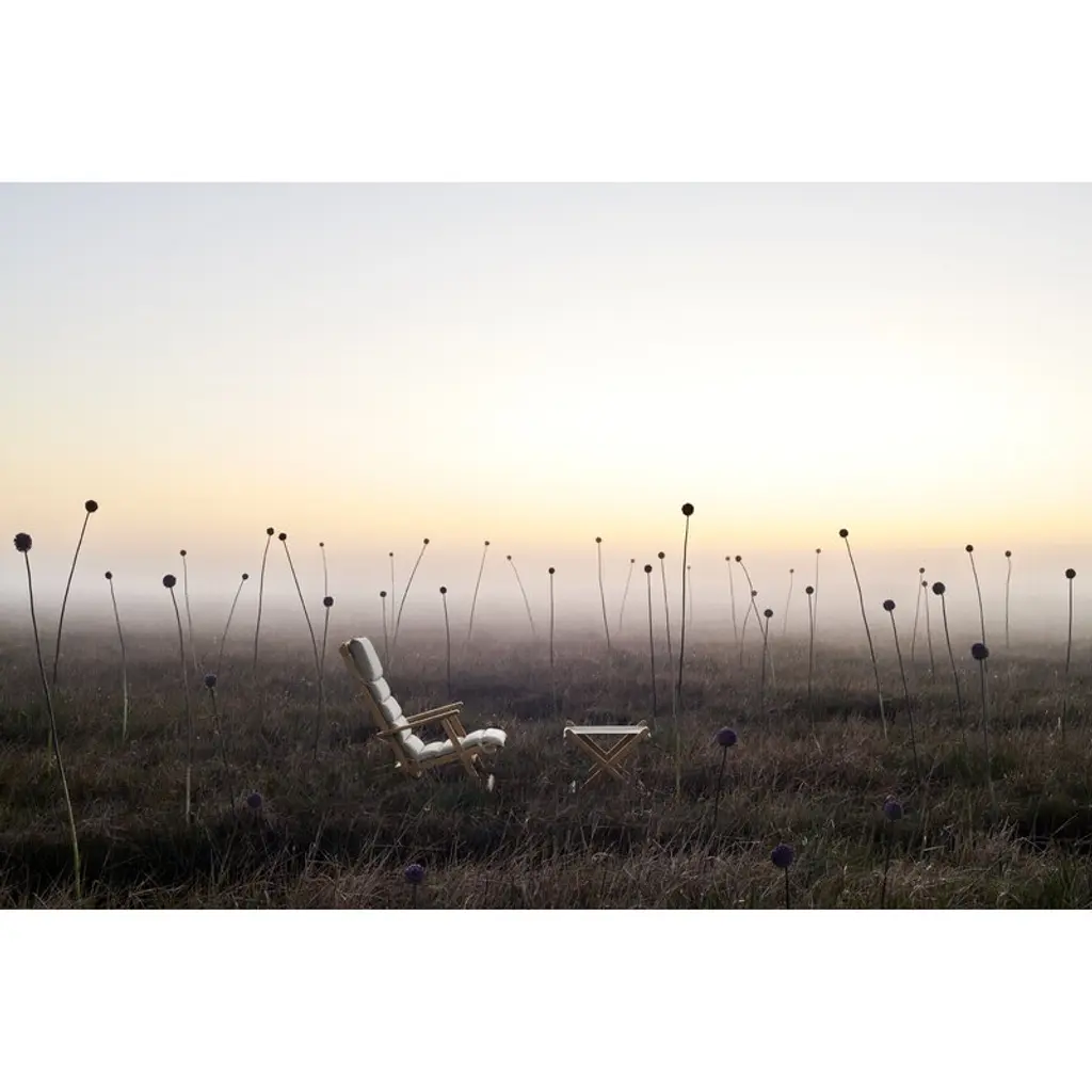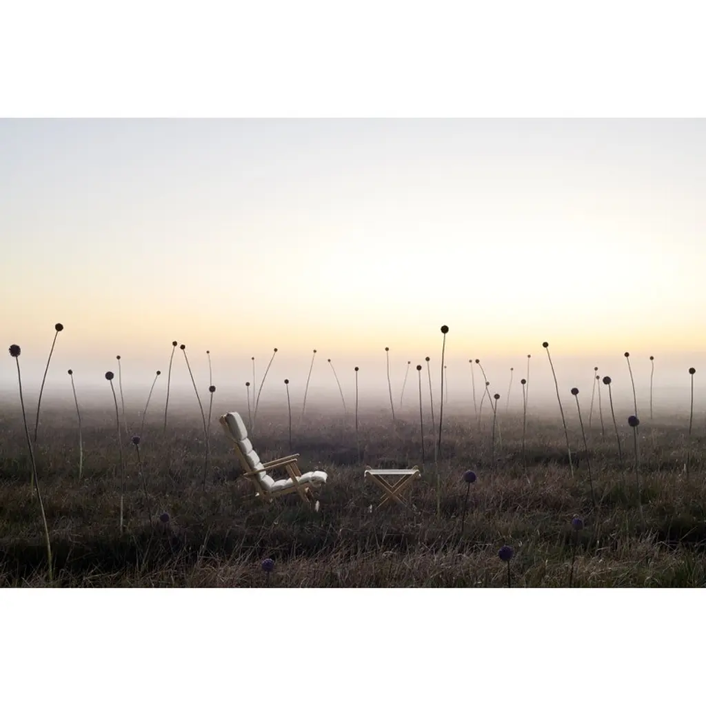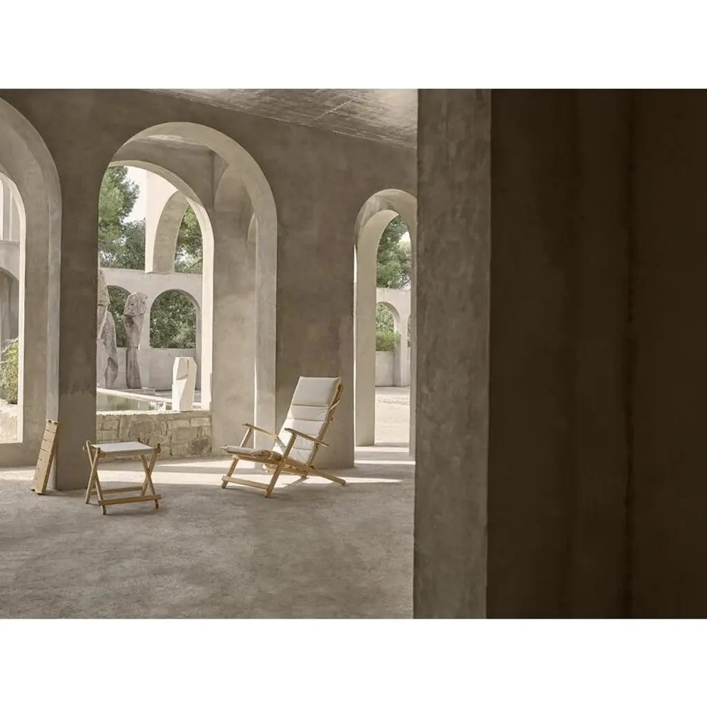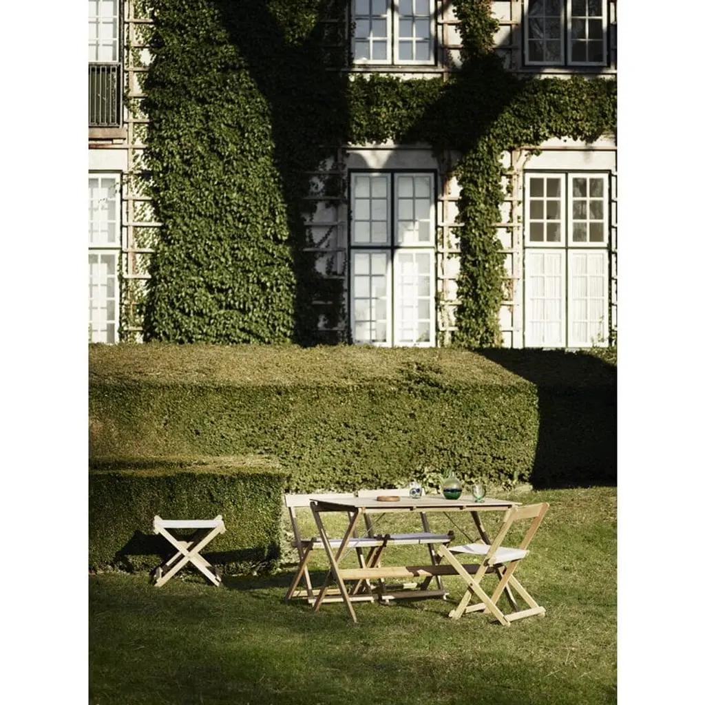 Carl Hansen & Søn's BM5768 footstool is part of Børge Mogensen's reinterpreted Deck Chair outdoor range, created by the legendary designer in the late 1960s. The sleek stool exudes the simple functionality of the Shaker style, and its minimalistic form captures the eye. Over the years, natural patina adds even more character to the piece as the teak frame turns a beautiful silver hue. The suspended seat is made from weatherproof marine canvas, giving the BM5768 stool a relaxed look and making it both comfortable and highly durable. An elegant nod to the laid-back esthetics of camping chairs, the BM5768 footstool makes a delightful companion to lounge chairs and armchairs but is also a charming addition to both the garden and the terrace as such. With the BM1069 tray, it is also possible to turn the versatile stool into a convenient serving table. The folding stool is also easy to store – the furniture in the collection can even be neatly hung on the wall using the wall-mounted BM527OS rack.