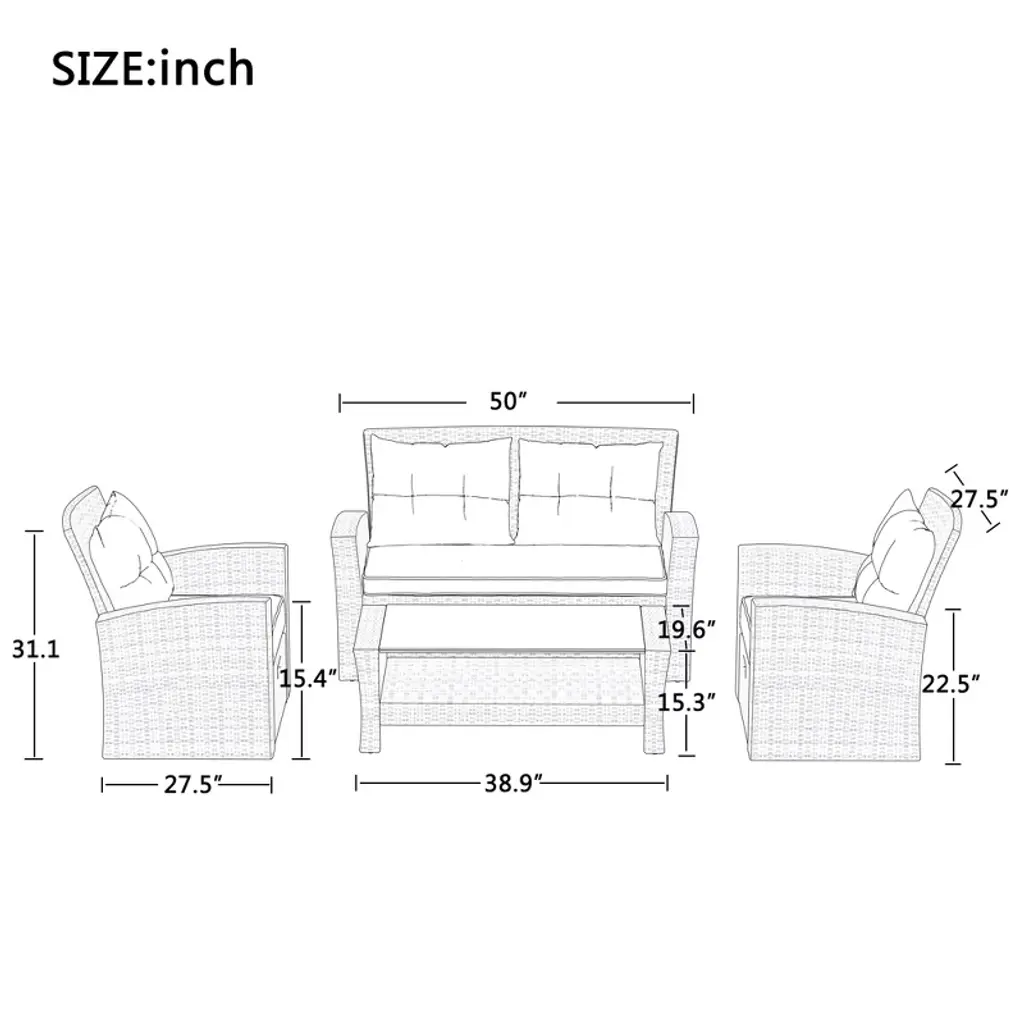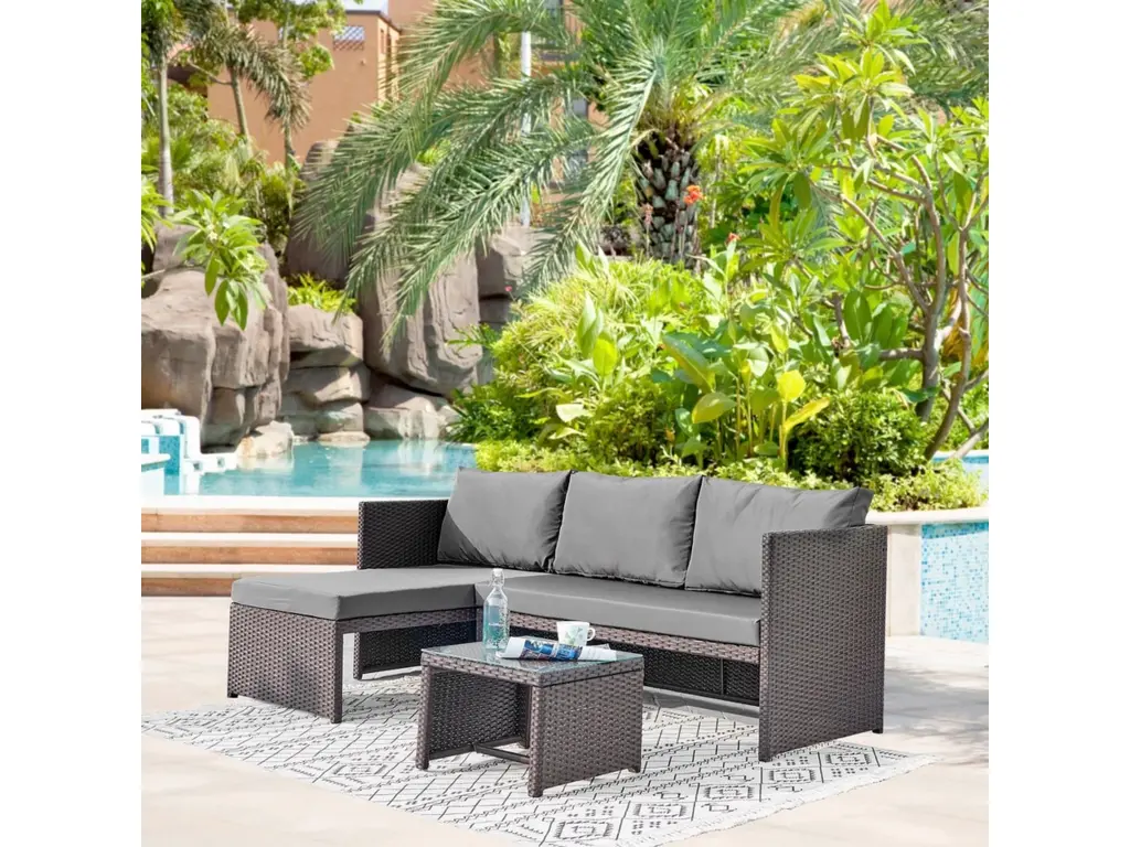 Elevate outdoor living with furniture that marries style and resilience. The weatherproof rattan weave adds natural charm while standing up to harsh elements, paired with plush cushions that cradle your body for all-day comfort. A coordinating coffee table creates the perfect hub for gatherings or solo relaxation. Designed for effortless assembly and lasting beauty, this set maintains its fresh look through sun showers and summer heat – your go-to solution for creating a cozy, inviting outdoor retreat.