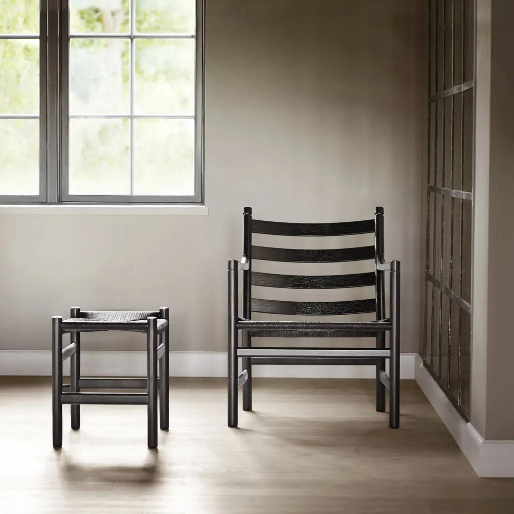 Exploring the commonality between the spare Shaker style and Danish simplicity, Hans J. Wegner's 1960s series boasts a rich solid hardwood lounge chair and accompanying footstool. Exactingly crafted in solid oak with a number of finish choices, the pieces feature the designer's preference for visible joinery that is as much a mark of finesse as it is of sturdy construction. CH44 exudes comfort with its angled and curved backrest and both the chair and stool have handwoven paper cord seats in natural or black.