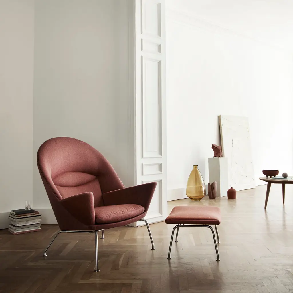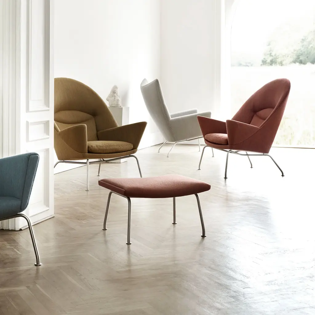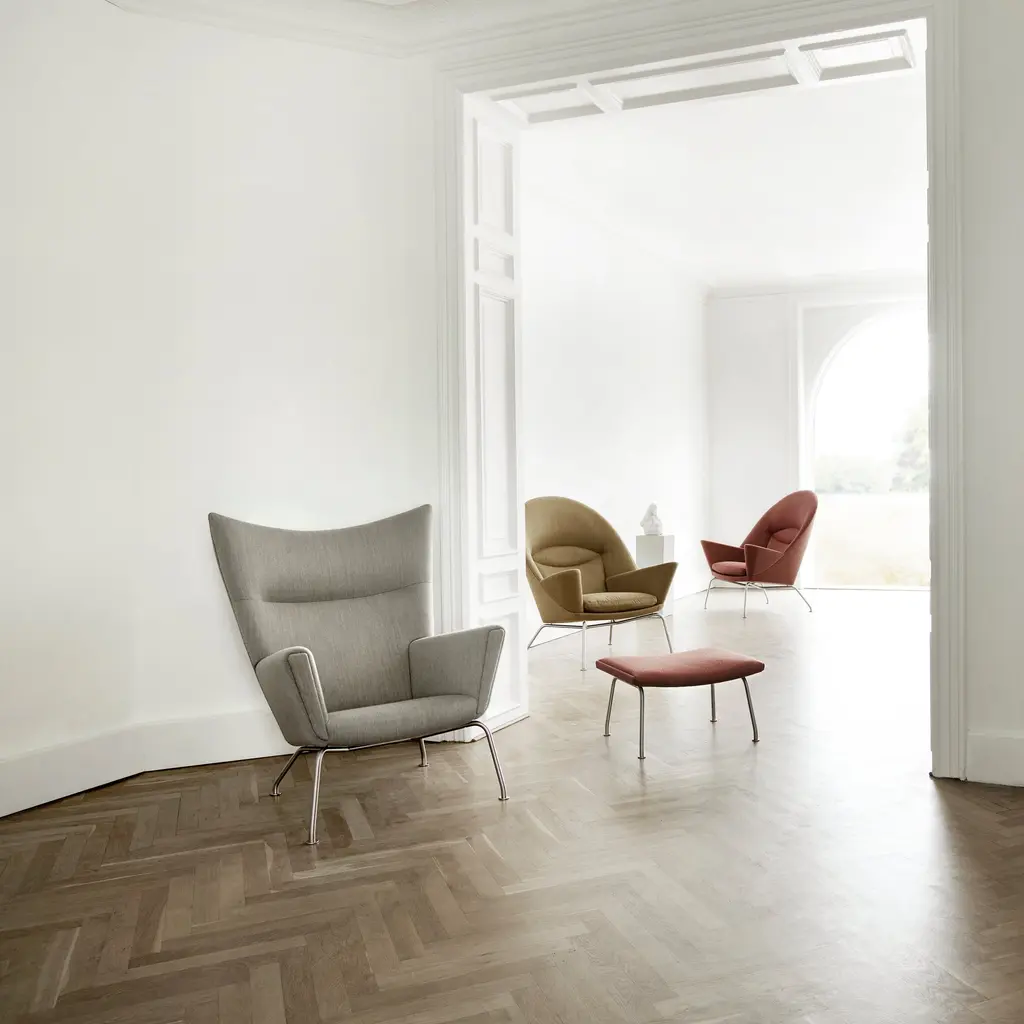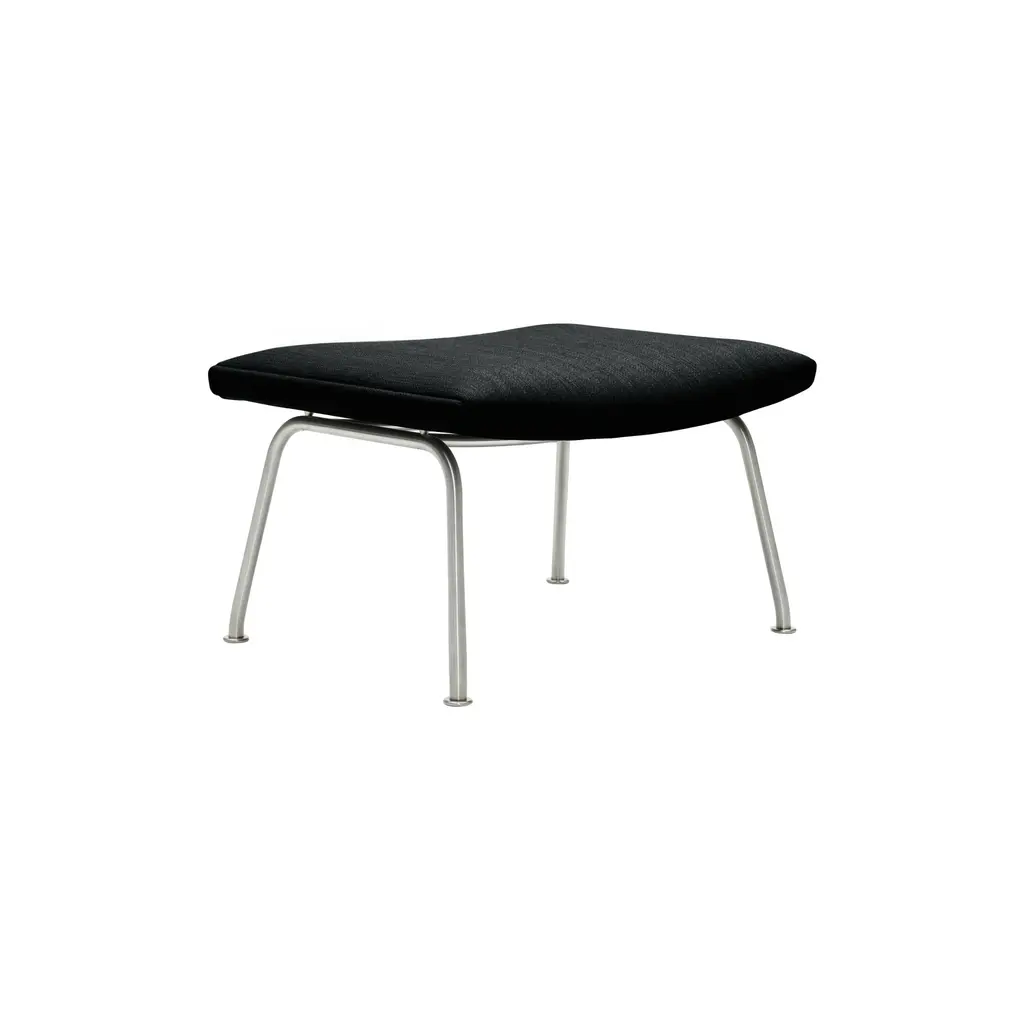 Hans J. Wegner designed this sleek footrest as an obvious match to his iconic CH445 Wing Chair and CH468 Oculus Chair (also at A+R). CH446 Footstool works equally well on its own or in groups, sturdily constructed with a solid beech frame and stainless steel legs that nonetheless impart a light appearance. Debuting in 1960 along with the iconic seating, it's available upholstered in either a fine fabric or leather selection from Danish maker Carl Hansen & Søn.