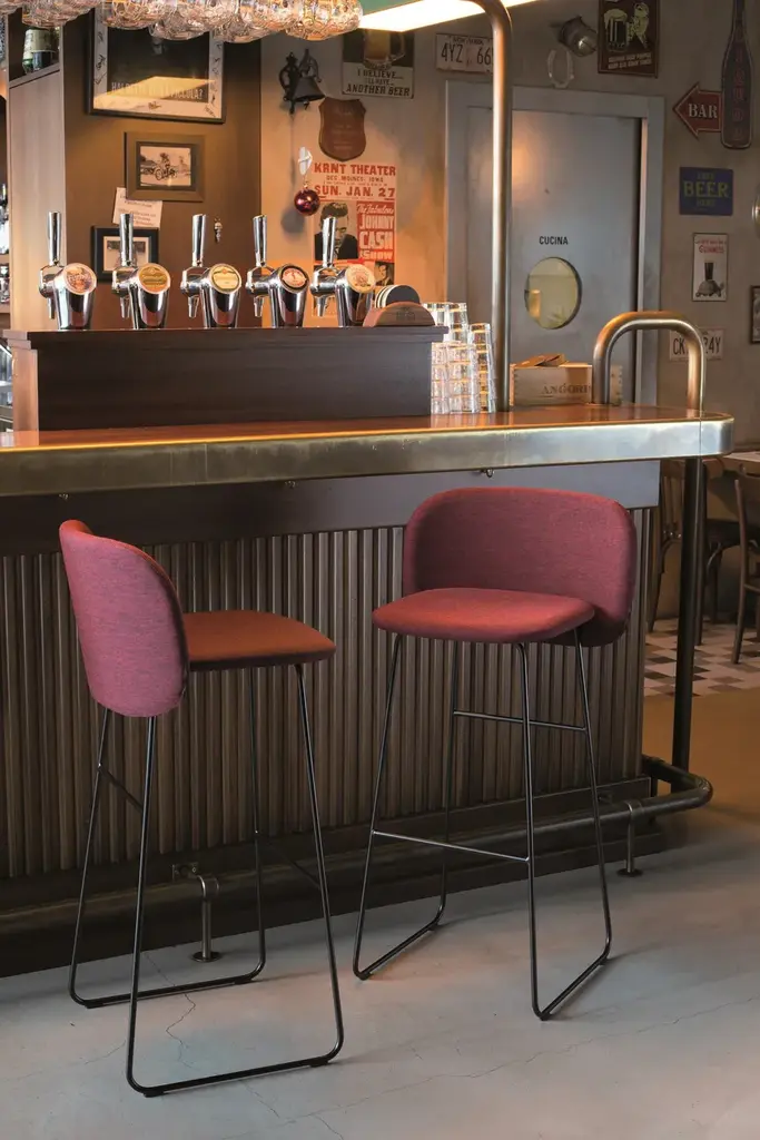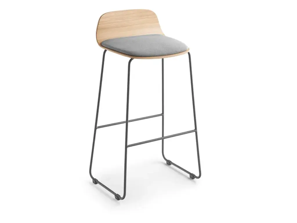 Seat with upholstered ply wood shell and black painted sled metal frame.The new Chips collection created by Studio Pastina is a ironic line of chairs and barstools characterised by their sail-shaped back and innovative use of bright, vividly colored technical fabric and velvet.Upholstered plywood shell and painted metal frame.