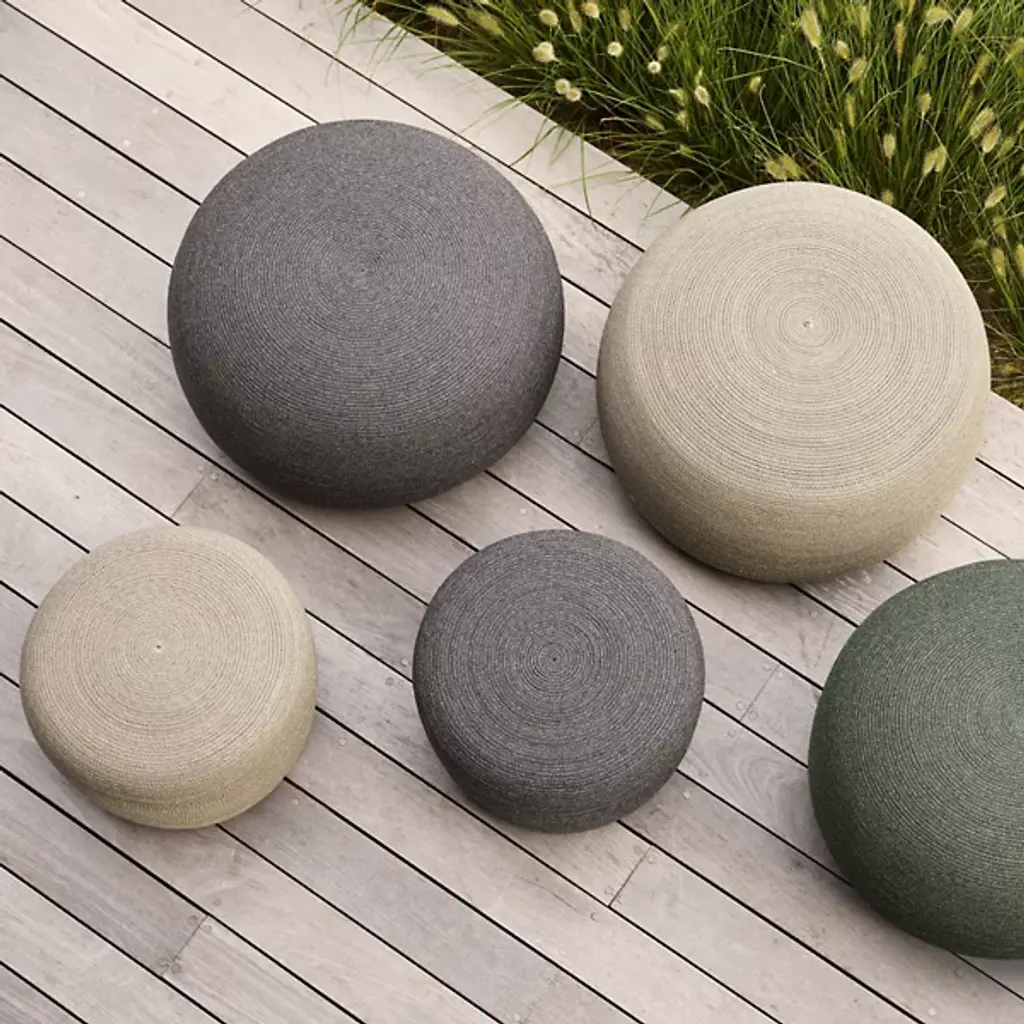 Tranquility is in store with the soft, pebble-like form of the Circle Footstool from Cane-line. It’s a calming presence inside or outside. The footstool presents itself with a neutral color that matches a range of furnishings and decor. Layered Cane-line rope gives it its luscious curves. The crevices in between the rope help keep it dry. This rope’s radiating pattern catches the eyes and feels good against one’s skin through its textured quality.