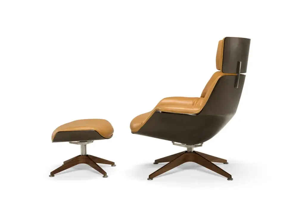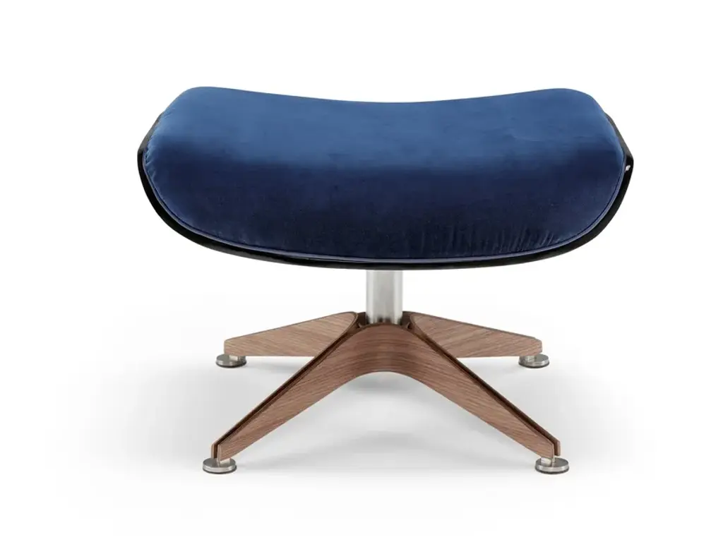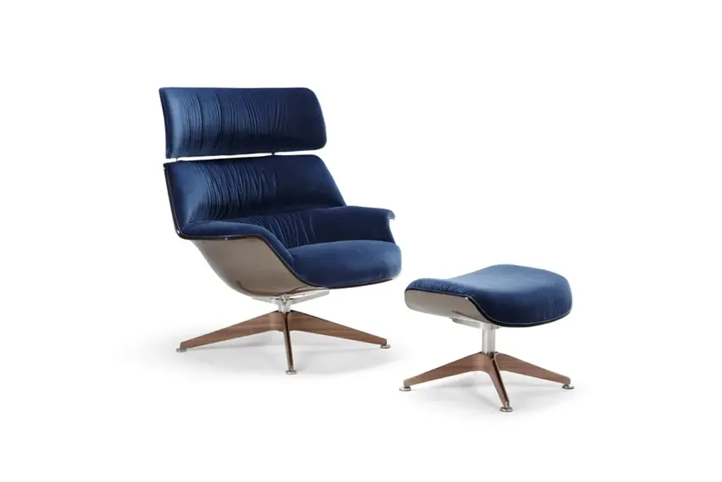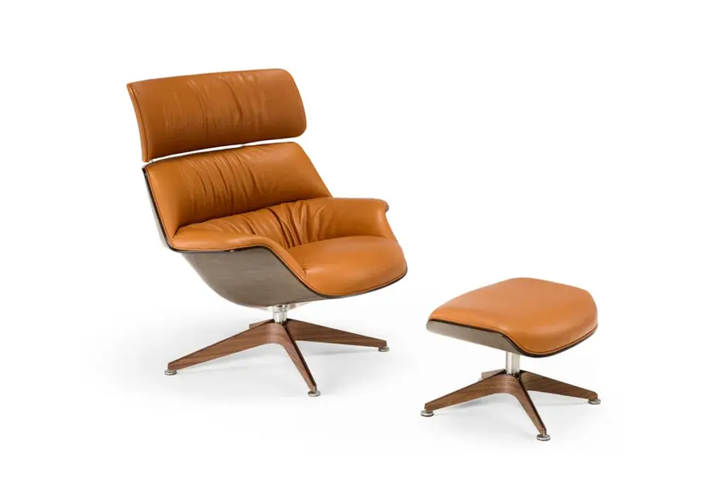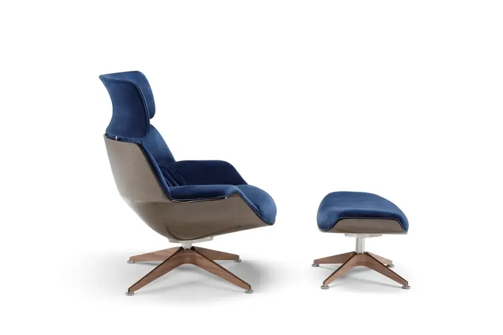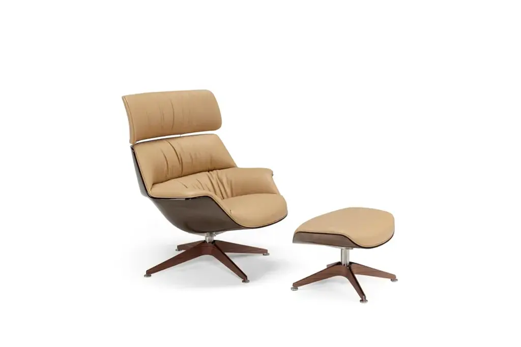 COACH is a comfortable and generous armchair, characterized by soft and enveloping lines. The shell-shaped structure in linen composite welcomes the seat and the wide backrest upholstered in leather or fabric to offer maximum comfort.The base is available in two variants: a light and discreet structure in brushed stainless steel, or an elegant star base in brushed stainless steel and walnut wood. For a total relaxation experience, COACH is also available in the version with headrest and accompanied by a padded pouf