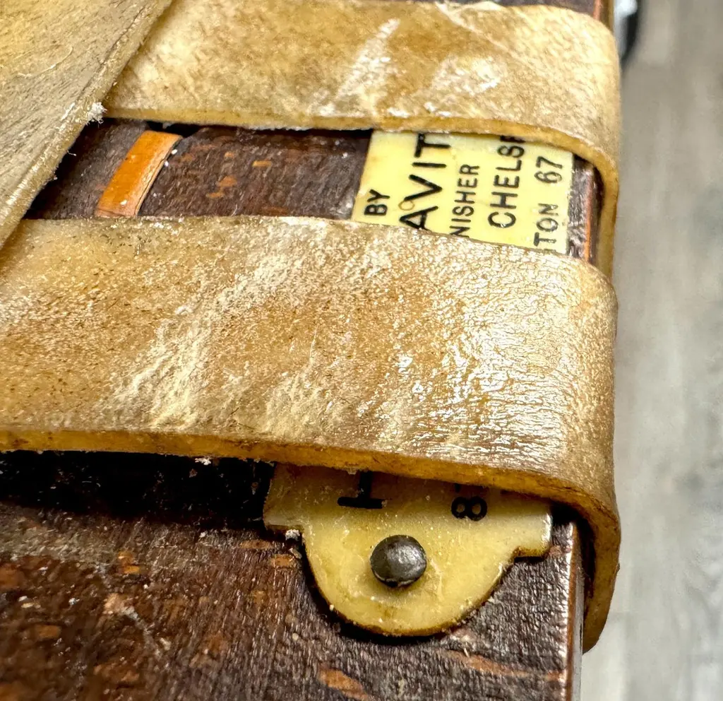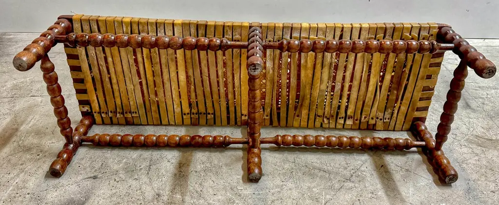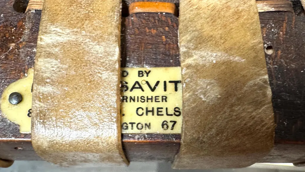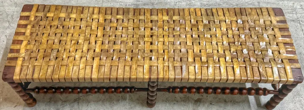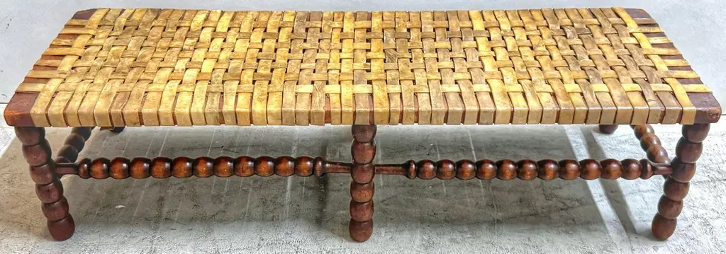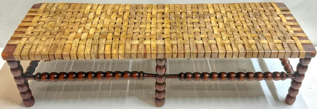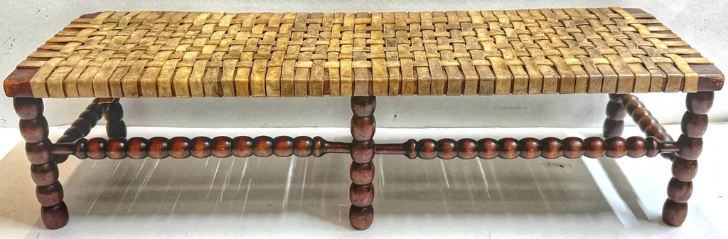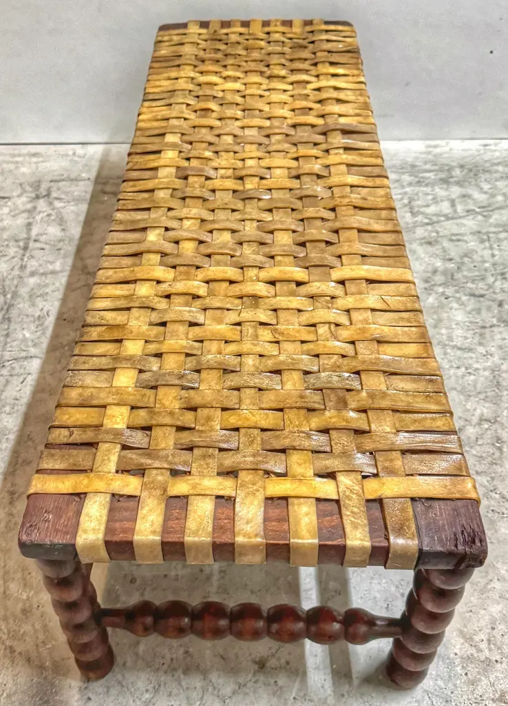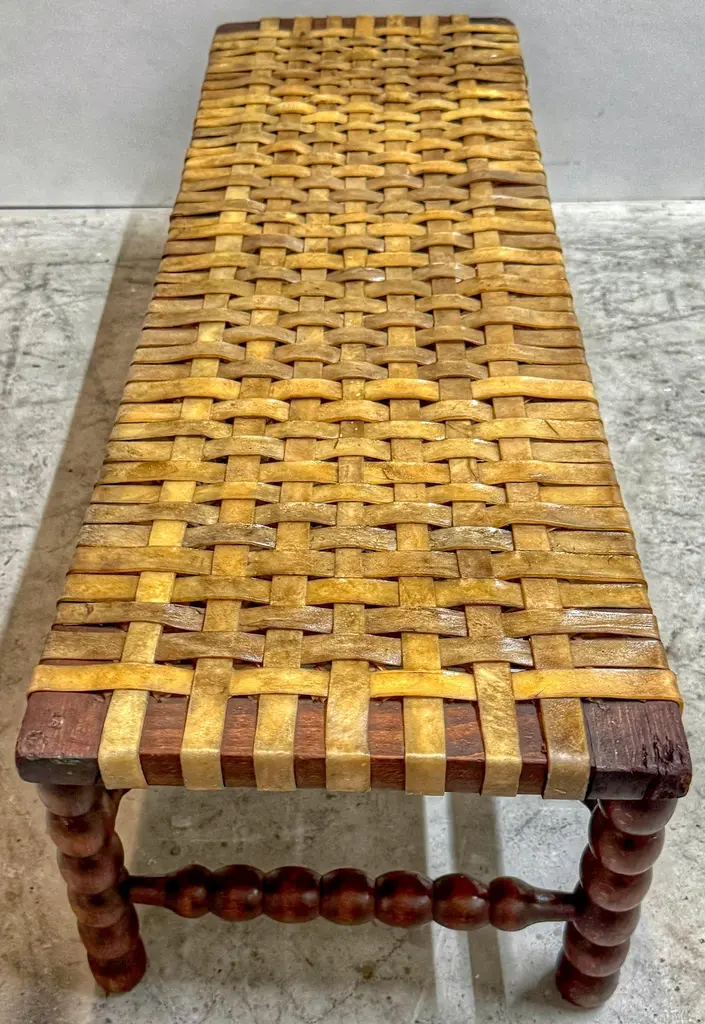 Early 19th Century English Bobbin-Leg Footstool or Low Bench with Woven Rawhide Seat, Savit of ChelseaAn early 19th-century English footstool or low bench featuring finely turned spool—or bobbin—legs and stretchers, a decorative technique characterized by rhythmic, rounded beads resembling wooden thread spools. This turning style, popular in provincial Georgian and early Victorian furniture, offered both visual interest and structural integrity.Unusually wide for its height, the bench measures 36" W x 12" D x just 9" H—proportions that suggest it was intended for use at the base of a low dressing table, in a bedchamber, or as a fireside footrest shared by more than one person. Its extended length and low stance also make it ideal today as a platform for displaying textiles, stacked books, or baskets in an entryway, dressing room, or under a console.Originally fitted with a caned seat, it was professionally re-strapped in the late 19th C. / early 20th century with thick, hand-cut rawhide woven in a wide checker pattern—an update likely driven by durability needs while preserving its rustic appeal. A surviving label from Savit, Furnisher, Chelsea, a known early 20th-century London upholsterer, adds historical context and provenance.Decorative, sculptural, and highly functional—this is a rare and characterful example of English country house furniture with enduring versatility.