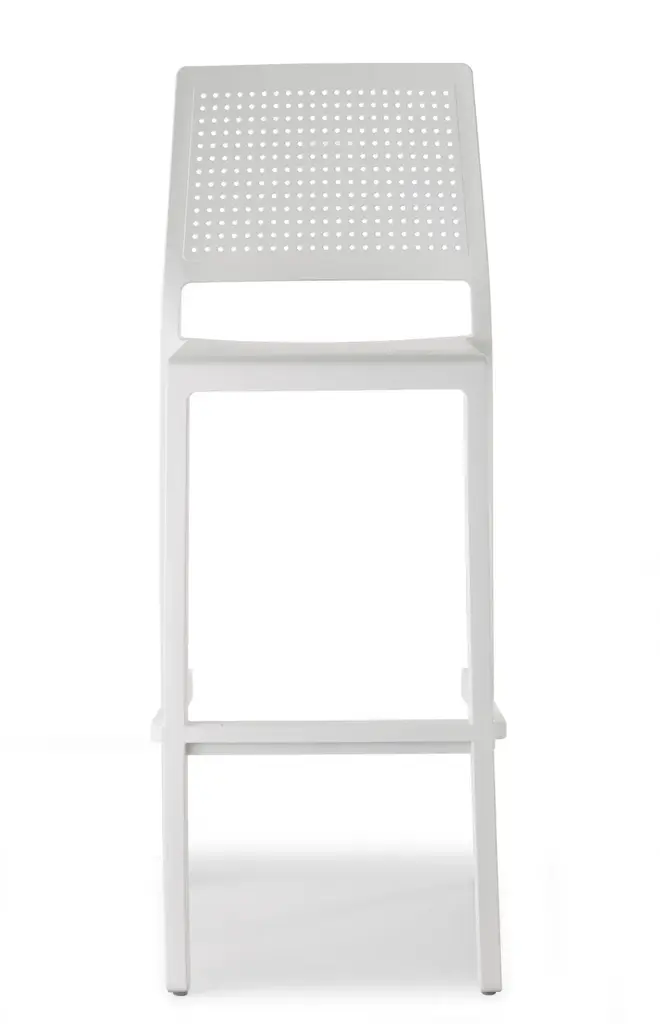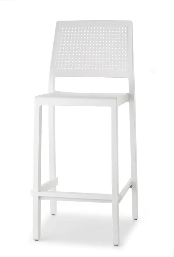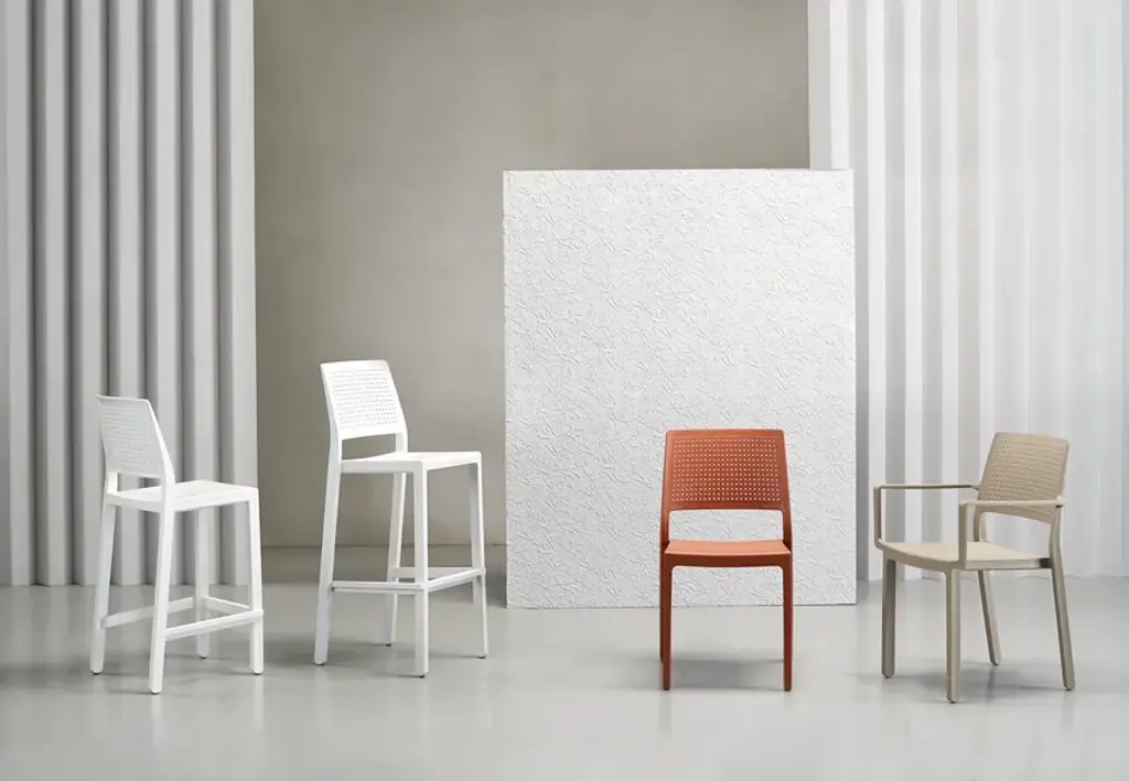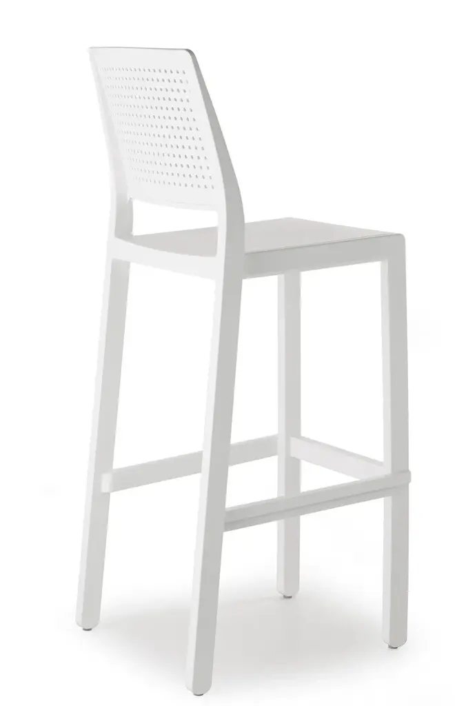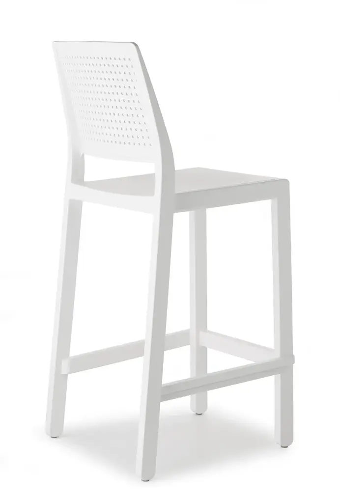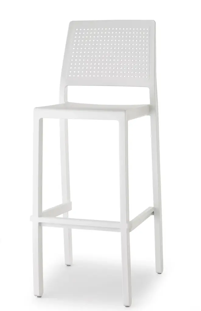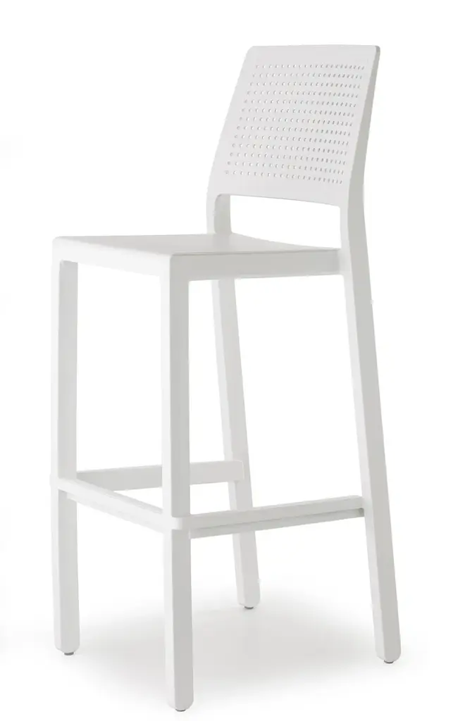 With a traditional look patterned with small holes, offered in two heights and a wide range of colours, the barstool version completes the Emi family. Easily stackable, it is a versatile solution for outdoor environments, such as beach bars and outdoor tall tables.