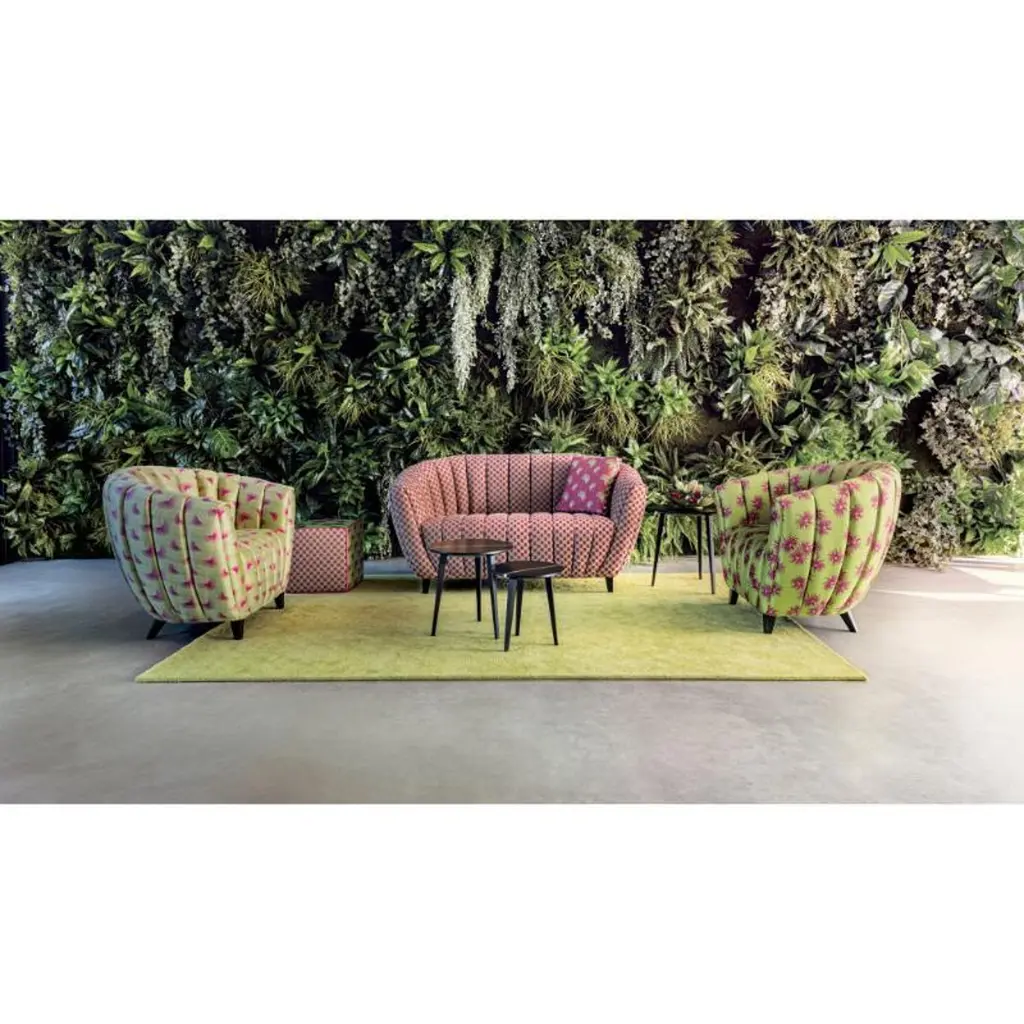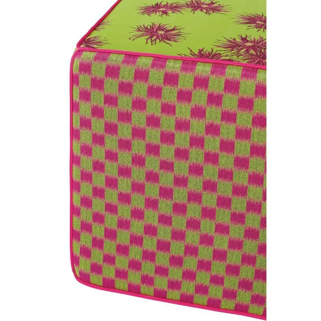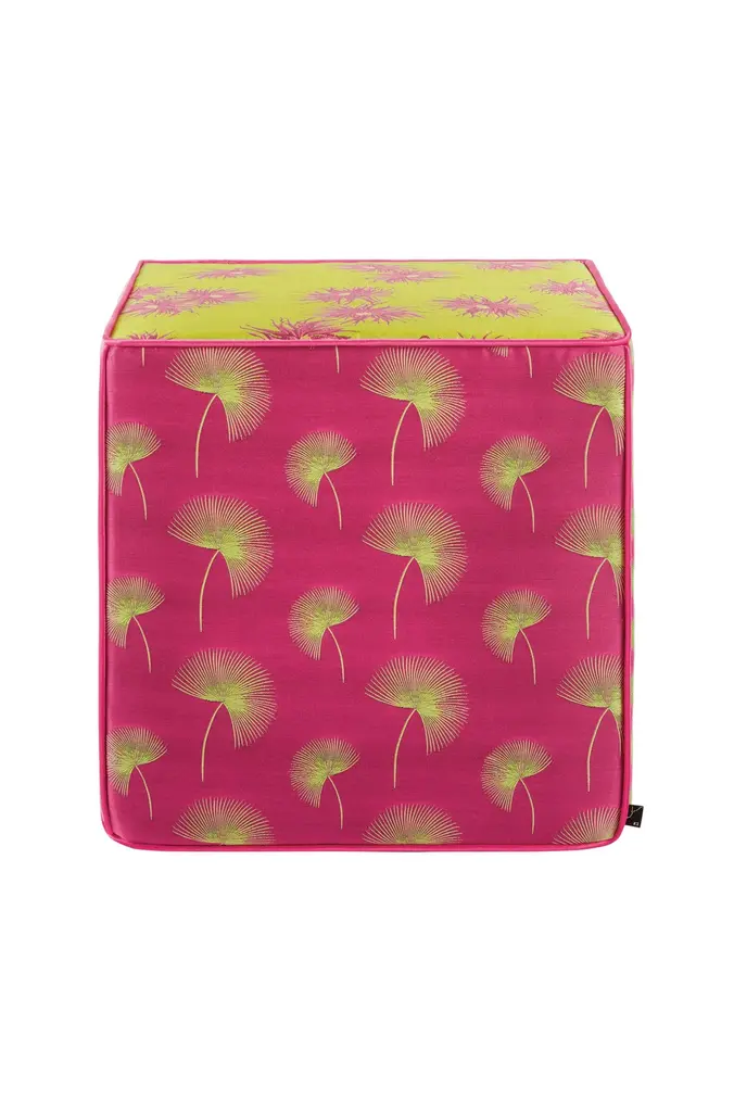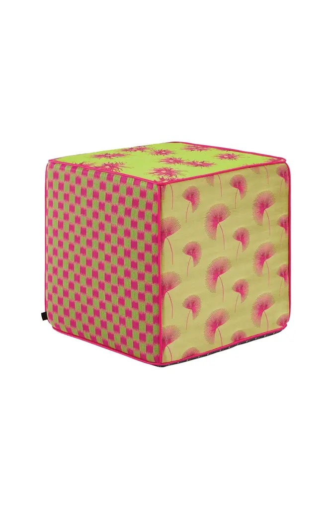 This is a jacquard cube pouf, seat in vibrant pink and green tones. Each edge of the pouf is divided by thin, gold sateen piping. The different patterns on the sides of the pouf are beautifully designed with large florals, chic leaf patterns in inverted tones, and a stylish geometric motif.